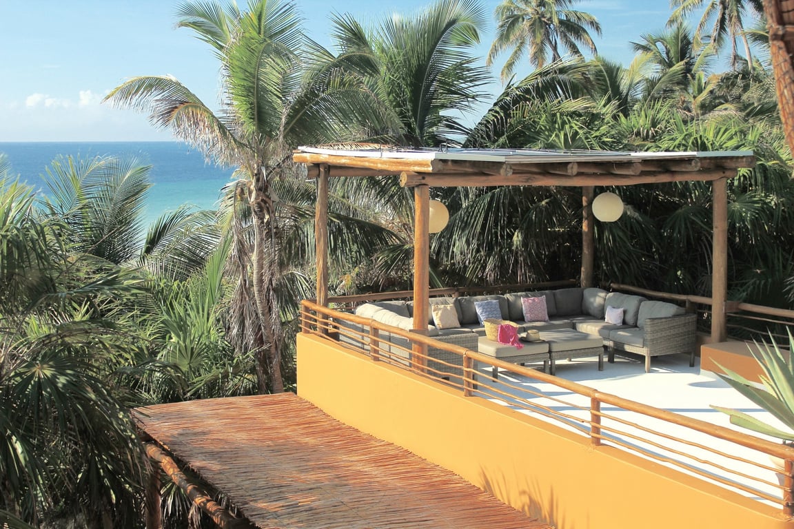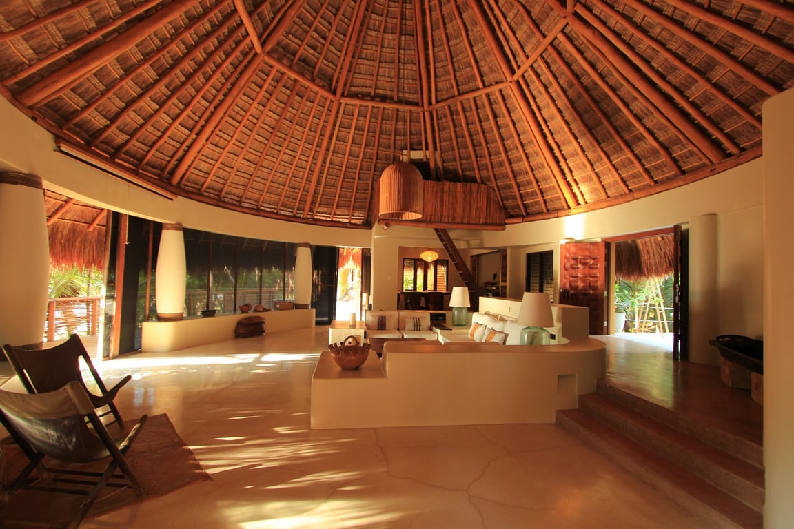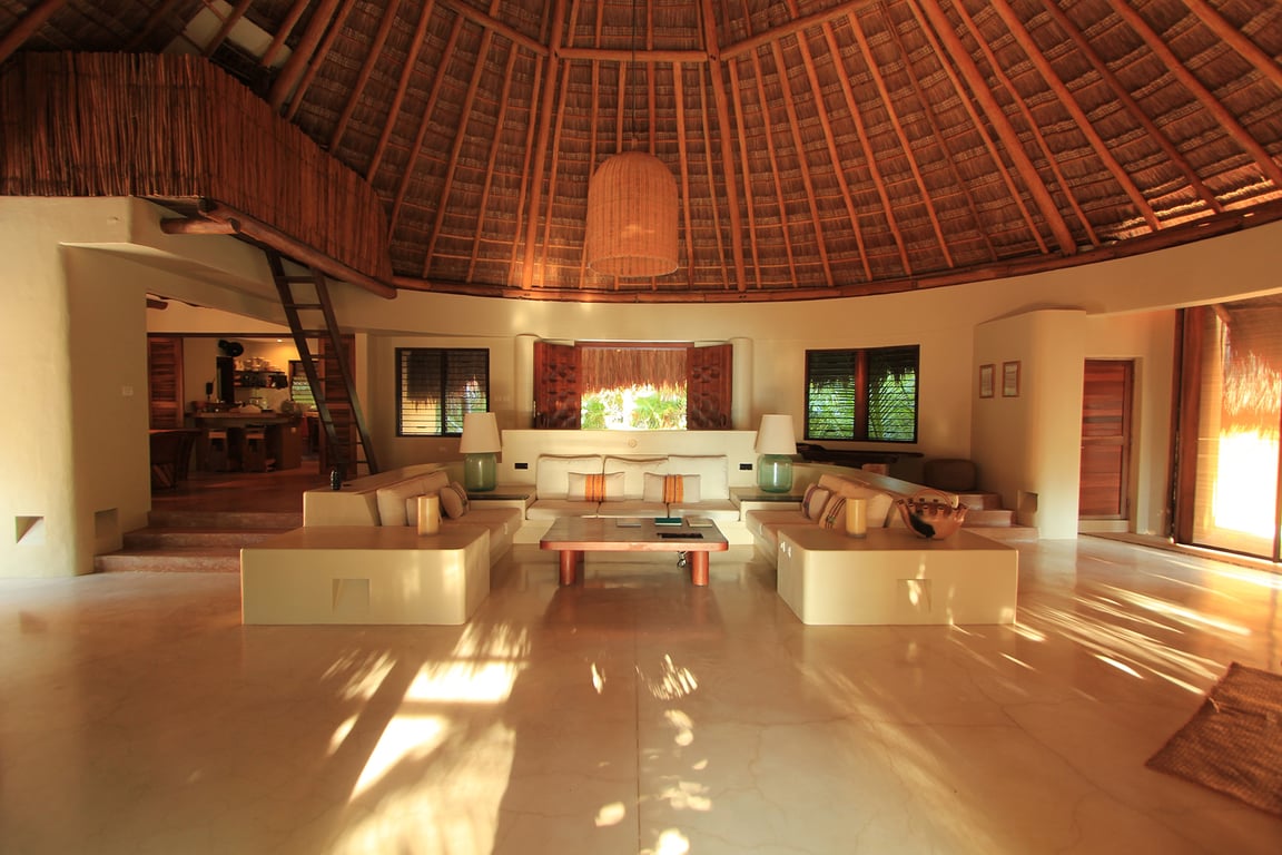 This exceptional property redefines sustainable luxury living. Designed with Mayan-contemporary architecture, the villa achieves complete energy independence through solar and wind power, complemented by an ultra-silent backup generator, making it a zero-carbon residence. Yet every modern amenity awaits: air conditioning throughout all five bedrooms, a spectacular 120-inch cinema projection system, SKY television, and high-speed internet. The grand palapa-crowned living area serves as the heart of the home, flowing seamlessly into a fully equipped gourmet kitchen and expansive terraces that blur the boundaries between indoor and outdoor living.