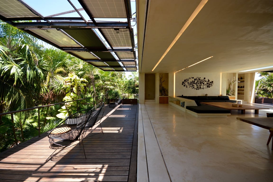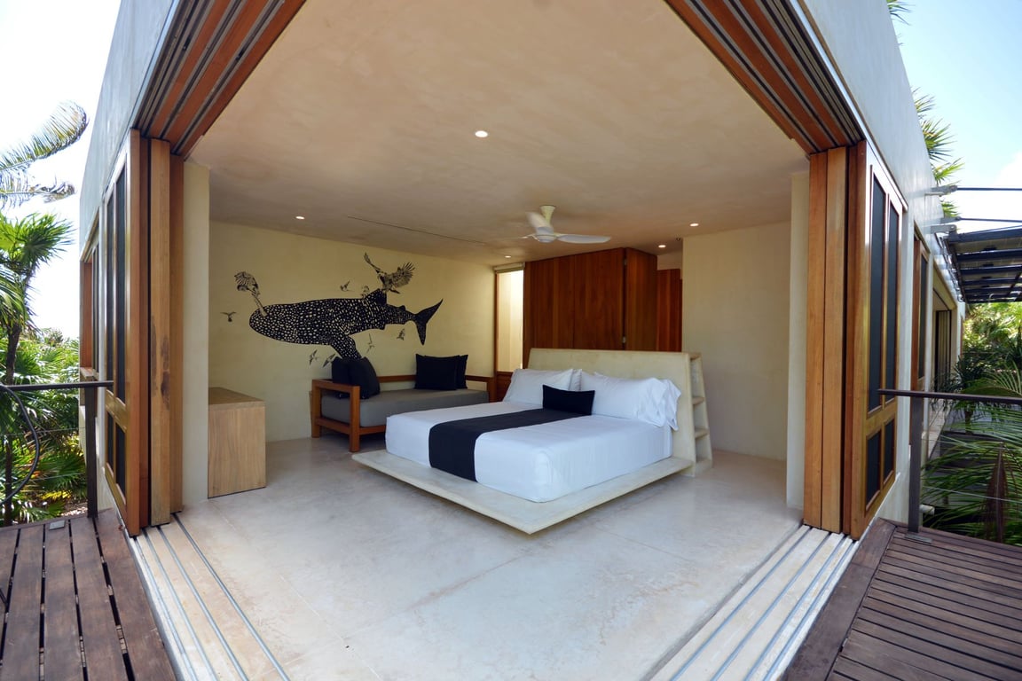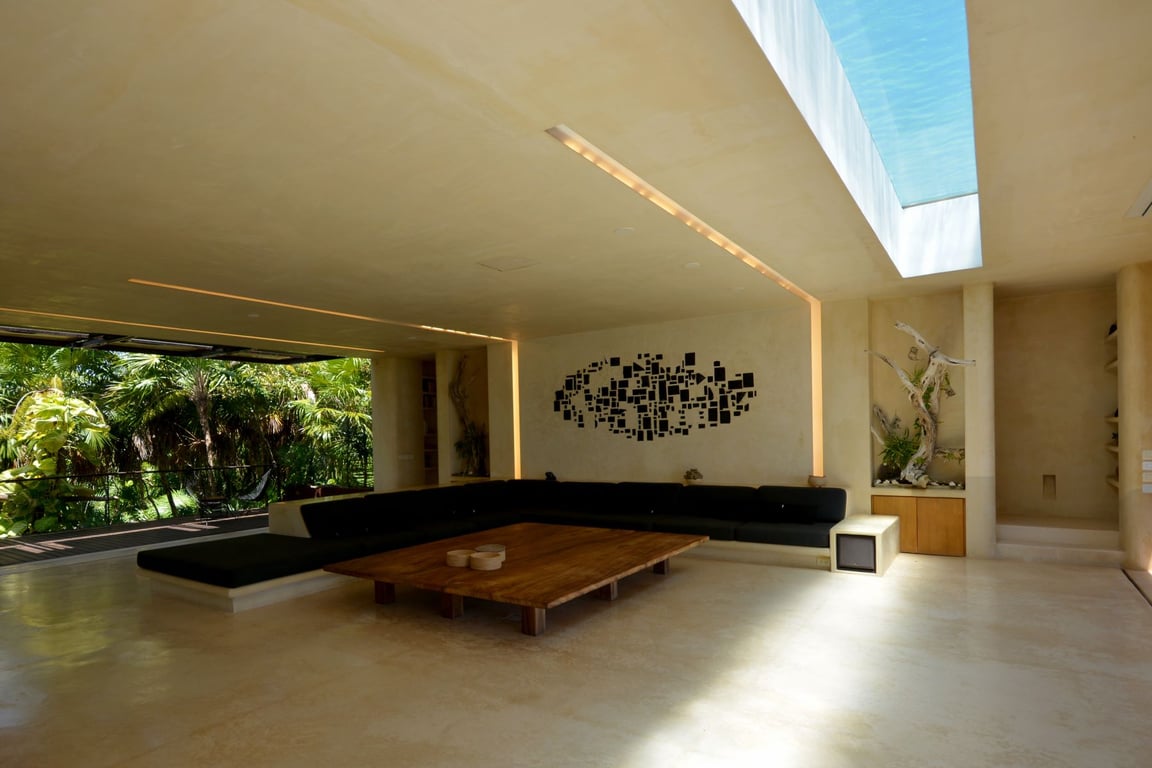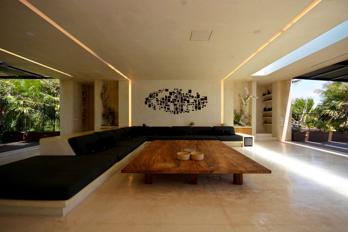 The architectural vision behind Casa del Agua seamlessly integrates form and function through innovative design elements. The crown jewel—a 66-foot heated infinity lap pool—sits atop the roof terrace, its transparent bottom creating mesmerizing light patterns that dance through the social spaces below. Crafted from tropical hardwoods and natural materials, the residence features cleverly concealed sliding doors that allow the professionally equipped kitchen to either join or separate from entertaining areas, providing ultimate flexibility for any occasion.
