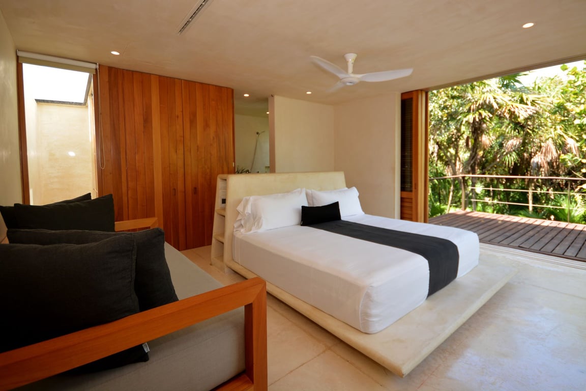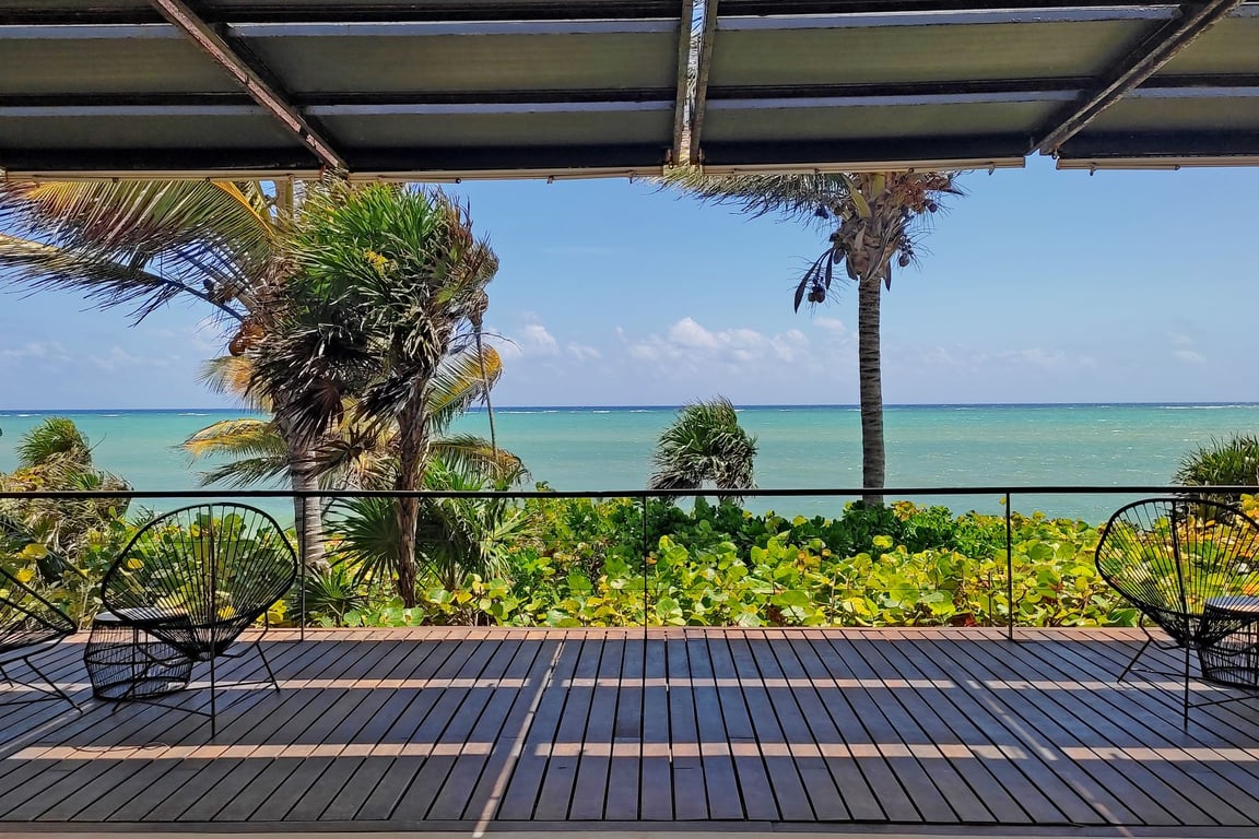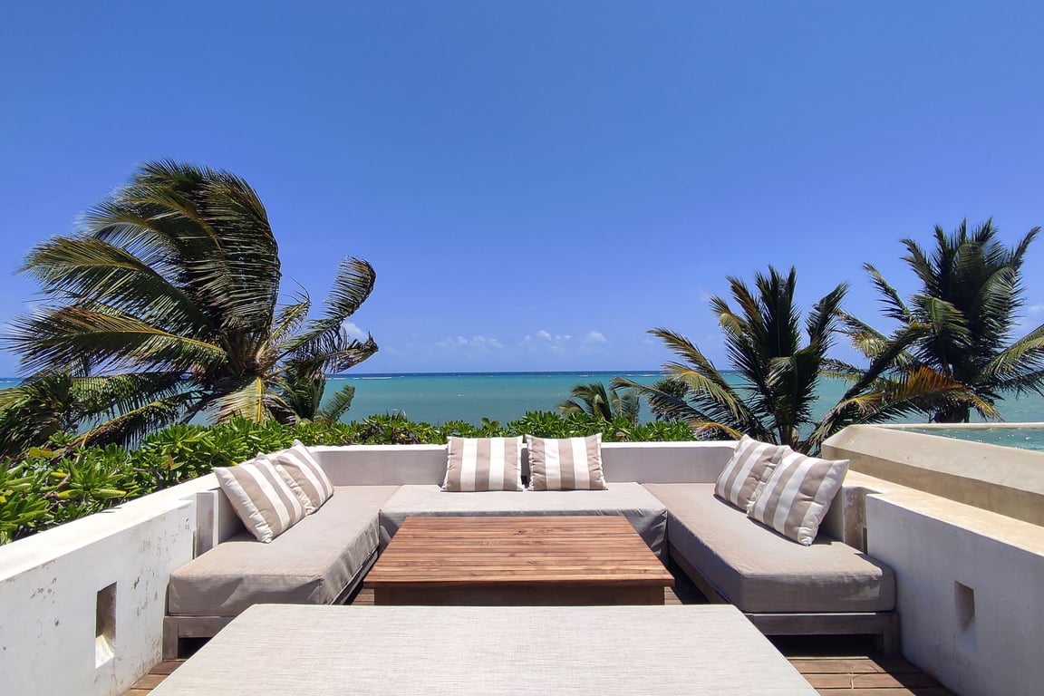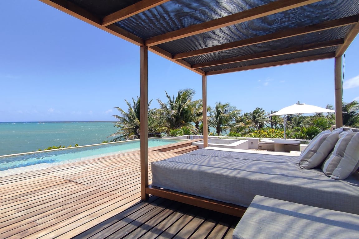 Four exquisitely appointed suites offer distinct experiences: two master suites boast private terraces and stone bathtubs with sweeping ocean vistas, while two additional suites provide tranquil jungle views from their private terraces. The open-concept living and dining areas flow effortlessly onto dual terraces—one embracing the Caribbean Sea, the other immersed in lush jungle vegetation. A separate service wing includes three staff bedrooms, full bathroom, kitchen, and storage facilities, ensuring seamless household management while maintaining privacy. The property's 360-degree views encompass ocean, lagoon, and jungle—a rare trifecta that defines true exclusivity.