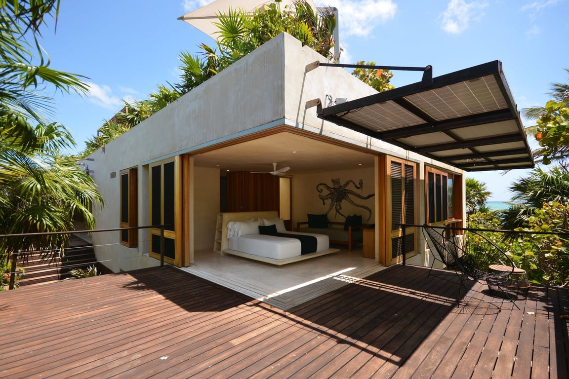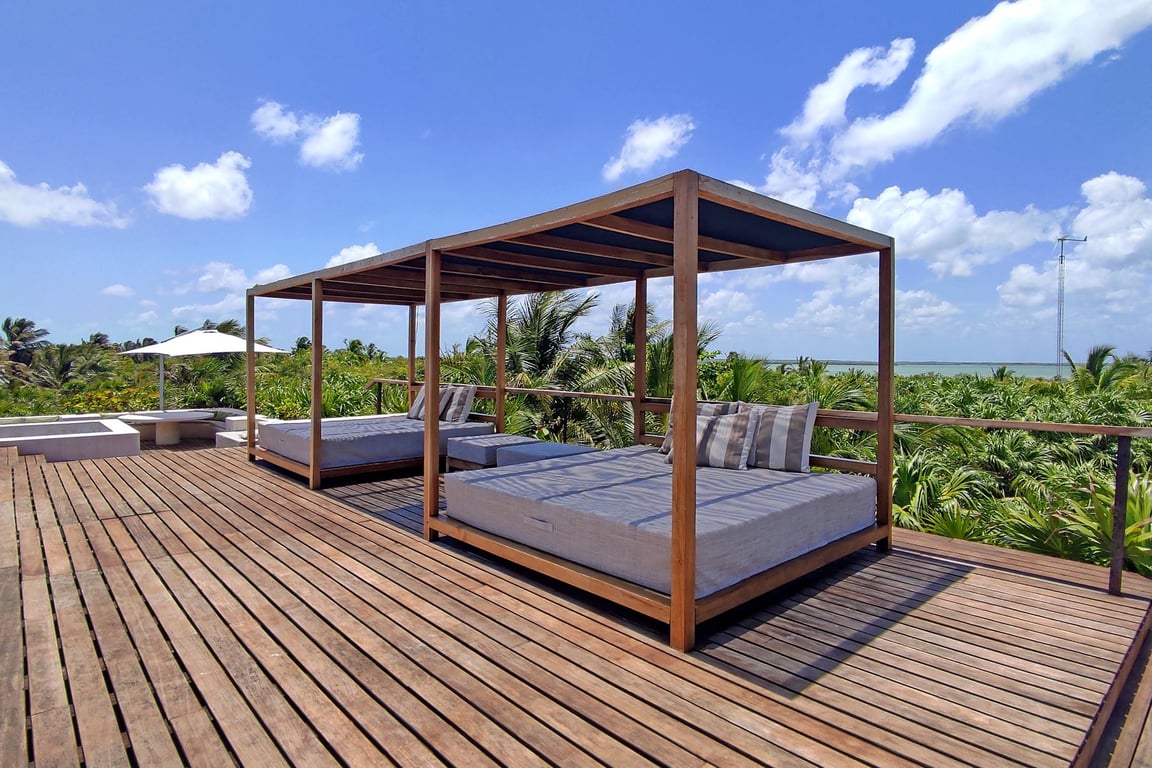 Living within the Sian Ka'an Biosphere Reserve means embracing a lifestyle of unparalleled natural beauty and ecological significance. Direct lagoon access and extensive beachfront provide endless opportunities for kayaking, fishing, and wildlife observation. Casa del Agua's commitment to sustainability is evident through its wind turbines, photovoltaic cells, natural wetland water treatment system, and chlorine-free pool sanitization using copper ion technology. Solar heating systems and efficient backup generators ensure modern comfort while minimizing environmental impact.