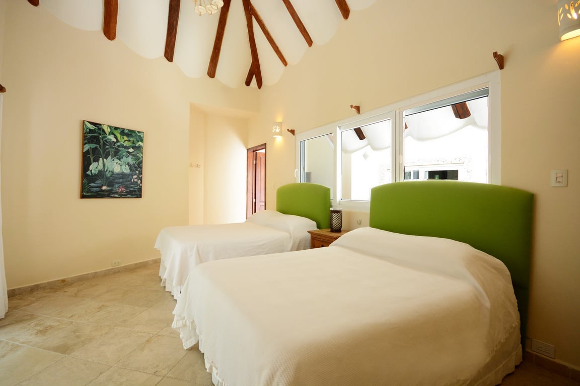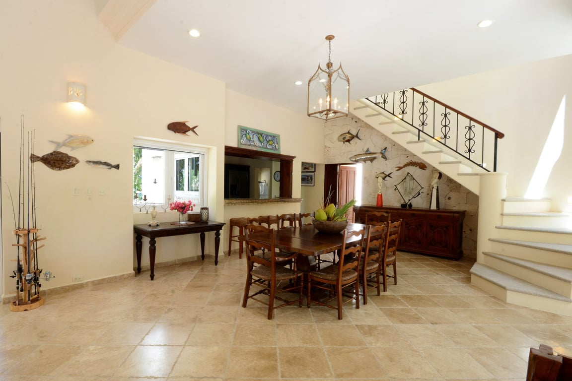 The architectural vision of Seaside Paradise celebrates the harmony between refined living and environmental consciousness. Spanning 4,277 square feet across two stories plus a rooftop terrace, the residence features soaring double-height ceilings that create a sense of grandeur while maintaining intimate warmth. Floor-to-ceiling windows frame breathtaking ocean views from every bedroom and social space, while opposite-facing windows invite cross-ventilation and showcase the lush jungle reserve beyond. Macedonian marble floors throughout the home add timeless elegance, while the Mediterranean aesthetic brings understated sophistication to every corner.
