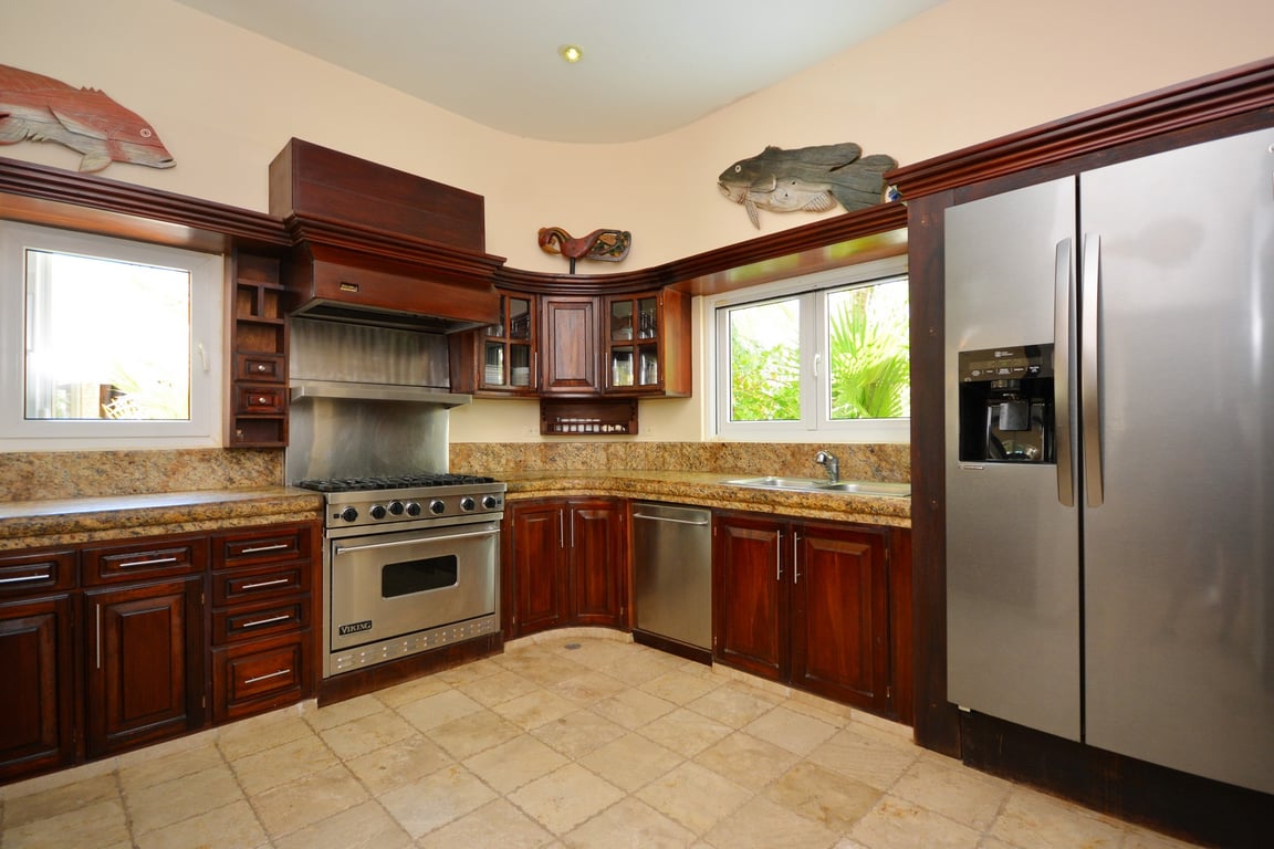 The ground floor unfolds as a masterpiece of open-concept luxury living. The expansive living and dining area flows seamlessly to a covered pergola terrace and sparkling pool, creating an ideal setting for both intimate gatherings and grand entertaining. Four generously appointed bedrooms, each with ensuite bathrooms, offer private retreats with direct ocean vistas. The American-style kitchen showcases fine wood cabinetry and granite countertops, semi-open to the dining area for effortless entertaining. Additional ground-floor amenities include a pantry, laundry room, and staff quarters. Ascend to the upper level to discover a versatile family room with potential as a fifth bedroom, while the crowning rooftop terrace delivers 180-degree panoramic views spanning the Caribbean Sea to the endless jungle canopy—perfect for witnessing spectacular sunrises and sunsets.