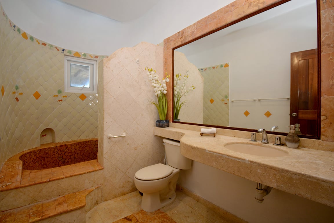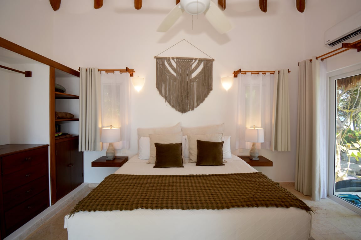The villa's five bedrooms are designed for ultimate comfort and privacy. Four generous bedrooms feature king-size beds, with two offering ensuite bathrooms for added convenience. A charming separate casita provides additional accommodation with a queen-sized bed and private bathroom, perfect for guests or extended family. The master suite, perched on the second level, delivers breathtaking ocean panoramas and opens onto a shaded terrace complete with an outdoor grill, al fresco dining area, and a cozy lounge overlooking the verdant jungle canopy.