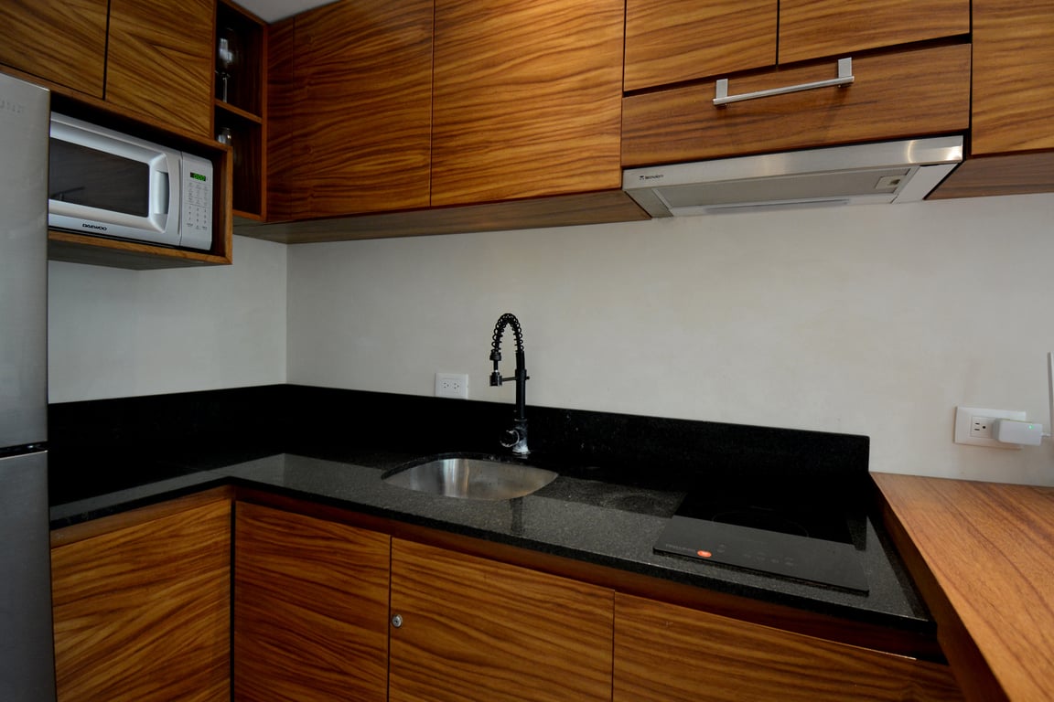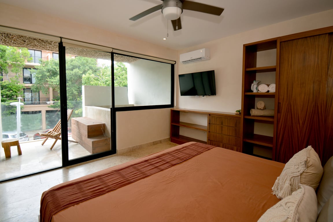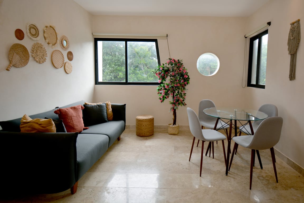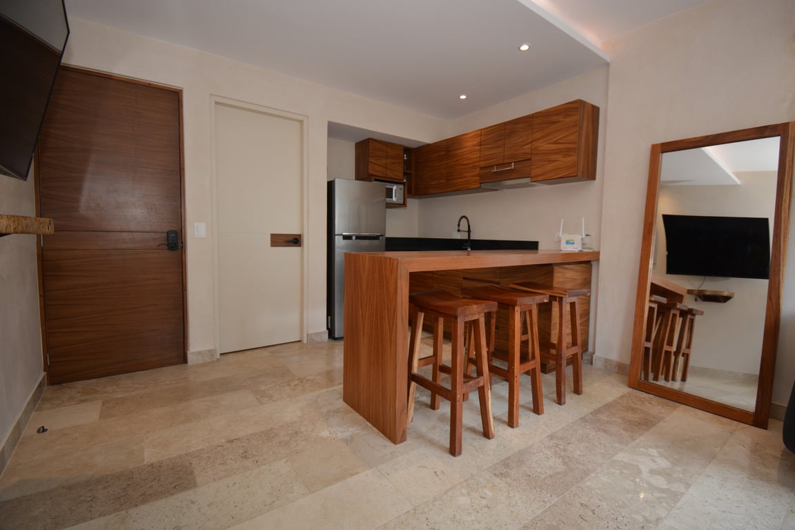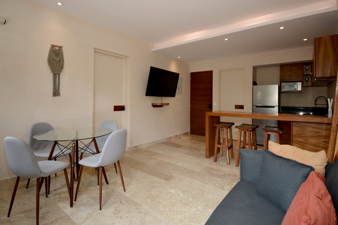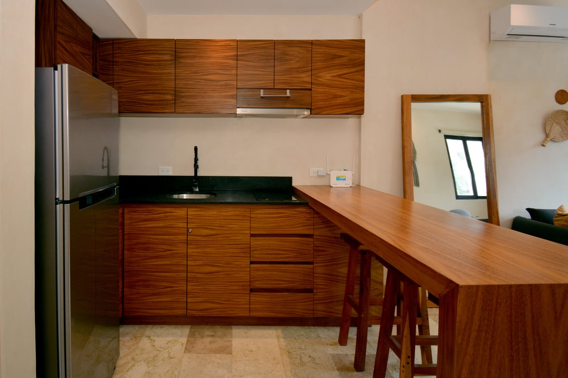 The apartment's crown jewel is undoubtedly the private terrace with its own plunge pool—your personal oasis for morning swims or sunset relaxation. Inside, the open-concept living space flows seamlessly from the sleeping area, featuring a king-size bed and generous closets, to the social zone with a convertible sofa bed and elegant dining area. The modern kitchen bar comes fully equipped with premium appliances including an electric cooktop, extractor hood, refrigerator, and microwave, making it ideal for both casual breakfasts and entertaining guests. Every furnishing reflects Tulum's signature blend of chic minimalism and bohemian warmth.