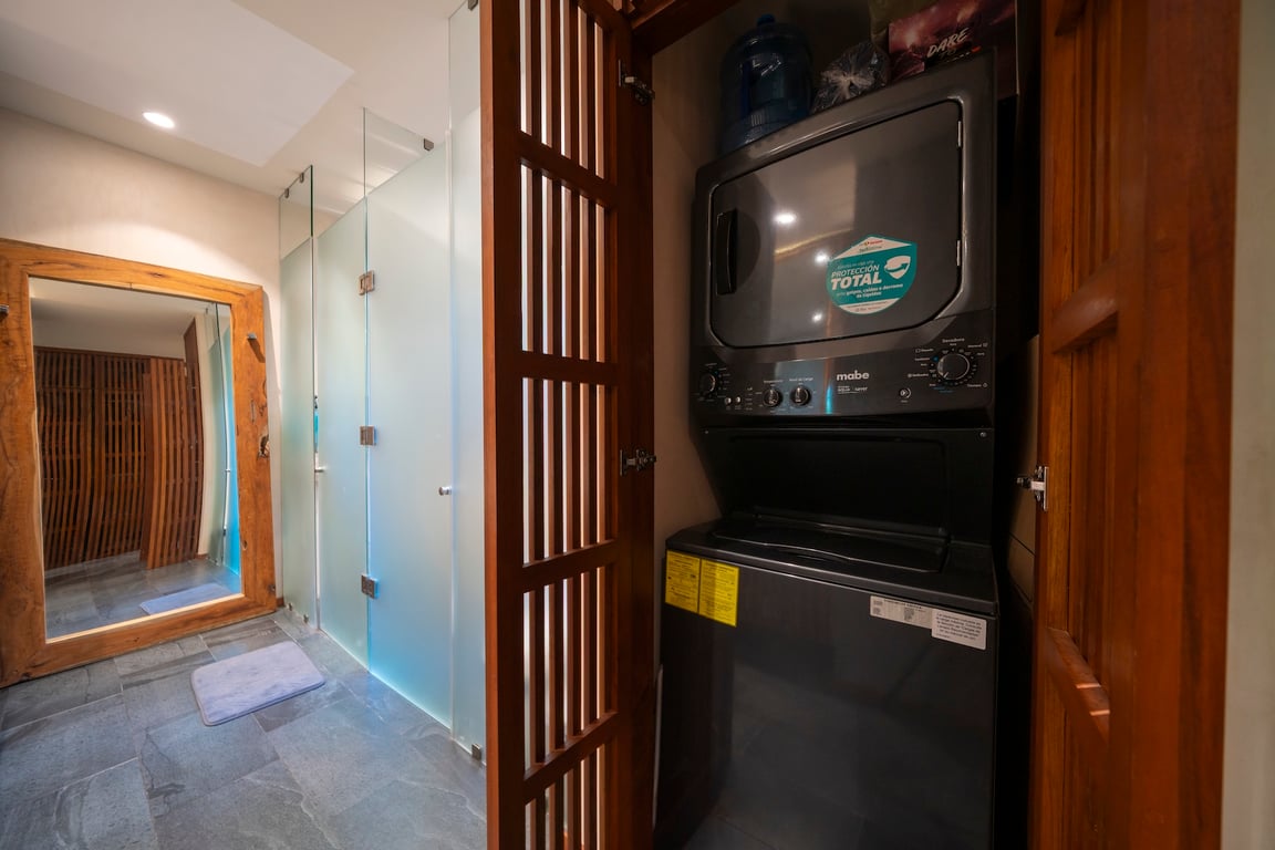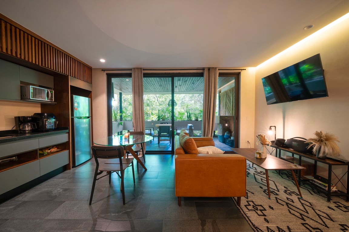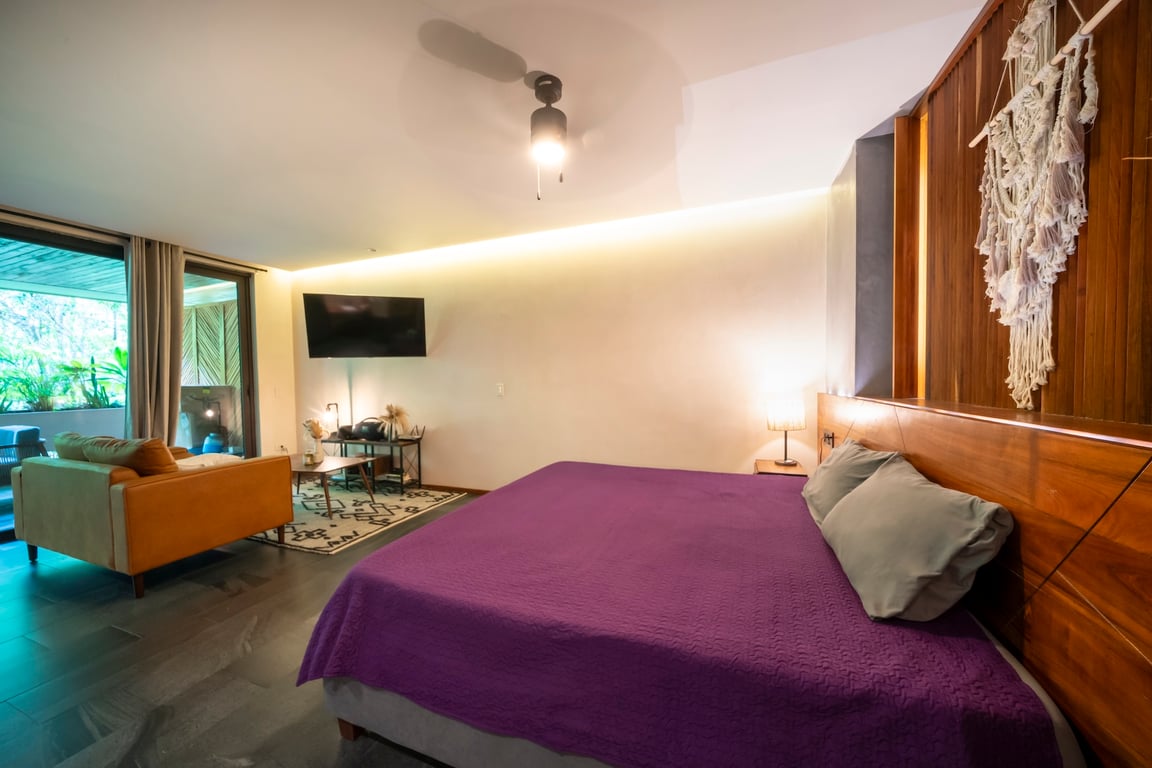 Inside, the loft's open-concept layout maximizes both space and natural light, featuring a king-size sleeping area, fully equipped kitchen, and integrated living and dining zones that flow seamlessly onto a generous covered terrace. Surrounded by lush tropical greenery, this outdoor extension becomes your private retreat—ideal for morning coffee, remote work sessions, or evening relaxation. The spacious bathroom offers double sinks and built-in closet storage, while a discreetly concealed laundry area maintains the clean, functional aesthetic throughout. Delivered fully furnished and thoughtfully equipped, this turnkey residence is ready for immediate enjoyment.