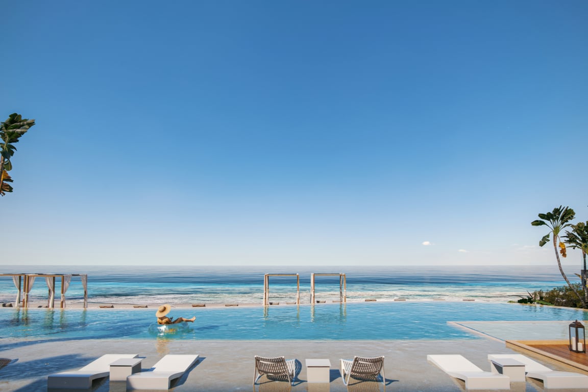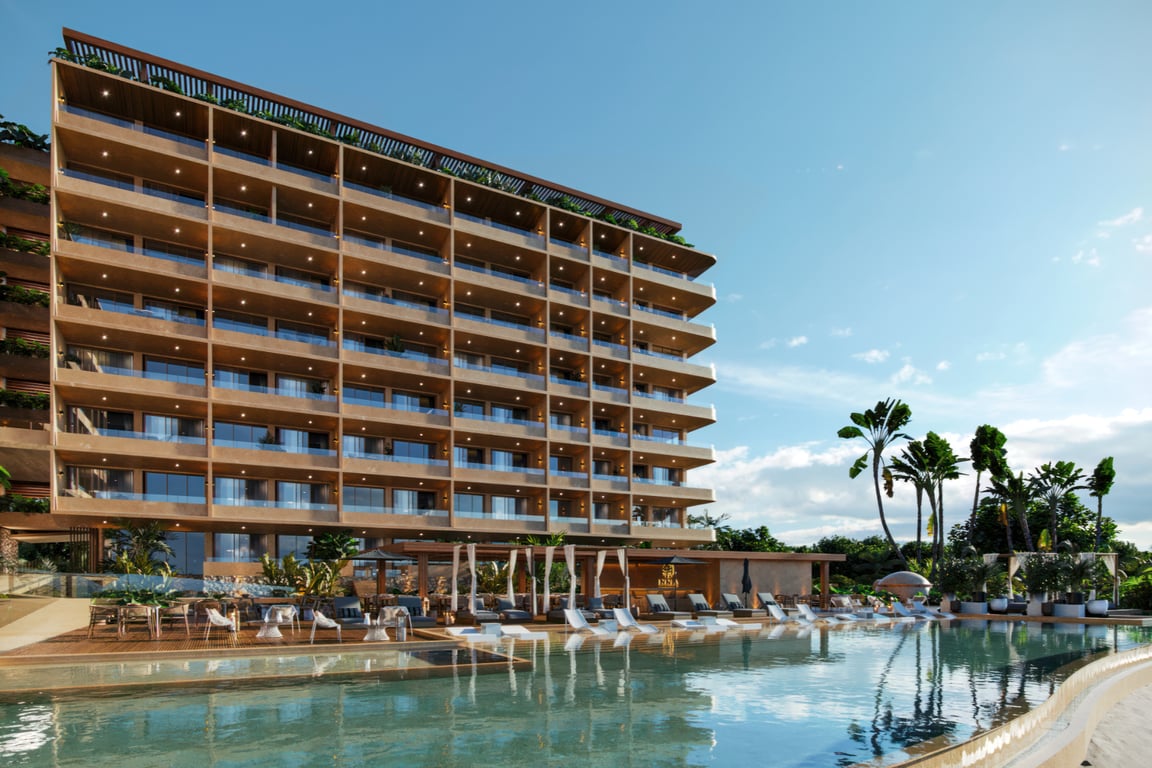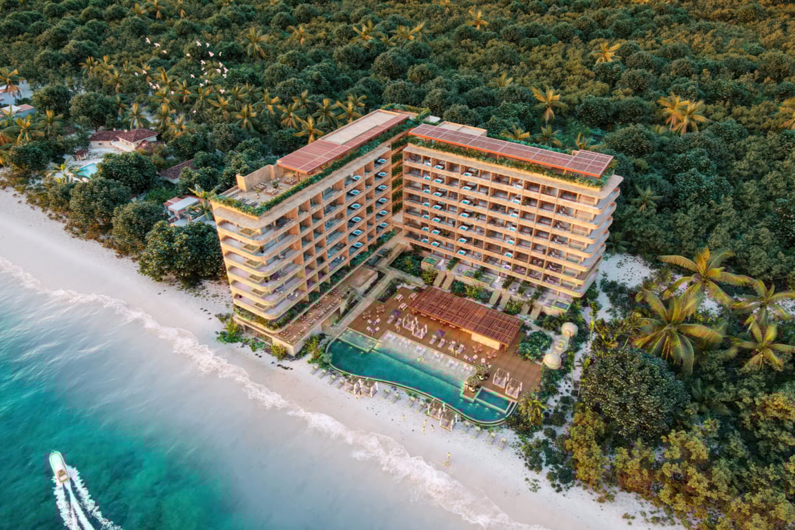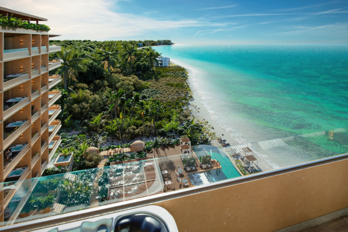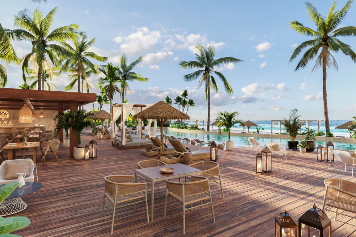 Discover a rare opportunity to own a piece of paradise where the turquoise waters of the Caribbean Sea meet sophisticated resort-style living. Beach Condos & Hotel Luxury Oasis presents an exclusive three-bedroom residence in Puerto Morelos, where 70 linear meters of pristine beachfront and stunning reef views create an unmatched coastal sanctuary.