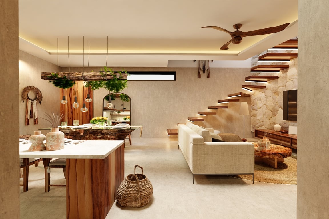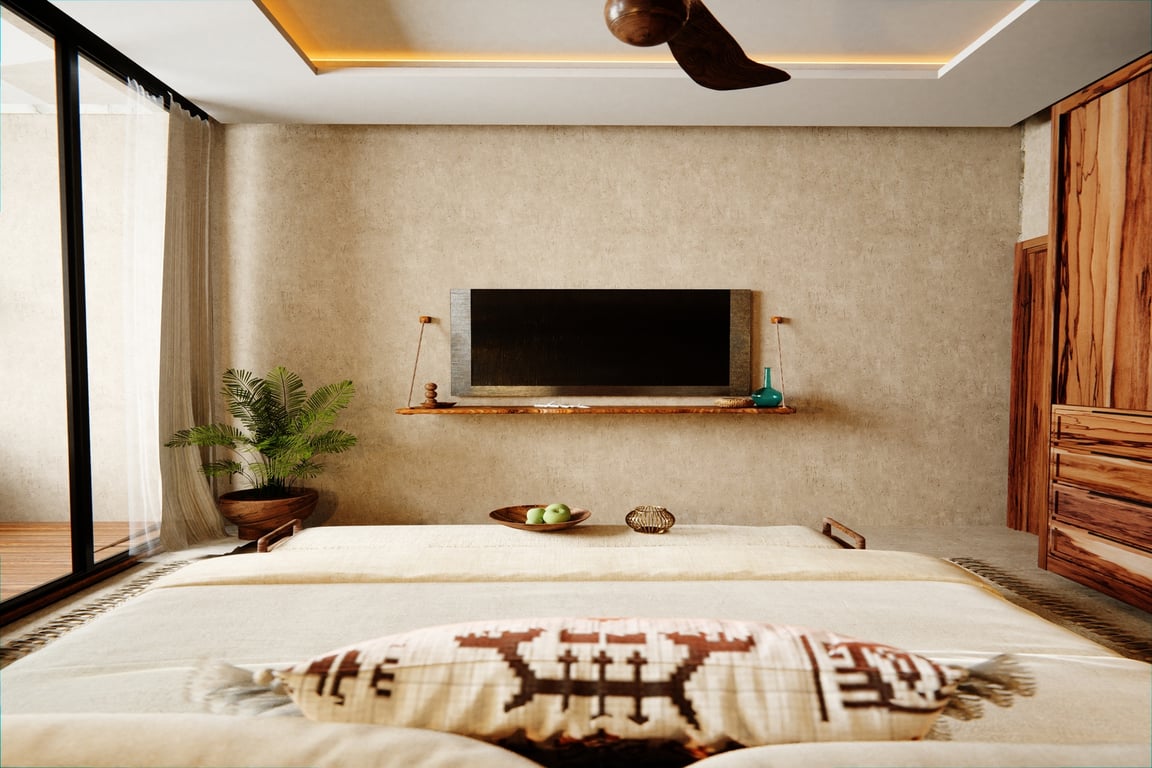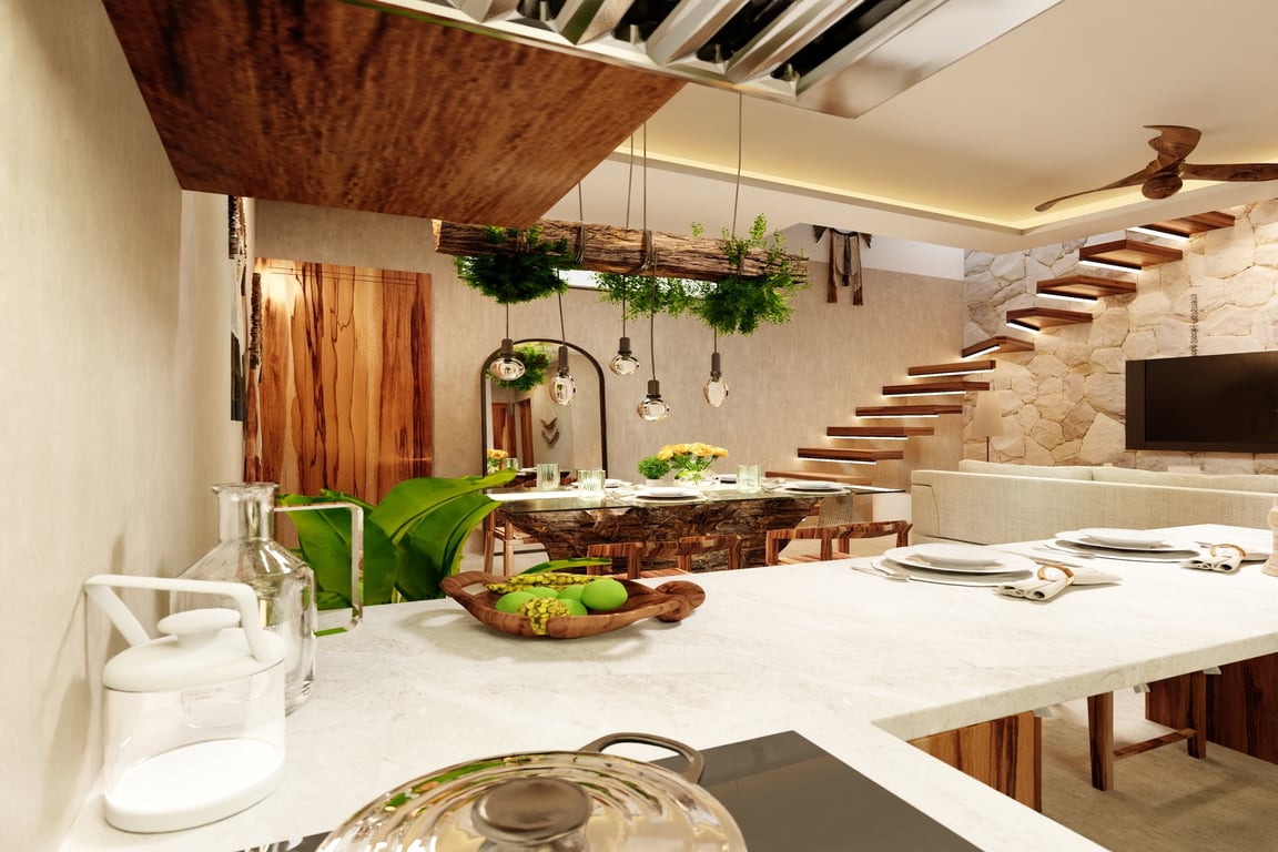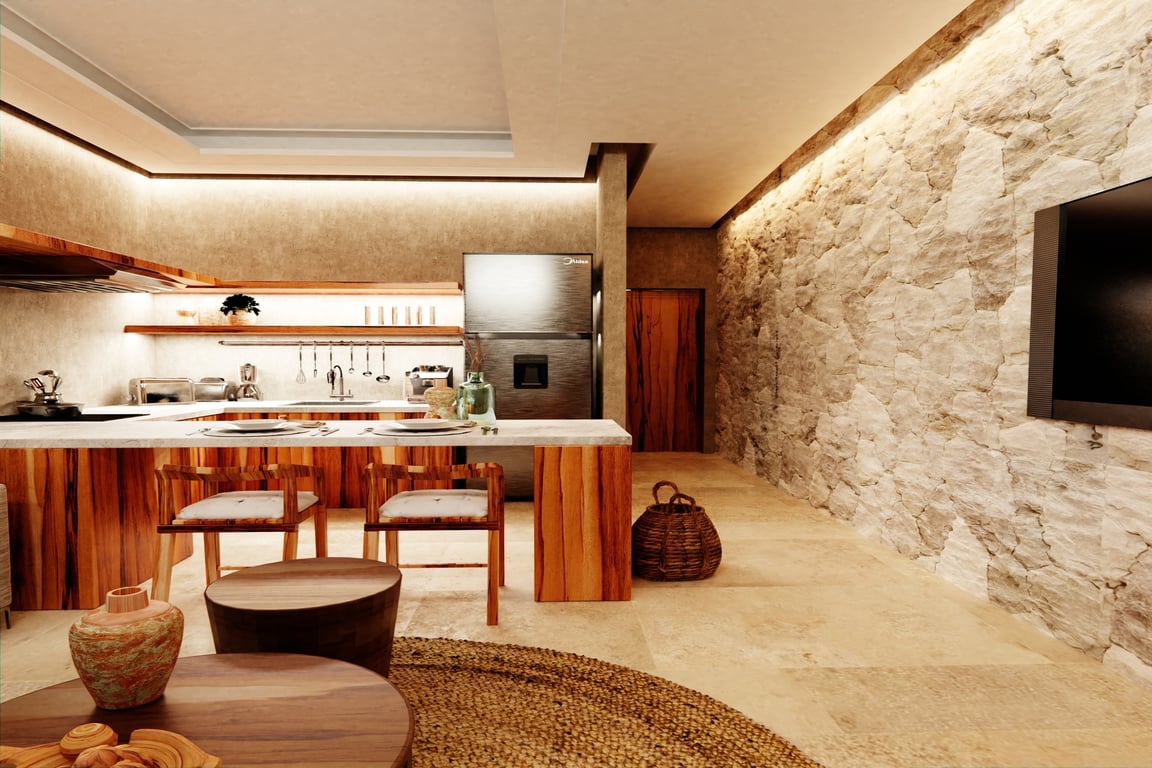 The architectural narrative of this villa celebrates Mexico's rich cultural heritage through the masterful integration of regional materials and time-honored construction techniques. Tzalam and parota woods lend warmth and authenticity to the interiors, while traditional Chukum—a Mayan plastering technique used in ancient archaeological sites—creates breathtaking textured surfaces. Travertino moka marble floors flow throughout the residence, complemented by handcrafted matte finishes, granite accents, and sophisticated matte black fixtures that anchor the contemporary aesthetic. Every detail has been considered to create a sanctuary that honors the past while embracing modern luxury.