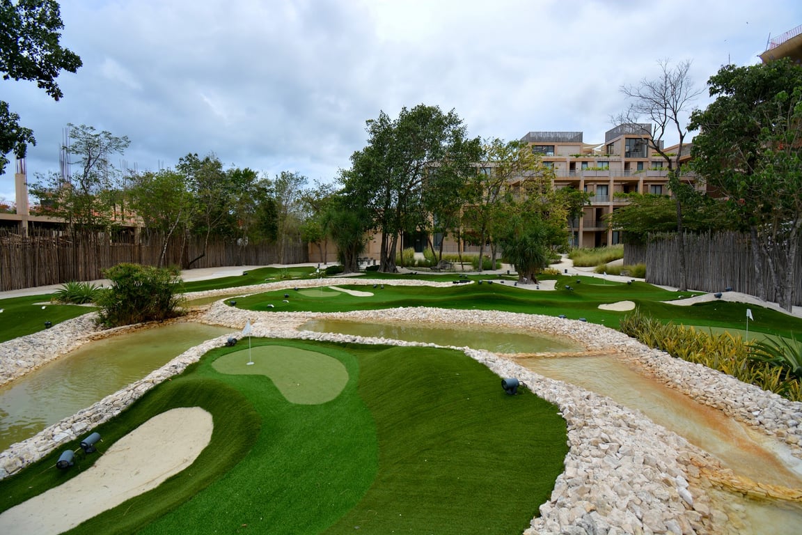 Life at The Village transcends the boundaries of your residence. Ascend to the spectacular rooftop where two jacuzzis and a plunge pool await, offering sunset views that define Riviera Maya living. The family pool provides a refreshing retreat, while the mini golf course adds playful sophistication. Maintain your wellness routine in the state-of-the-art gym, gather around the fire pit for evening conversations, and enjoy the convenience of elevator access and secure underground parking.