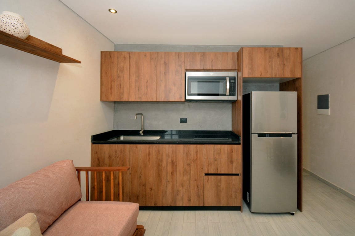 Step through your private terrace doors and discover your personal outdoor haven, perfectly proportioned for morning coffee rituals, sunset cocktails, or simply breathing in the lush tropical surroundings that define Tulum's magnetic appeal. The seamless indoor-outdoor flow exemplifies the region's celebrated lifestyle, where the boundaries between living space and nature beautifully blur. Inside, the open-concept living area flows effortlessly into a well-appointed bedroom, creating a sense of spaciousness that defies the home's efficient footprint.