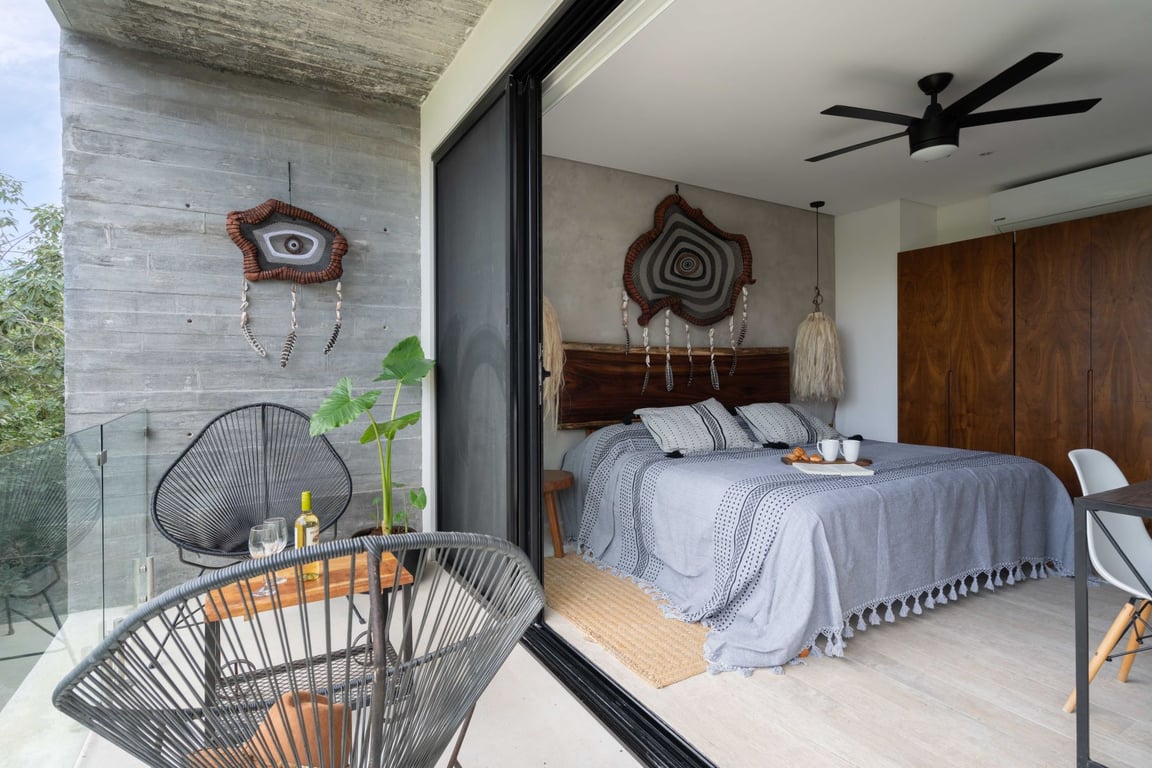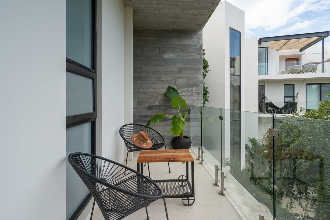 Spanning 975 square feet across two distinctive levels, this fully furnished penthouse offers a sophisticated living experience. The ground floor presents an expansive open-concept space featuring floor-to-ceiling windows that frame captivating views of Tulum's lush natural landscape. The bedroom suite includes custom closet space and direct balcony access, while the modern kitchenette boasts stainless steel appliances and sleek quartz surfaces. A spacious second bathroom adds convenience and luxury to the main level.