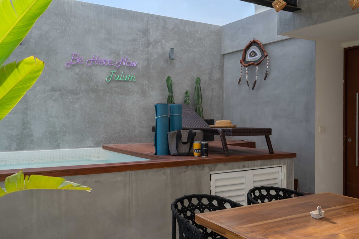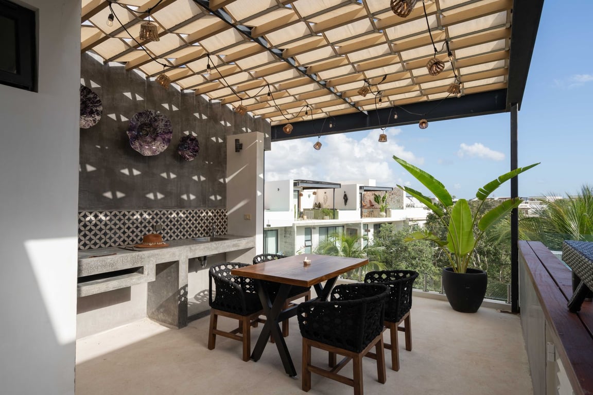 The crowning jewel awaits on the upper level: your private rooftop sanctuary. This expansive pergola-covered terrace features a refreshing plunge pool, a fully equipped bar with grill, and breathtaking 360-degree panoramic views. Whether hosting sunset gatherings or enjoying morning meditation, this outdoor oasis transforms everyday living into an extraordinary experience, offering the ultimate Tulum lifestyle beneath endless tropical skies.