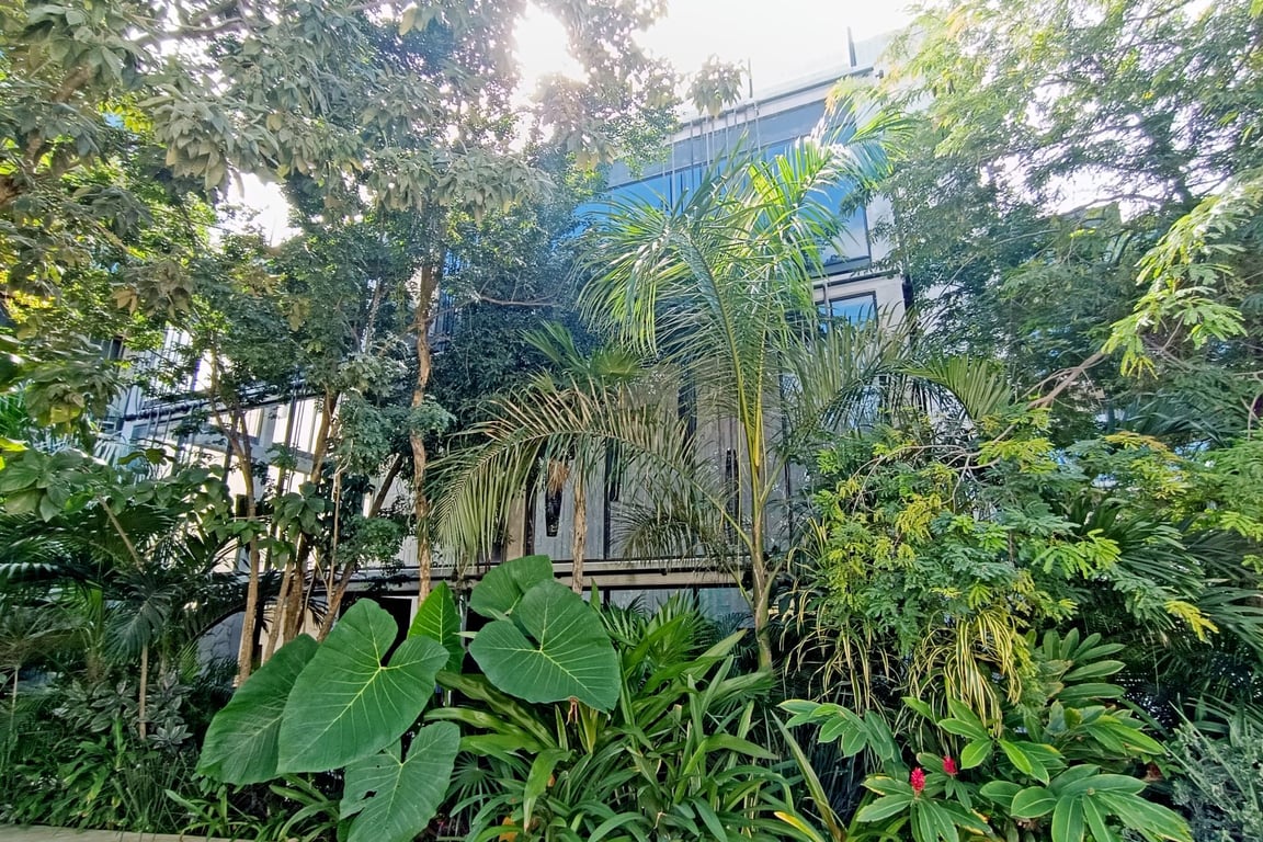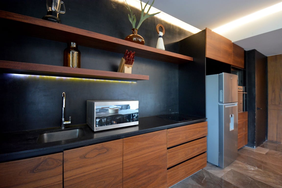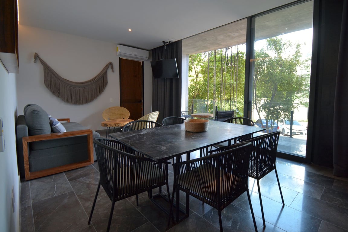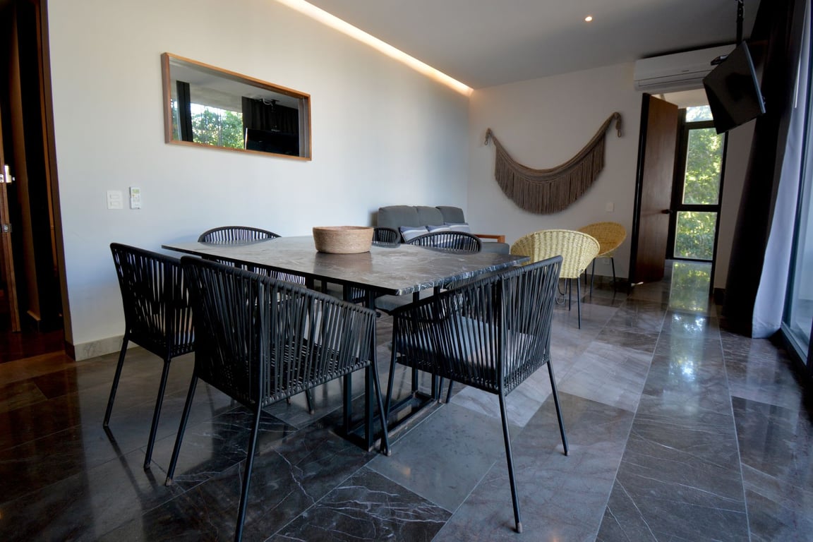 The apartment showcases modern architecture at its finest, with floor-to-ceiling windows that flood the interior with natural light and frame captivating jungle views. Every detail has been carefully curated using high-quality materials that echo the natural essence of the Riviera Maya, creating a seamless dialogue between indoor sophistication and outdoor beauty. The thoughtful design maximizes the 1,032 square feet of space, ensuring both functionality and aesthetic appeal throughout.