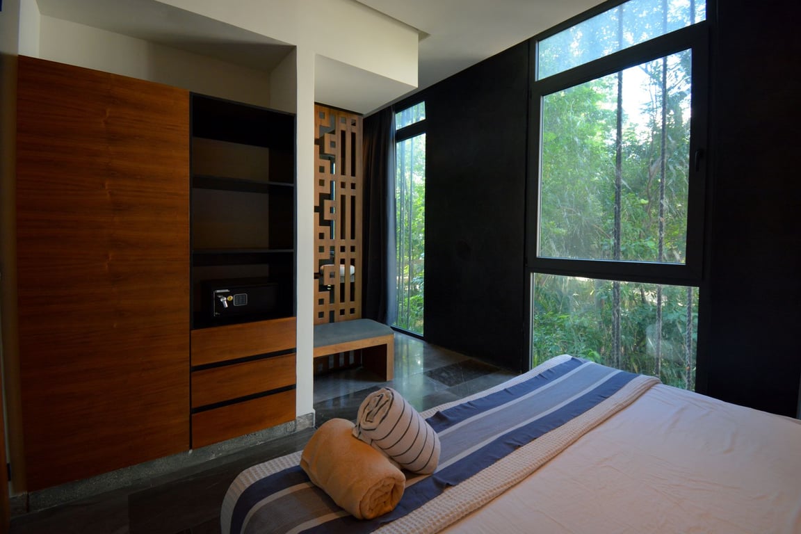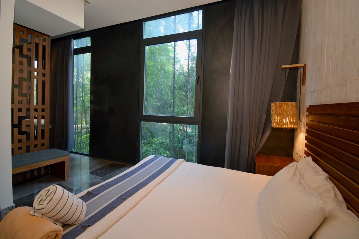 Step into the spacious living area where large windows open onto your private balcony, complete with a refreshing plunge pool—your personal oasis for unwinding after sun-soaked days exploring Tulum's beaches and cenotes. The modern kitchen features premium finishes and full equipment, perfect for preparing everything from morning coffee to gourmet meals. The master suite offers an ensuite bathroom and stunning vistas, while the lock-off bedroom transforms this property into a versatile investment opportunity. With its separate entrance, full bathroom, space for a cozy living area, and private closet, the second bedroom can operate independently, allowing you to enjoy your primary residence while generating rental income from the lock-off unit.
