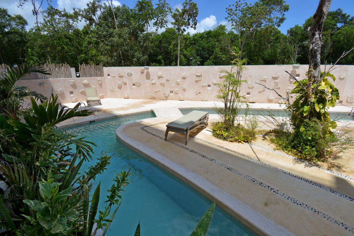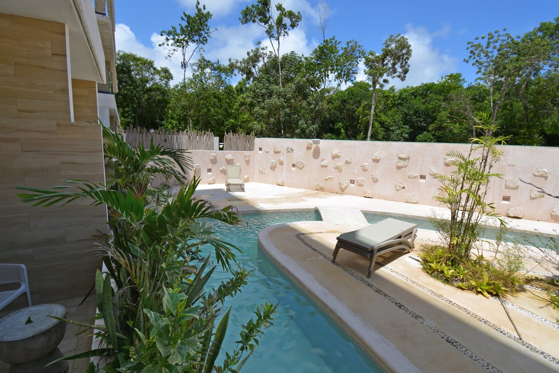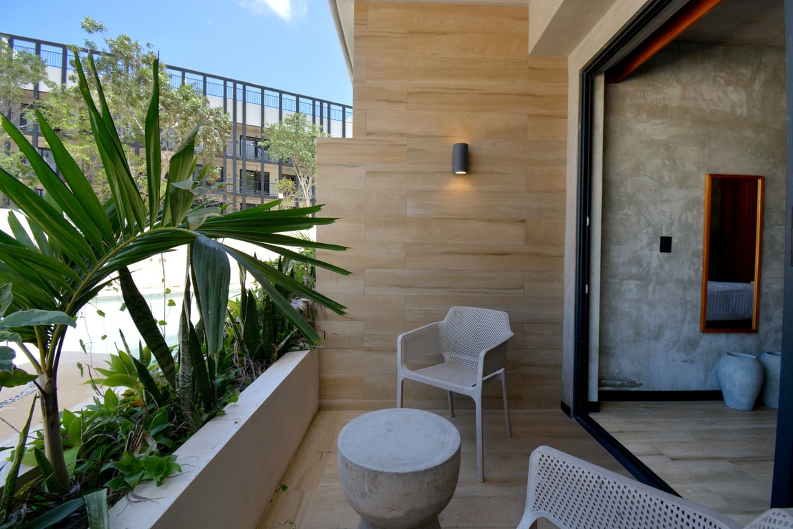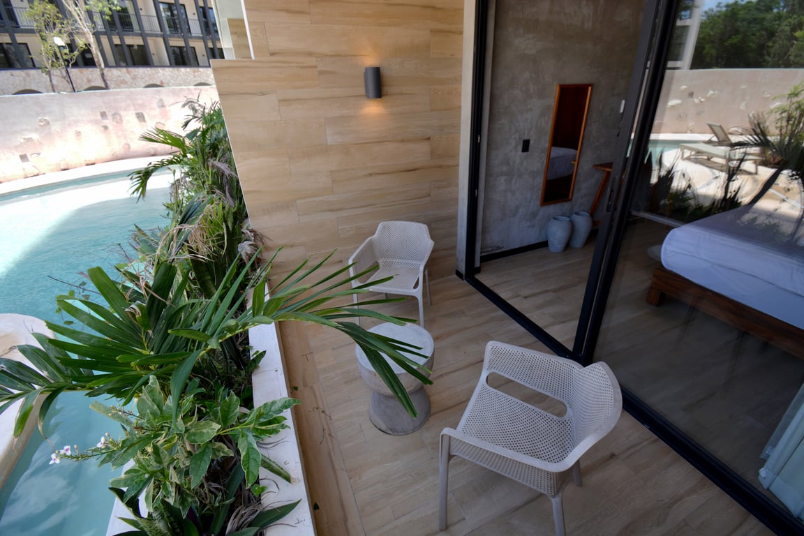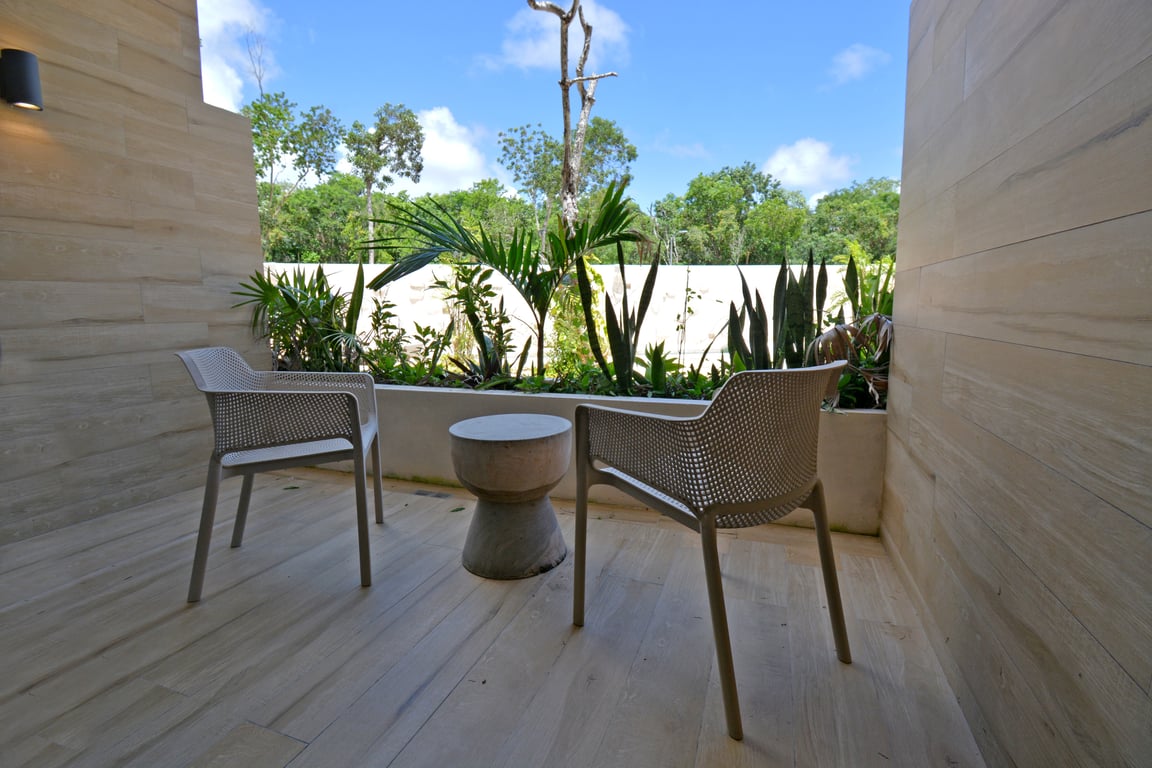 Your private 72-square-foot terrace becomes an extension of your living space, offering direct views of the sparkling pool below. This outdoor retreat provides the perfect setting for morning coffee or evening relaxation, surrounded by the lush tropical environment that defines Tulum's unique character. The studio is part of Torre Fuego (Fire Tower), one of four distinctive towers that comprise this architectural ensemble, each offering panoramic vistas of the majestic Mayan jungle.
