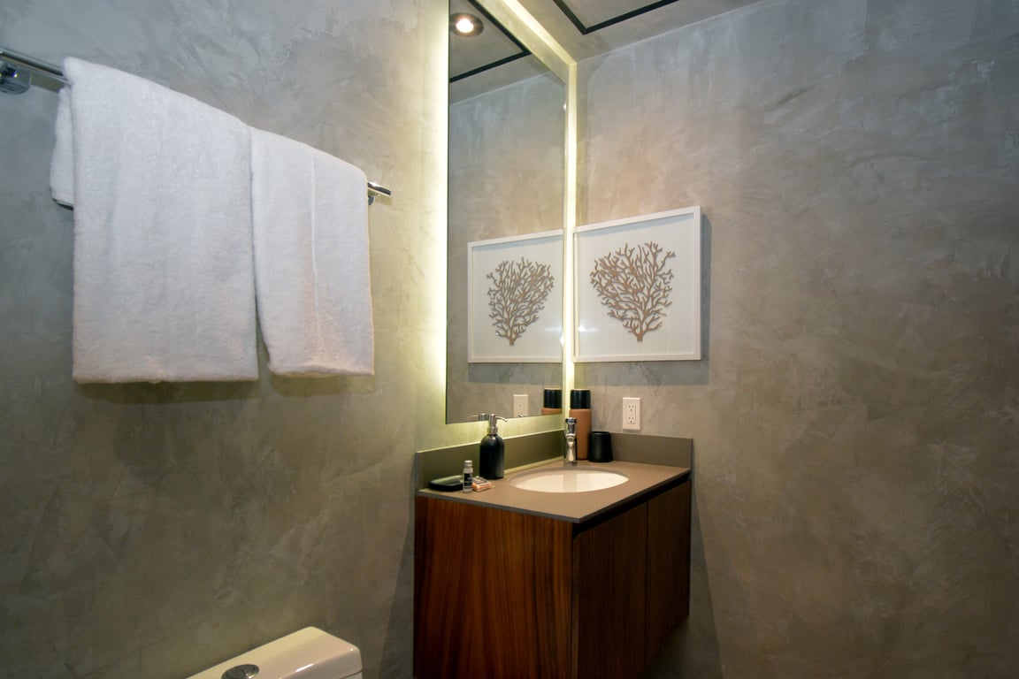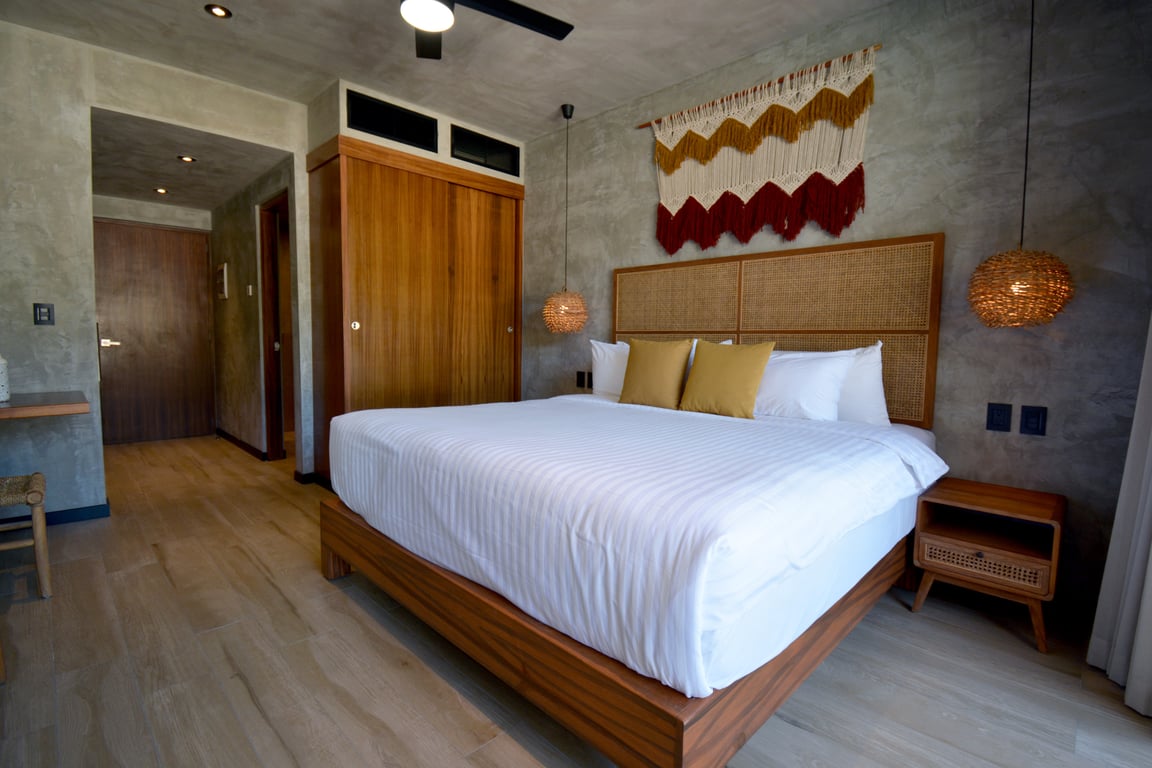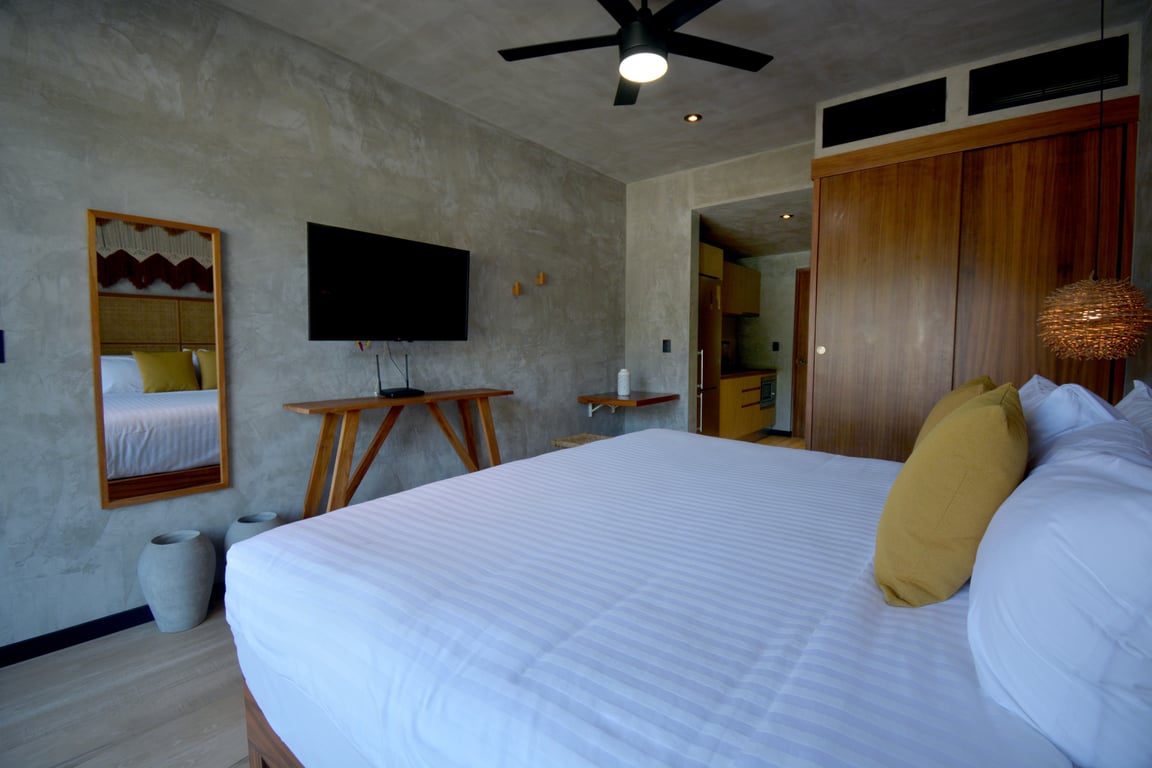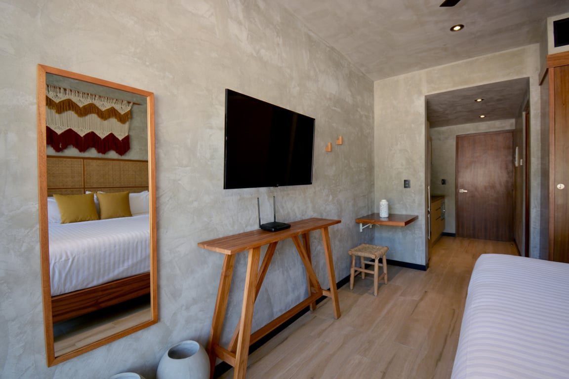 The studio's interior showcases the finest elements of regional craftsmanship, featuring authentic chukum finishes—a traditional Mayan stucco technique—complemented by polished cement floors and warm local woods. These carefully selected materials create an atmosphere that is both contemporary and deeply rooted in the area's cultural heritage. Every detail has been considered to maximize comfort within the intimate layout, from the fully equipped kitchen to the thoughtfully integrated storage solutions.