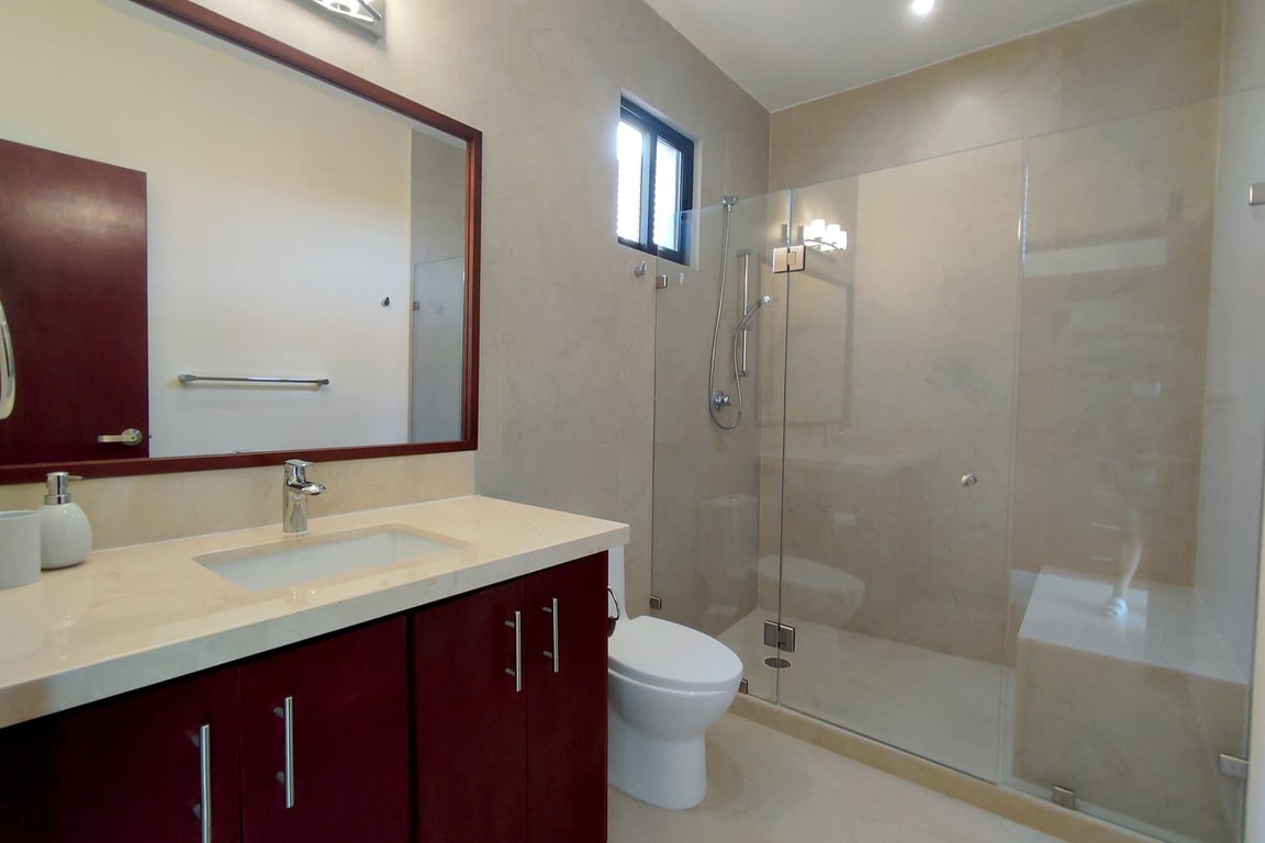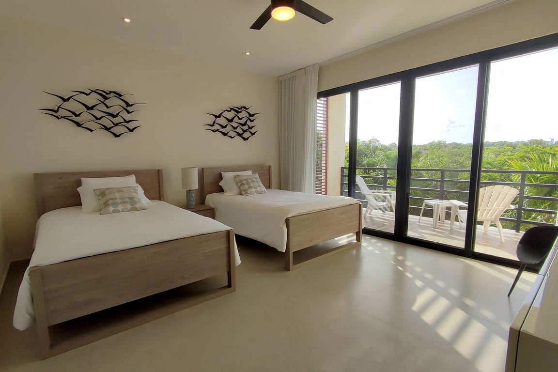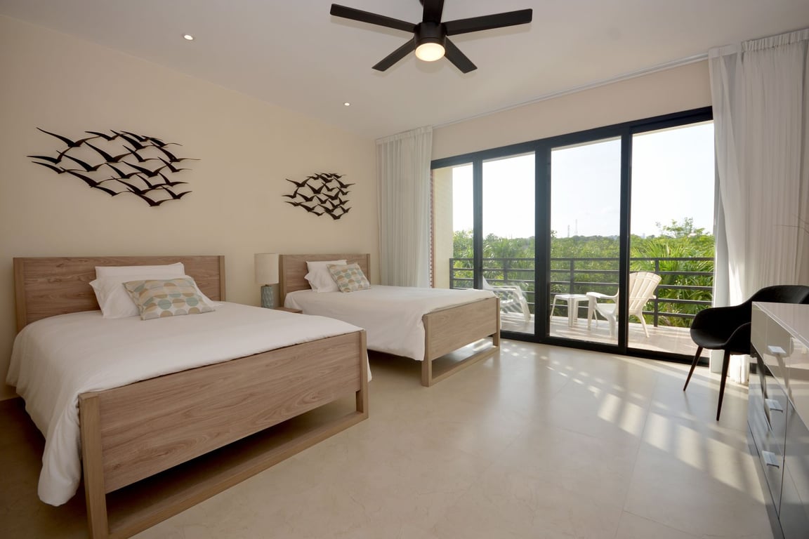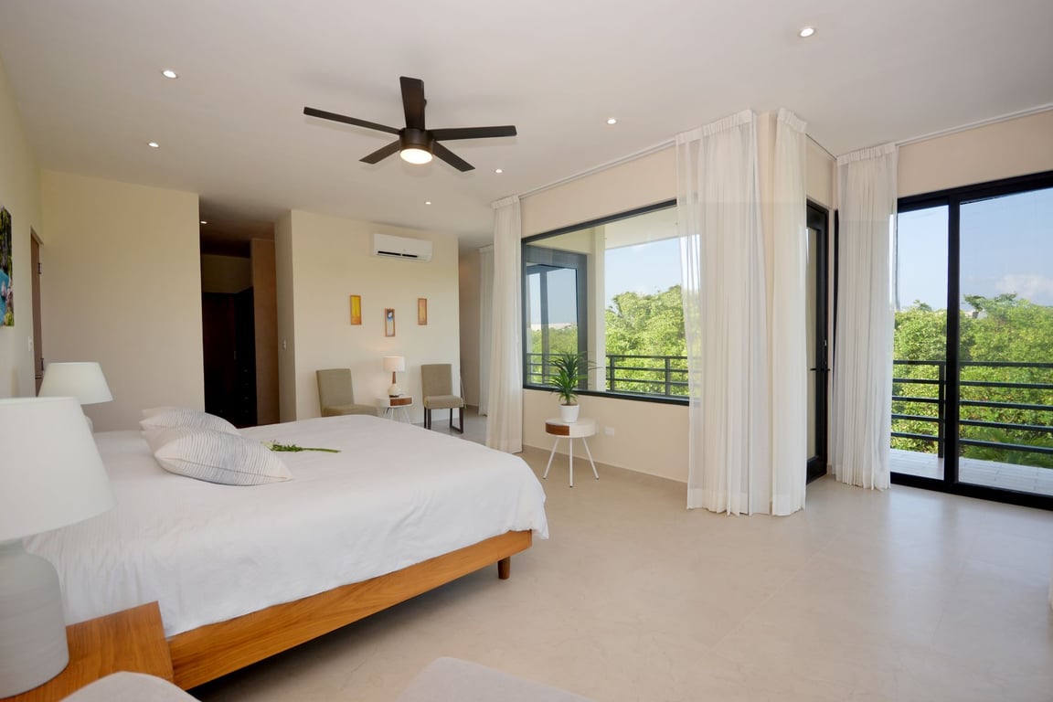Ascend the beautifully crafted wood staircase to find two spacious bedrooms, each with private bathrooms and generous balconies overlooking the jungle canopy. The master suite is a true sanctuary: floor-to-ceiling windows frame an endless sea of green, while a large private terrace faces east to capture morning sun and ocean breezes. A walk-in closet and spa-inspired ensuite complete this personal retreat. The rooftop terrace crowns this exceptional home, offering spectacular ocean and jungle views, a full bathroom, grill and beverage bar, and shaded pergola—the ultimate entertaining space for sunset gatherings or starlit evenings.
