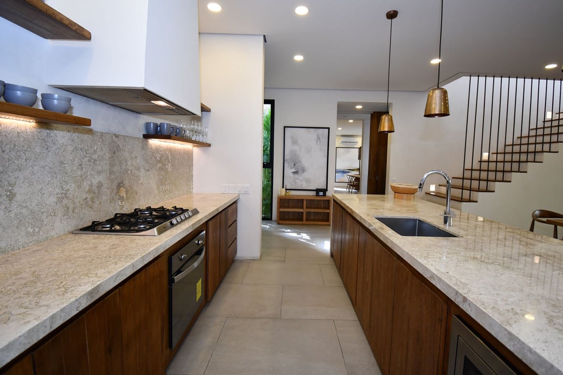 Ascend to the second floor where three beautifully appointed bedrooms await, each featuring its own full private bathroom. This thoughtful configuration ensures ultimate comfort and privacy for family members and guests. The rooftop terrace crowns this exceptional home, offering sweeping panoramic views across Tulum's lush jungle canopy—an ideal sanctuary for morning meditation, sunset cocktails, or starlit evenings.