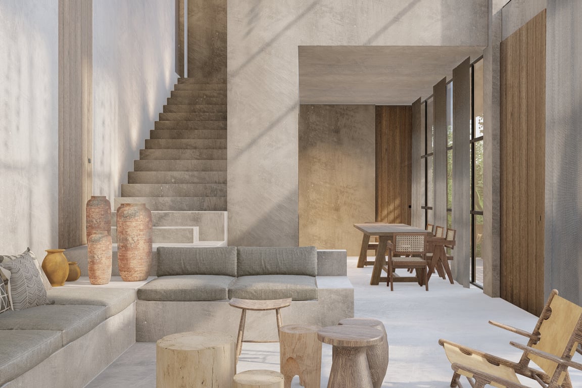 Villa Natura showcases the finest in regional craftsmanship and sustainable luxury. Traditional chukum finishes—a pre-Hispanic stucco technique—adorn the walls, creating a waterproof, breathable surface with an unmistakable organic elegance. Natural materials throughout the home pay homage to Tulum's commitment to environmental harmony while delivering uncompromising sophistication. The villa's three en-suite bedrooms offer private retreats for family and guests, each designed to maximize comfort and connection to the surrounding jungle canopy.