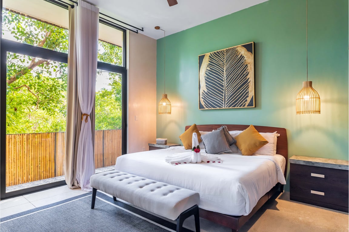 Perched on the second floor, this thoughtfully designed 1,486 square foot apartment showcases sophisticated architectural details that honor its natural surroundings. Floor-to-ceiling windows frame breathtaking jungle vistas while flooding the interior with natural light and gentle breezes. High ceilings create an expansive sense of space, while elegant wall coverings and premium quartz countertops throughout the kitchen and bathrooms reflect meticulous attention to luxury finishes. The private balcony serves as your personal observation deck, offering front-row seats to the spectacular tropical canopy.
