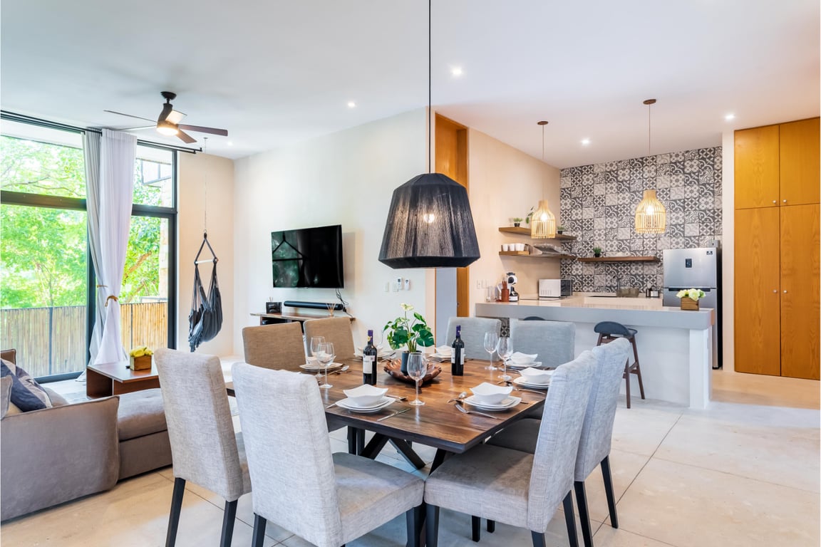 The residence features three generously proportioned bedrooms, including a master suite with full ensuite bathroom and walk-in closet, providing a serene retreat after days spent exploring the Riviera Maya. Two additional bedrooms share a beautifully appointed second bathroom, ideal for family or guests. The open-concept living and dining areas flow effortlessly onto the balcony, creating perfect spaces for entertaining or quiet contemplation. The modern kitchen comes fully equipped with stainless steel appliances and elegant quartz surfaces, ready for culinary adventures. Delivered fully furnished and equipped, this turnkey property allows you to begin your Tulum journey immediately.