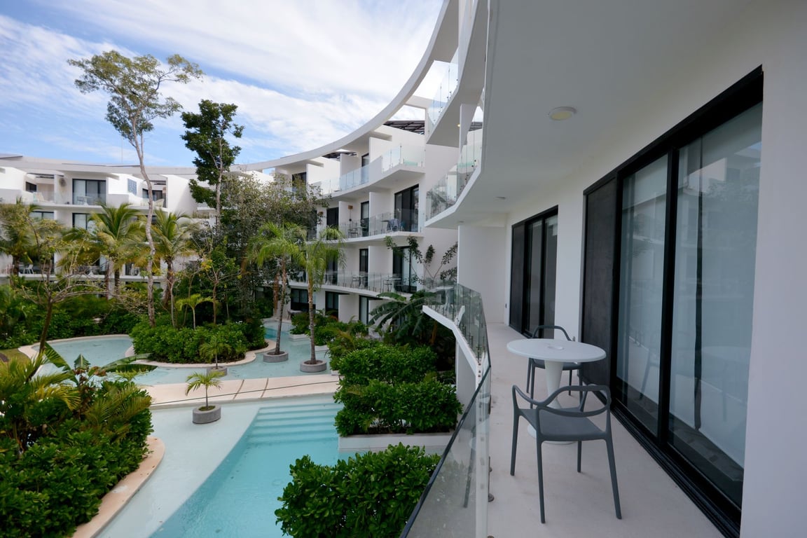 The architectural vision behind this property prioritizes both privacy and connection. Two generously proportioned bedrooms are thoughtfully separated by the kitchen and living areas, creating distinct private retreats within a cohesive whole. A continuous balcony connects both bedrooms, offering uninterrupted views of the 7,535 square feet of shimmering pools and lush vegetation below. Every finish has been selected with discerning tastes in mind, from the pristine white kitchen with its breakfast bar to the luxury materials throughout.