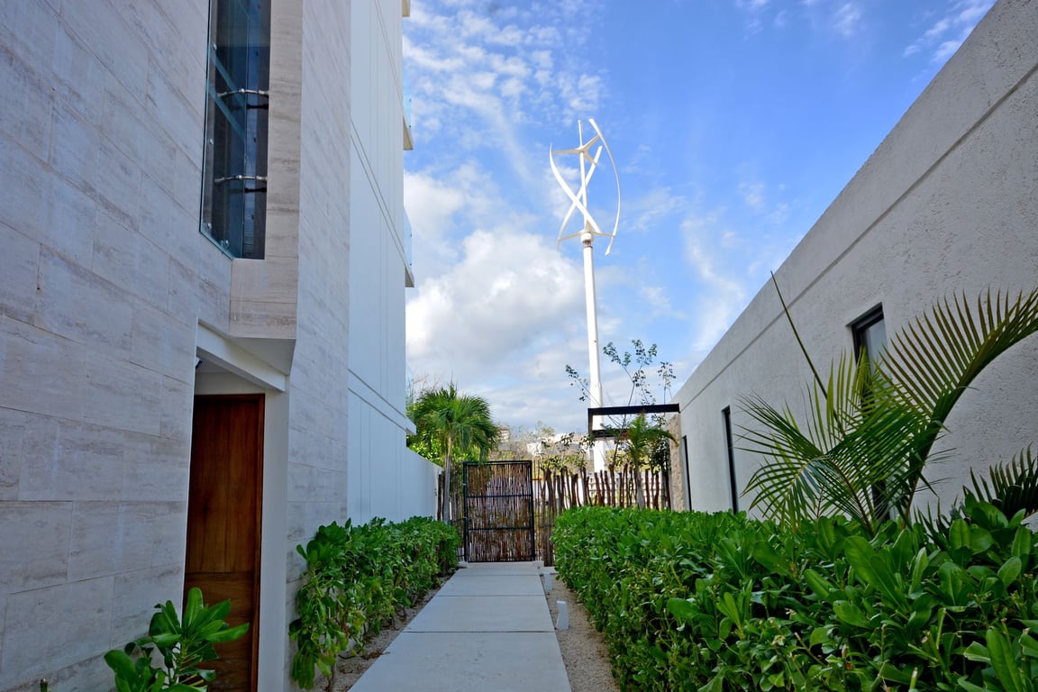 Discover a rare fusion of contemporary design and environmental consciousness at Lagunas Central Park, where 1,195 square feet of meticulously crafted living space overlooks pristine artificial lagoons and expansive pool areas. This 2021-built residence represents the future of sustainable luxury in Tulum, powered entirely by solar panels and vertical wind turbines—a testament to forward-thinking development in one of the Caribbean's most sought-after destinations.