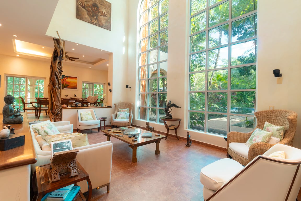 The architectural vision celebrates indigenous craftsmanship and sustainable design, incorporating native orchids, chit palm, and guano alongside premium hardwoods including zapote, chechén, and cataloch. The dramatic double-height living room features expansive windows that frame the surrounding jungle canopy, creating a seamless dialogue between interior refinement and the wild beauty beyond. Every material has been thoughtfully selected to honor the region's heritage while delivering contemporary comfort.