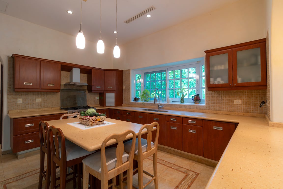 The residence encompasses five generously appointed bedrooms, each a private retreat with ensuite bathroom and walk-in closet. The gourmet kitchen flows effortlessly into a dining area designed for gatherings of ten, while open and covered terraces extend the living space into nature. A dedicated family TV room provides intimate comfort, and the thoughtfully planned layout ensures both grand entertaining and quiet contemplation are equally accommodated.
