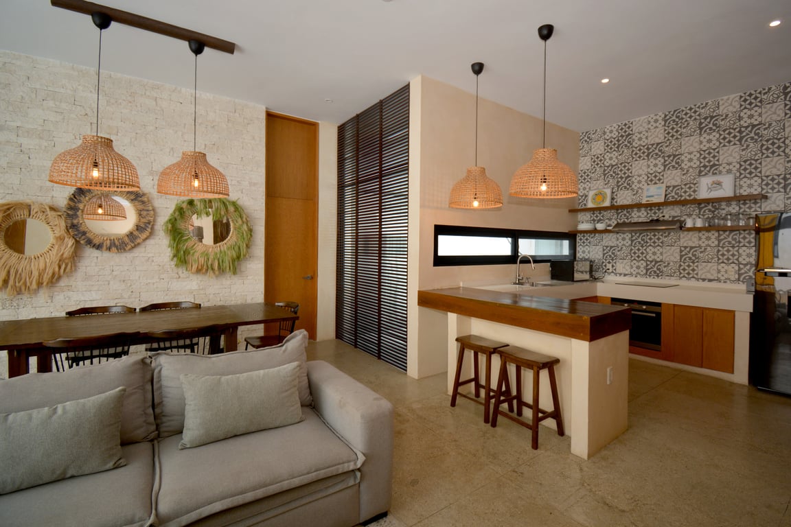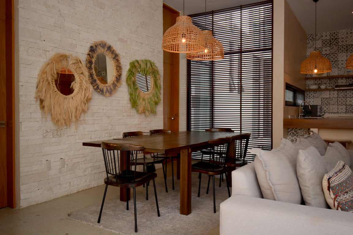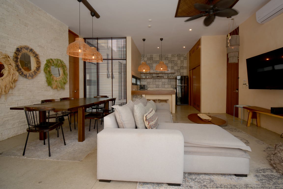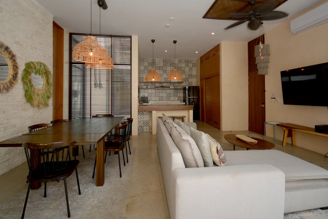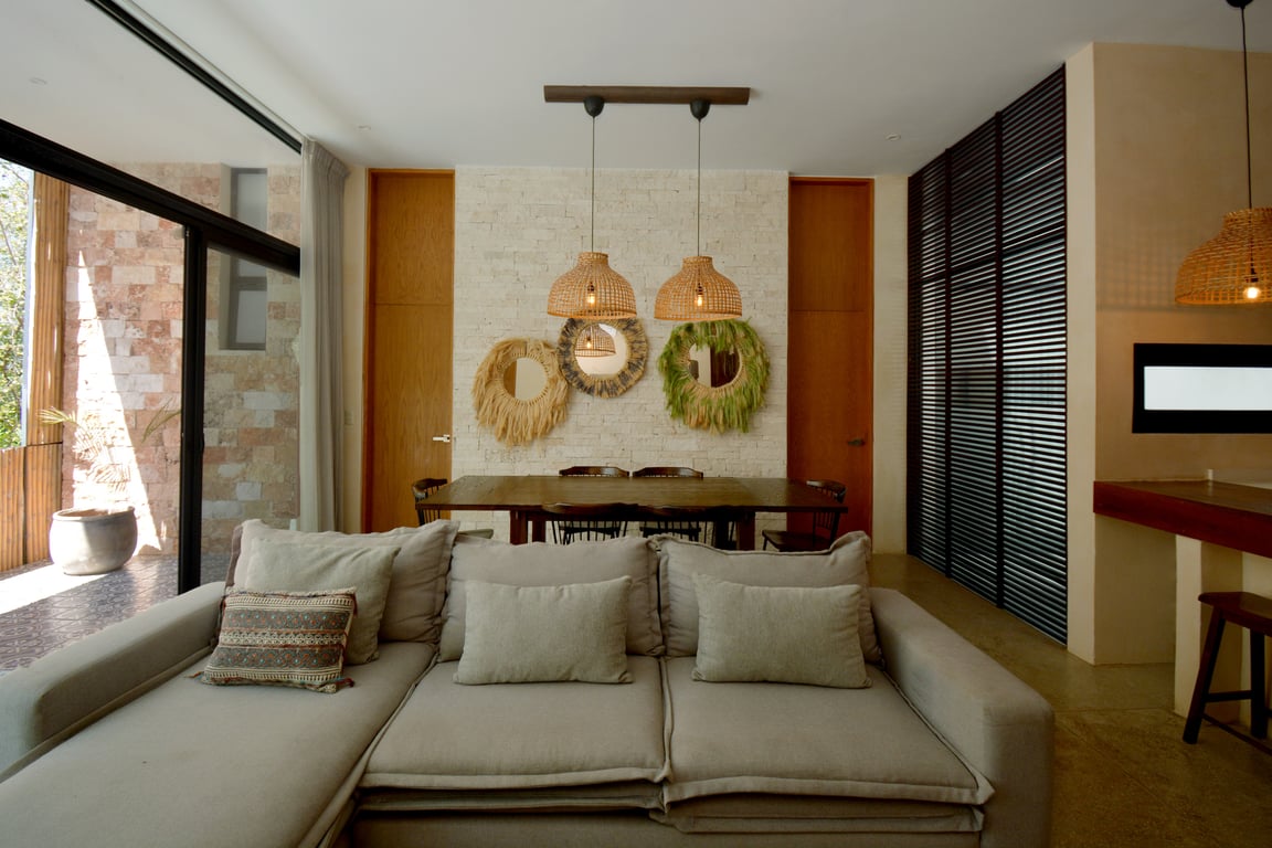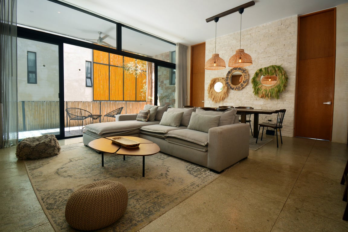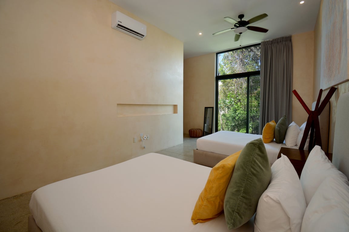 Manor Tulum's architectural philosophy celebrates biophilic design at its finest. Floor-to-ceiling windows frame living canvases of tropical vegetation, flooding the 1,582 square feet of interior space with natural light while maintaining perfect ventilation. The second-floor positioning provides elevated views of the lush jungle canopy and sparkling pool below, creating a treehouse-like ambiance that defines modern Tulum living. Premium quartz countertops grace both the kitchen and bathrooms, while high ceilings and sophisticated wall coverings elevate every room to gallery-worthy status.