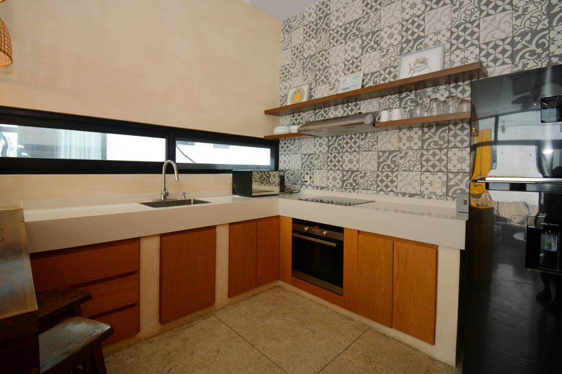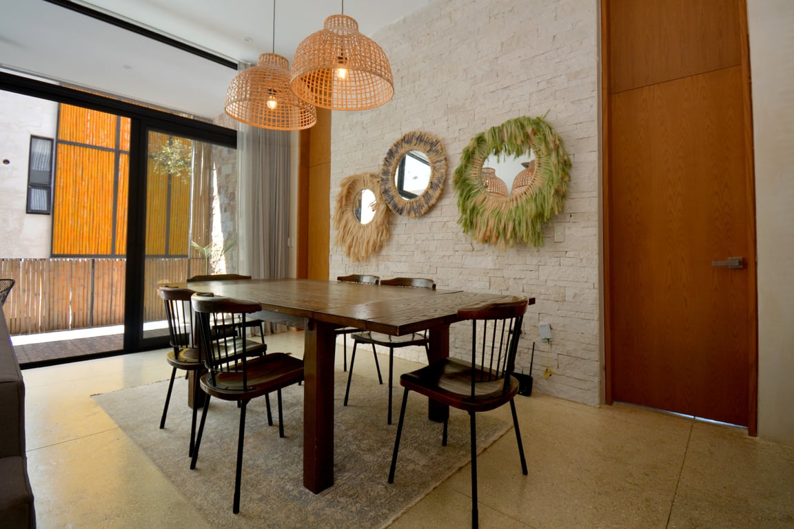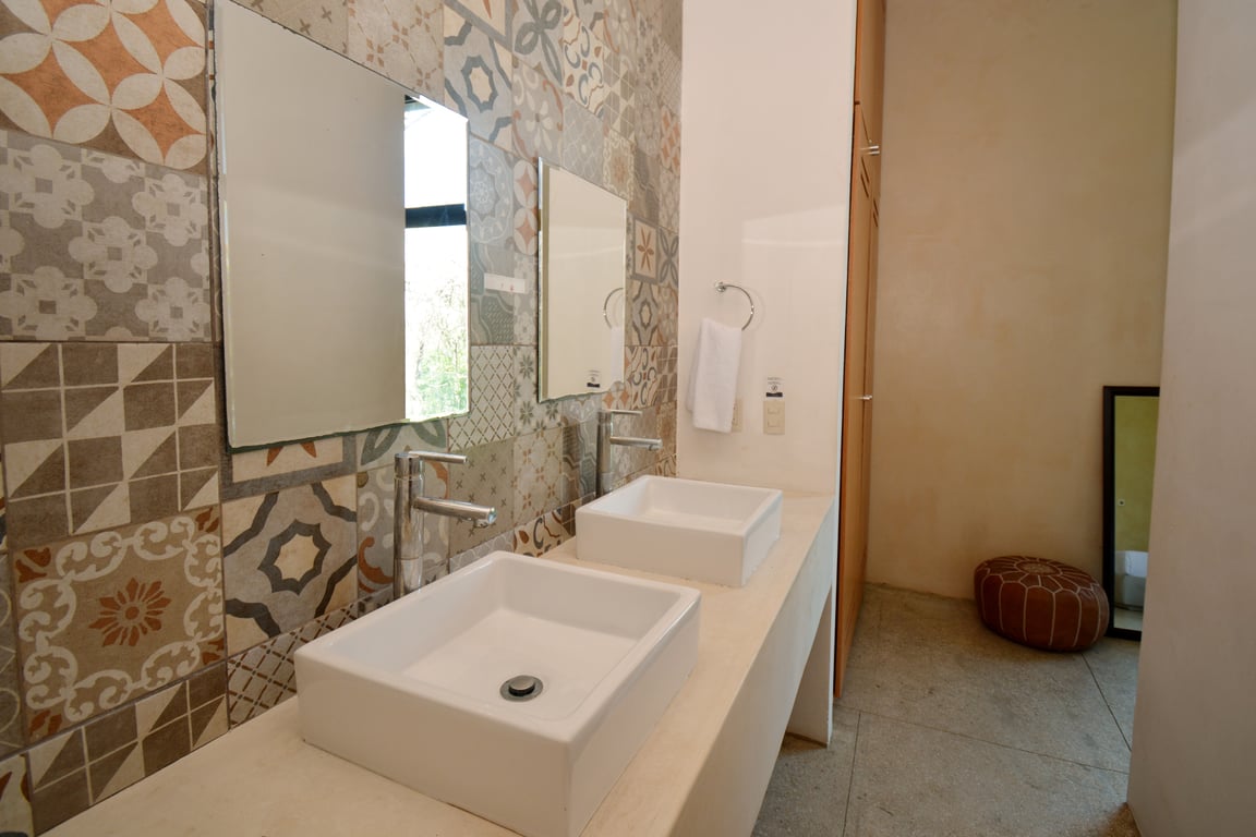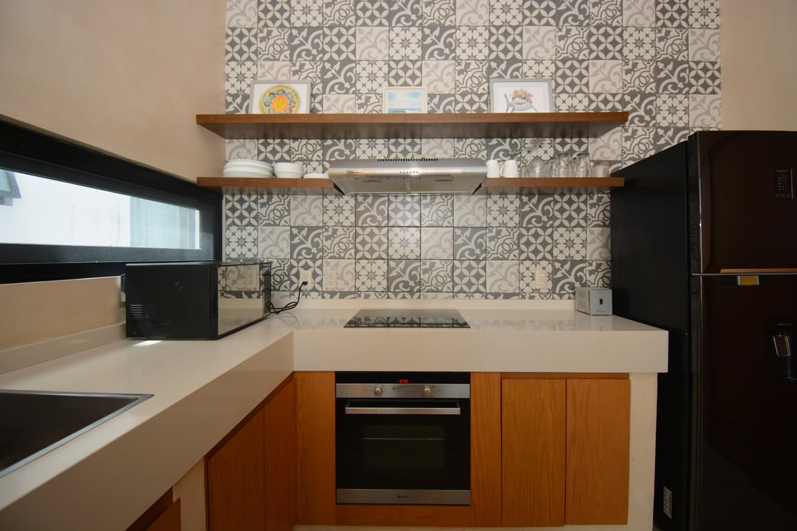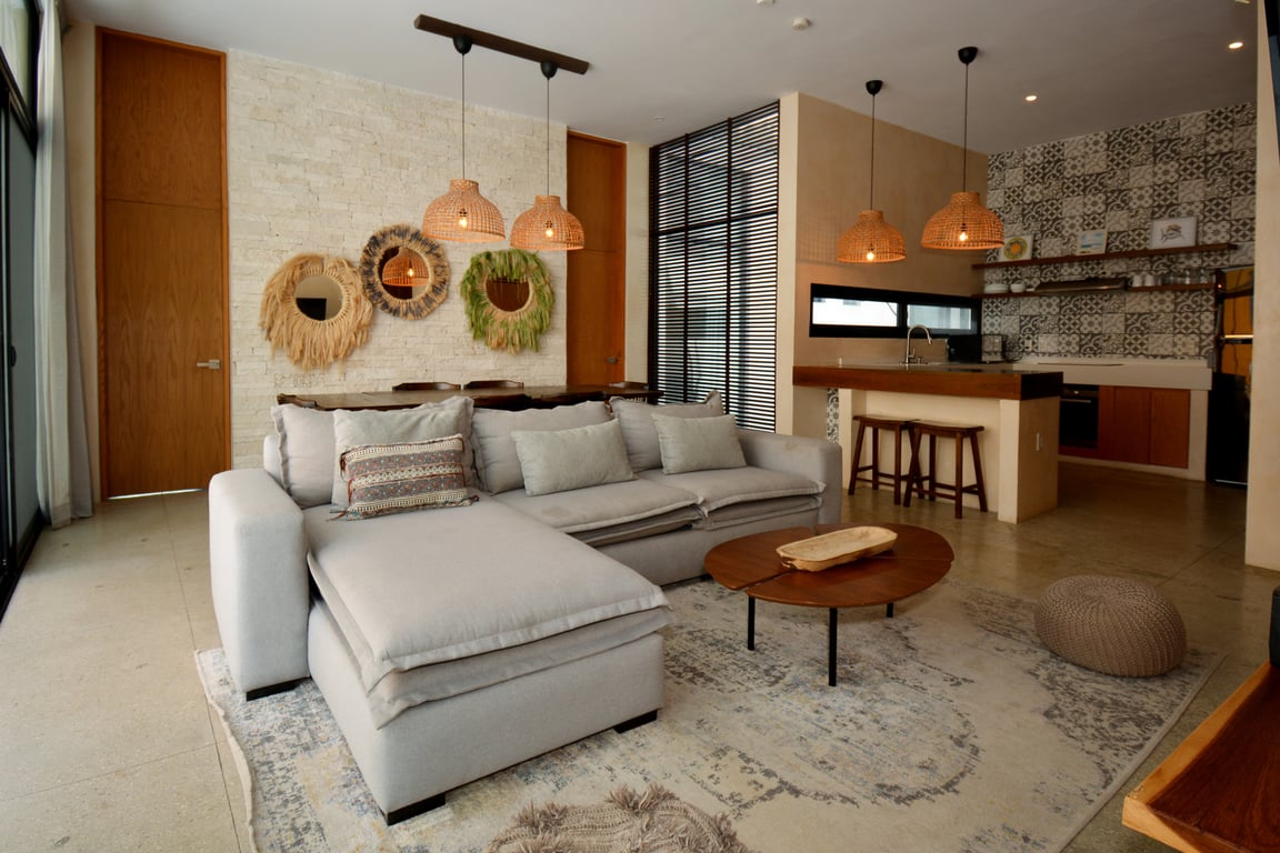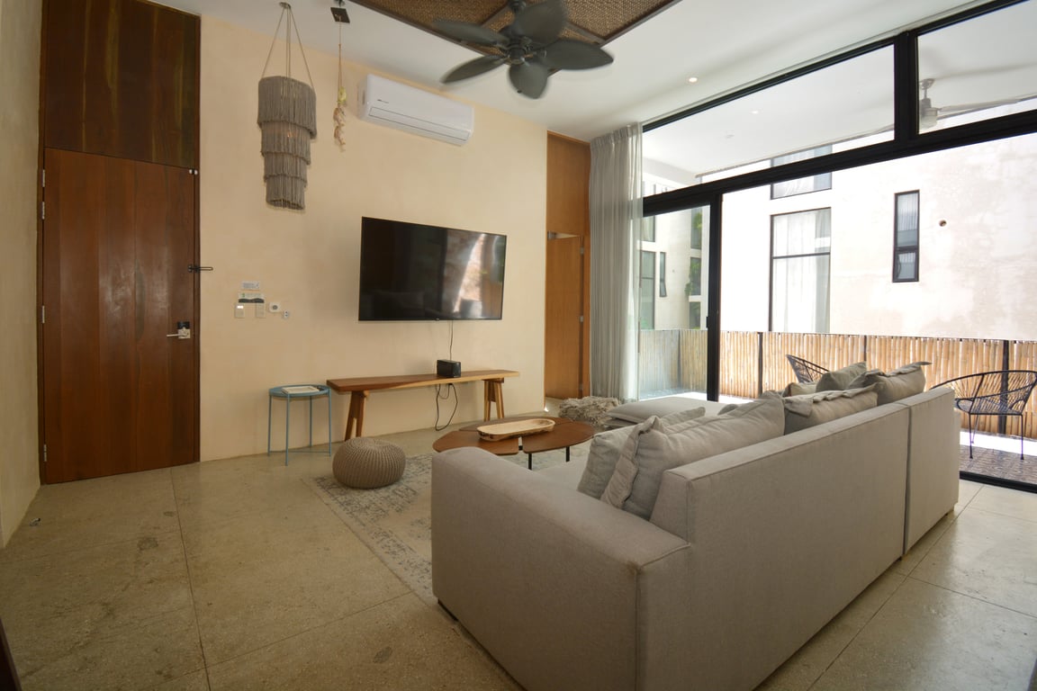 Manor Tulum's architectural philosophy celebrates biophilic design at its finest. Floor-to-ceiling windows frame living canvases of tropical vegetation, flooding the 1,582 square feet of interior space with natural light while maintaining perfect ventilation. The second-floor positioning provides elevated views of the lush jungle canopy and sparkling pool below, creating a treehouse-like ambiance that defines modern Tulum living. Premium quartz countertops grace both the kitchen and bathrooms, while high ceilings and sophisticated wall coverings elevate every room to gallery-worthy status.