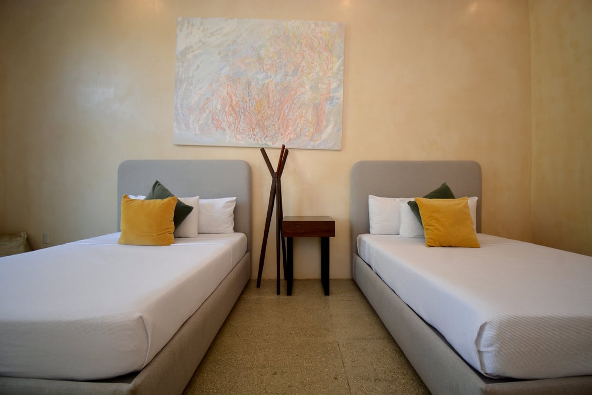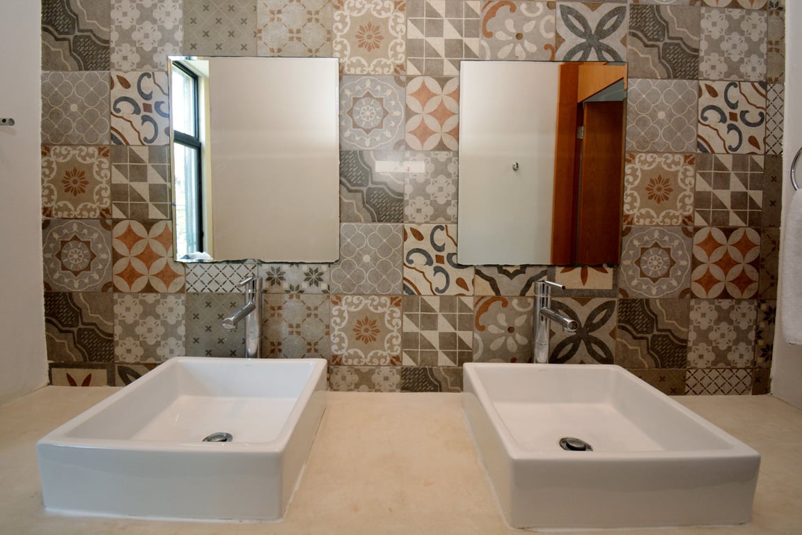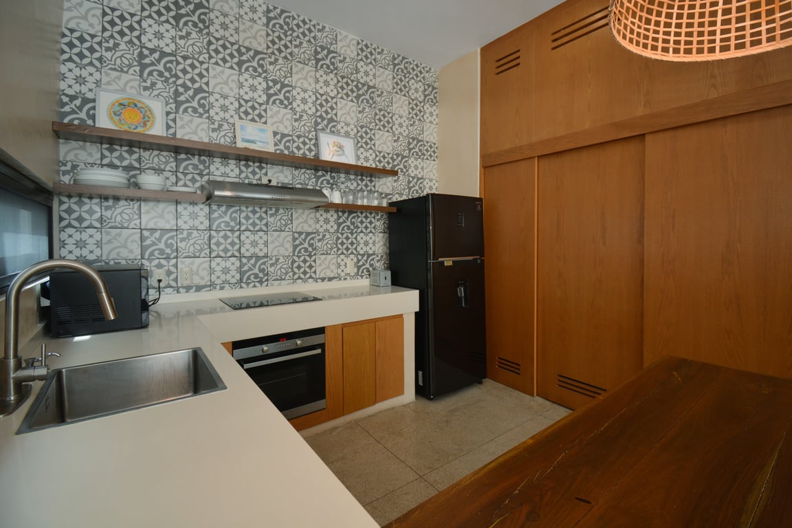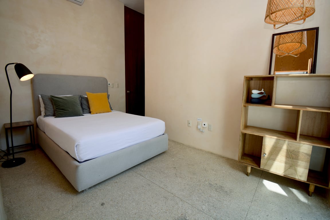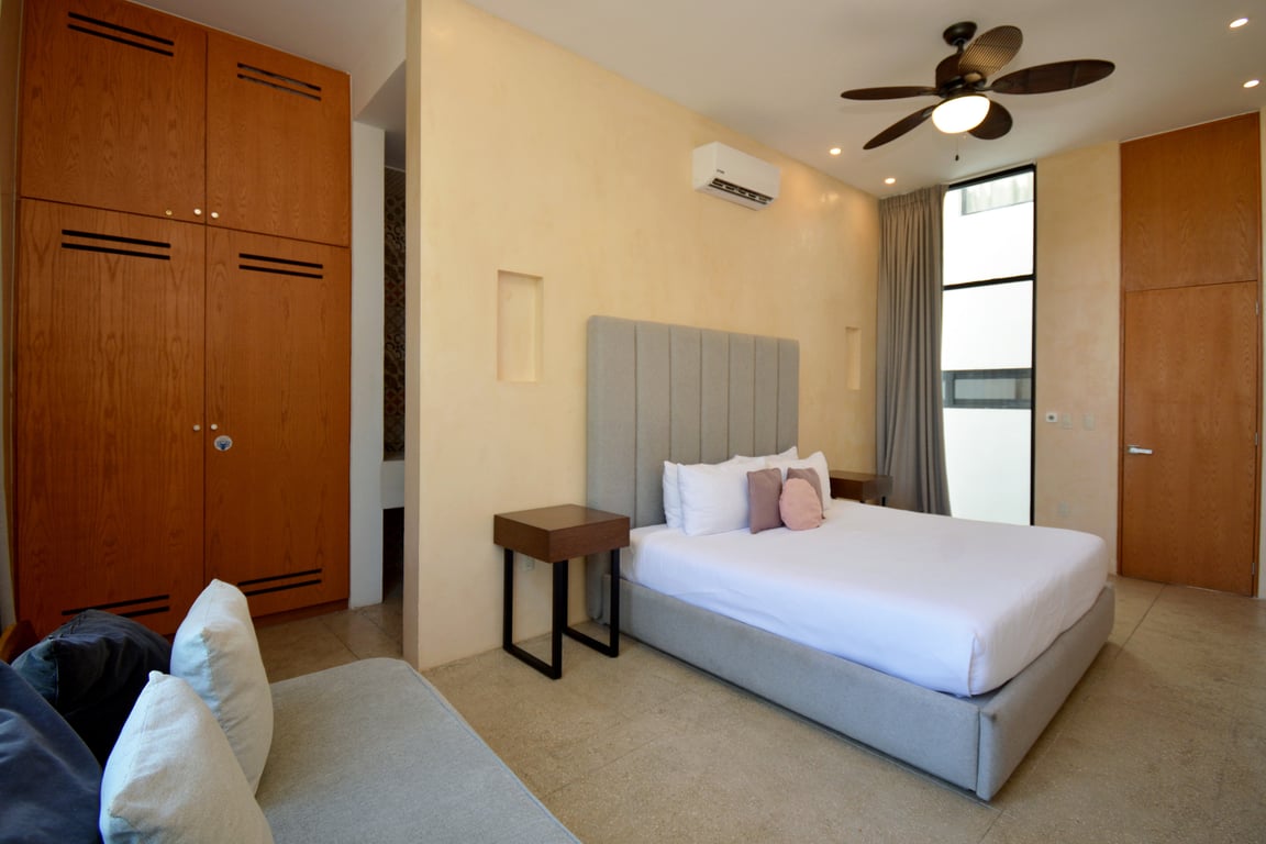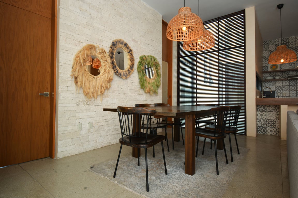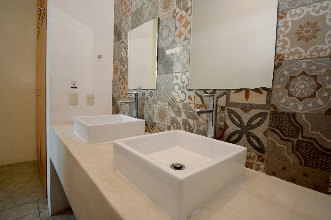 Manor Tulum's architectural philosophy celebrates biophilic design at its finest. Floor-to-ceiling windows frame living canvases of tropical vegetation, flooding the 1,582 square feet of interior space with natural light while maintaining perfect ventilation. The second-floor positioning provides elevated views of the lush jungle canopy and sparkling pool below, creating a treehouse-like ambiance that defines modern Tulum living. Premium quartz countertops grace both the kitchen and bathrooms, while high ceilings and sophisticated wall coverings elevate every room to gallery-worthy status.