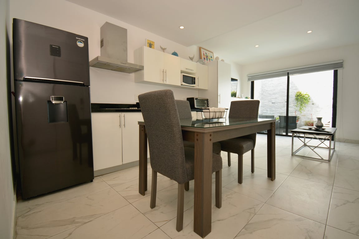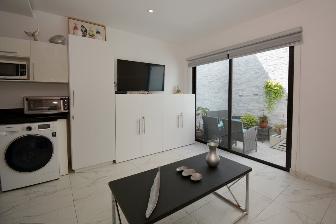 Built in 2018, this intimate 12-unit boutique building exemplifies modern Mexican architecture at its finest. The residence showcases a luminous interior palette featuring pristine white porcelain floors with elegant gray accents that create a sense of spaciousness and tranquility. Every detail has been carefully curated, from the granite kitchen countertops to the premium bathroom finishes, ensuring a living experience that exceeds expectations.