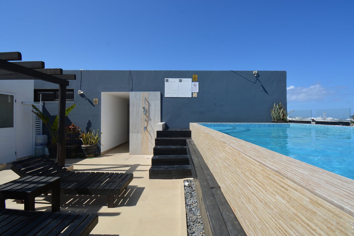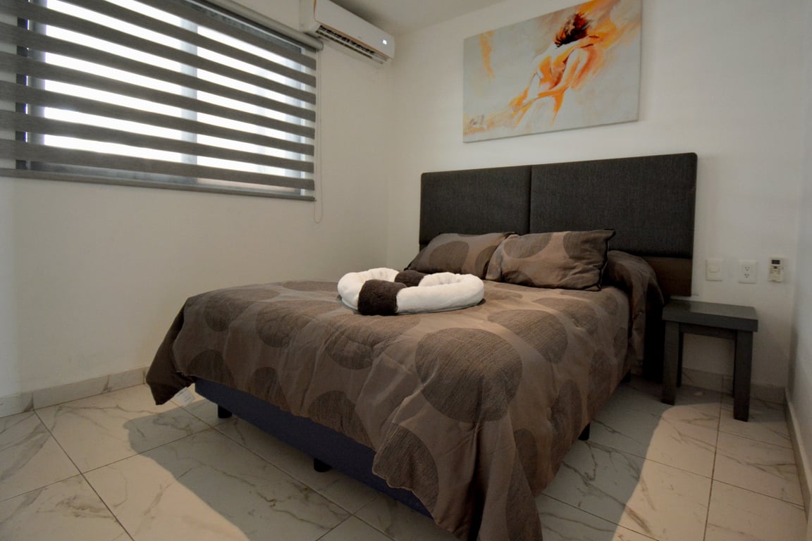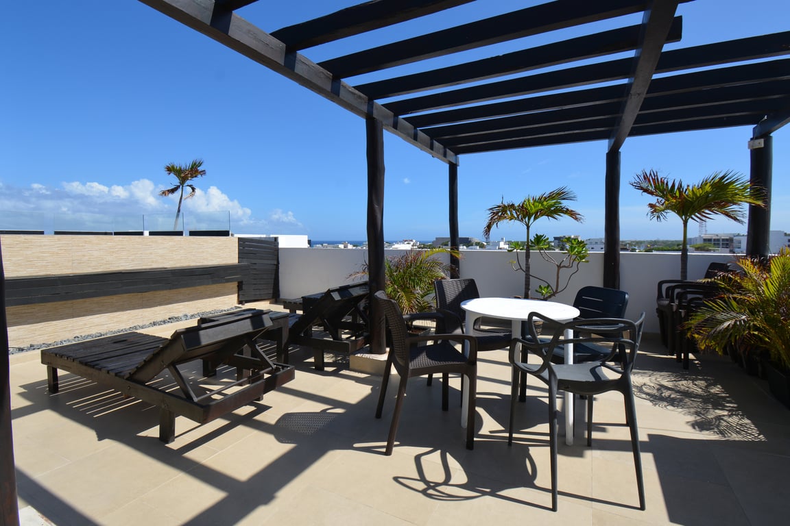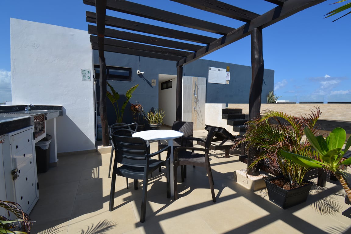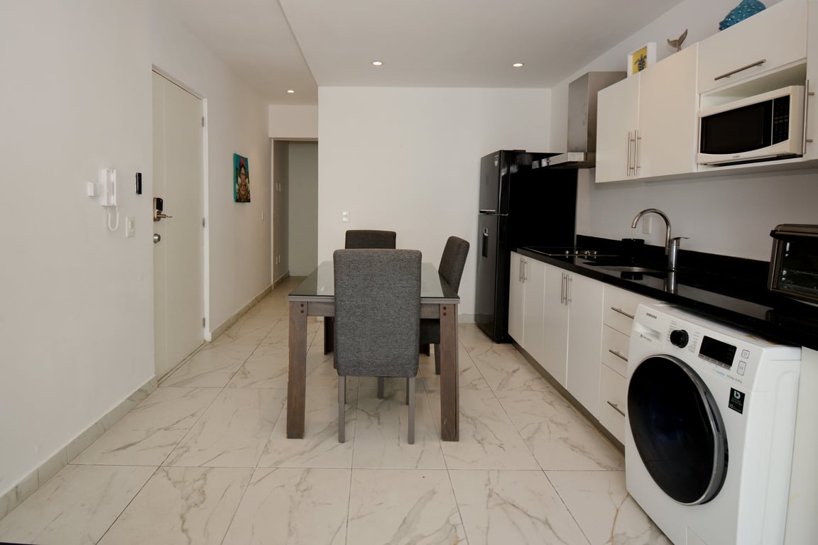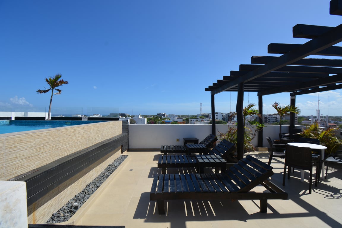 Spanning 542 square feet of intelligently designed space, this residence maximizes every inch to create a harmonious flow between indoor and outdoor living. The 417-square-foot interior features a well-appointed bedroom with generous closet space overlooking Calle 10 Norte, while the modern kitchen and bathroom demonstrate exceptional attention to quality. The crown jewel is the 125-square-foot private terrace, complete with an intimate plunge pool jacuzzi and seating area—your personal oasis for morning coffee or evening relaxation under the stars.
