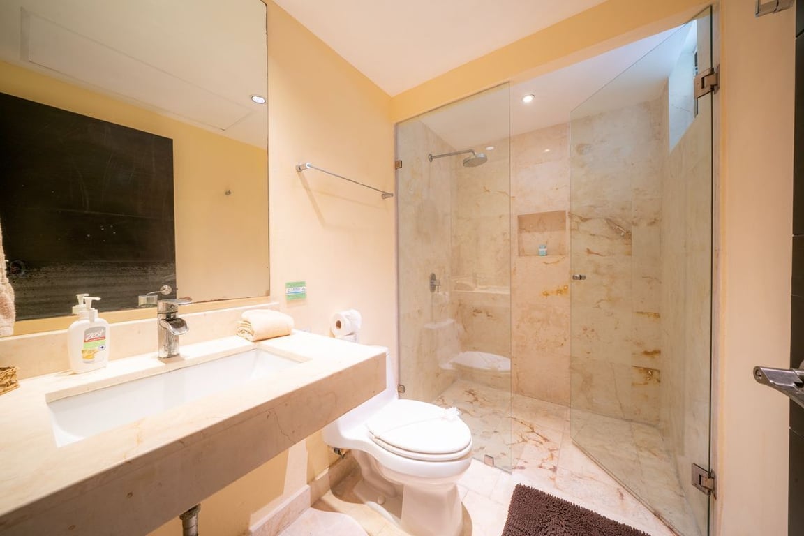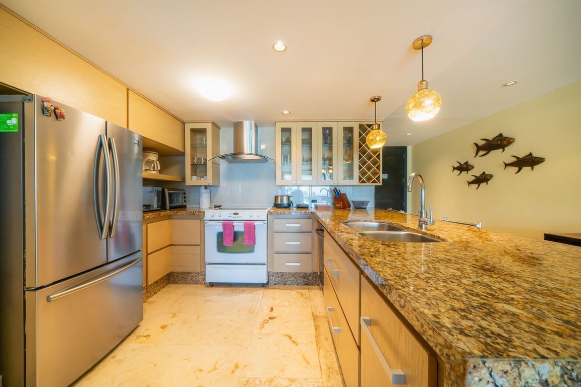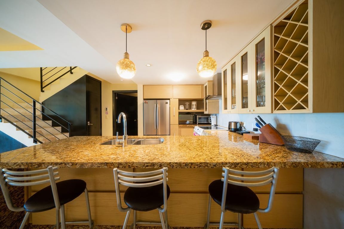 Your condo's main level furnishes the first guest bedroom with a king bed, ocean view. The second guest bedroom sits in the front of the condo and offers 2 single beds and a separate bathroom. These 2 rooms do not have ocean views. However, the fully-equipped kitchen, living room and dining room all provide ocean views. Lastly, the sea view balcony off the living room has lounge chairs and a patio table.