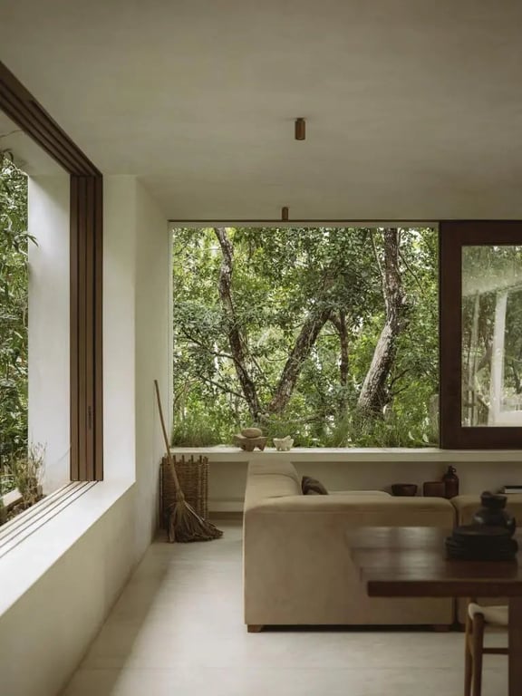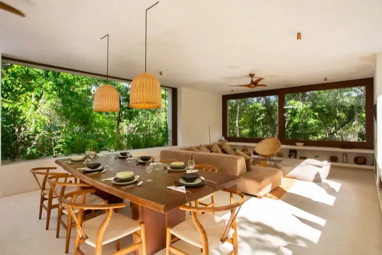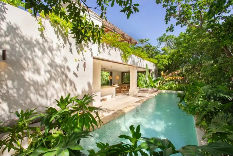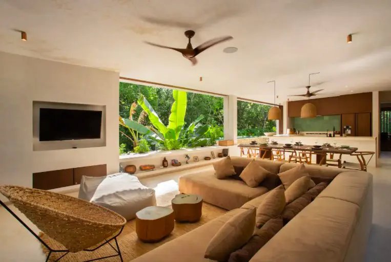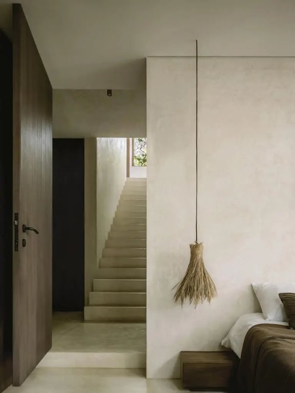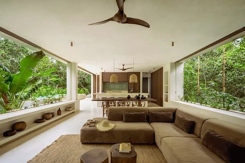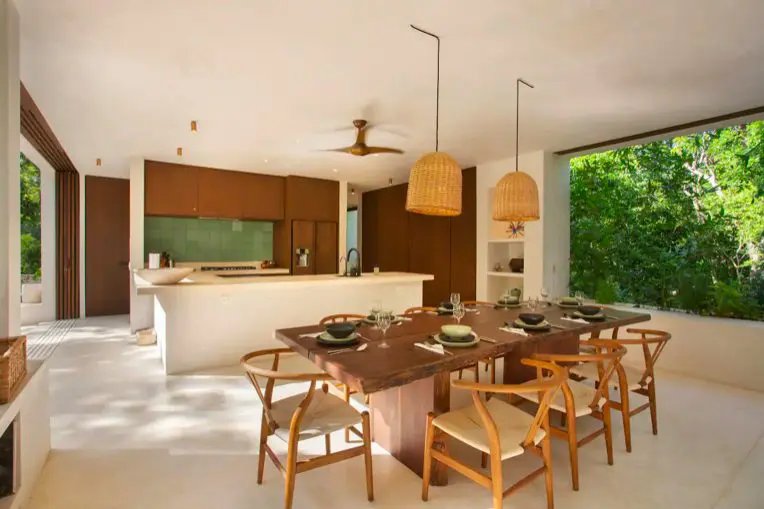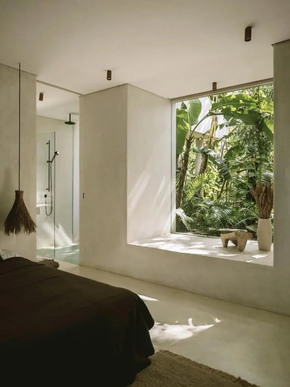 The journey home begins with an artfully crafted exterior staircase, wrapped in local stone quarried from the very earth it stands upon. As you ascend through carefully curated jungle landscaping past the shimmering pool, you're transported into a world where indoor and outdoor living merge seamlessly in the canopy.