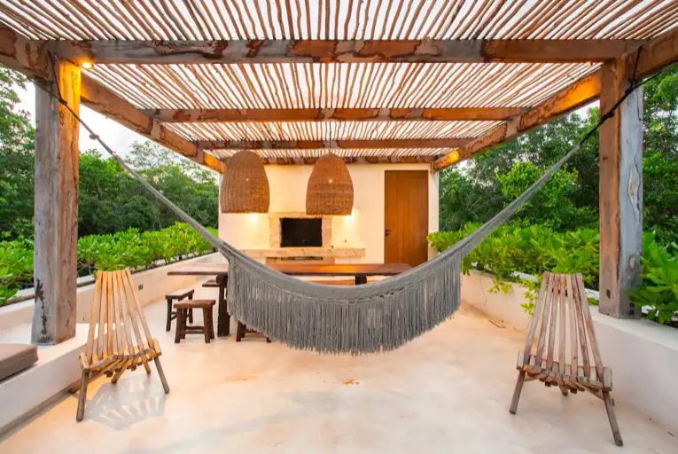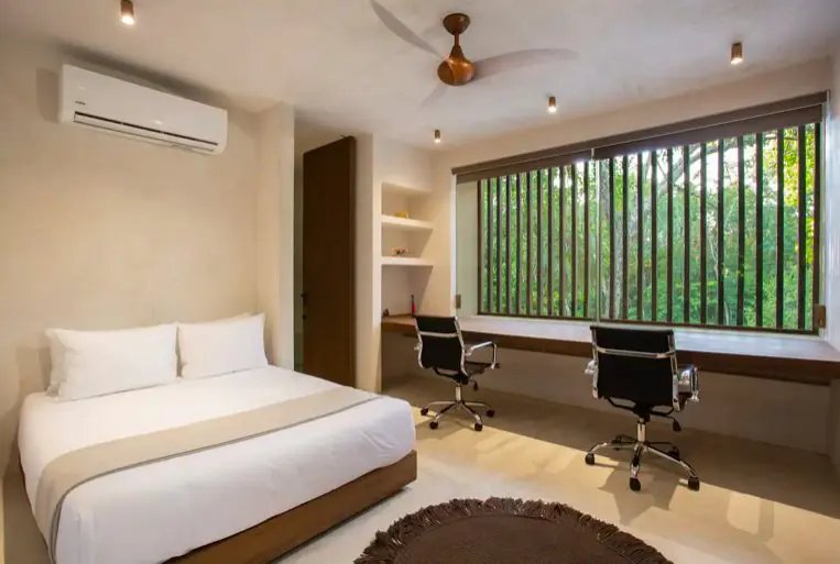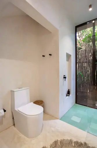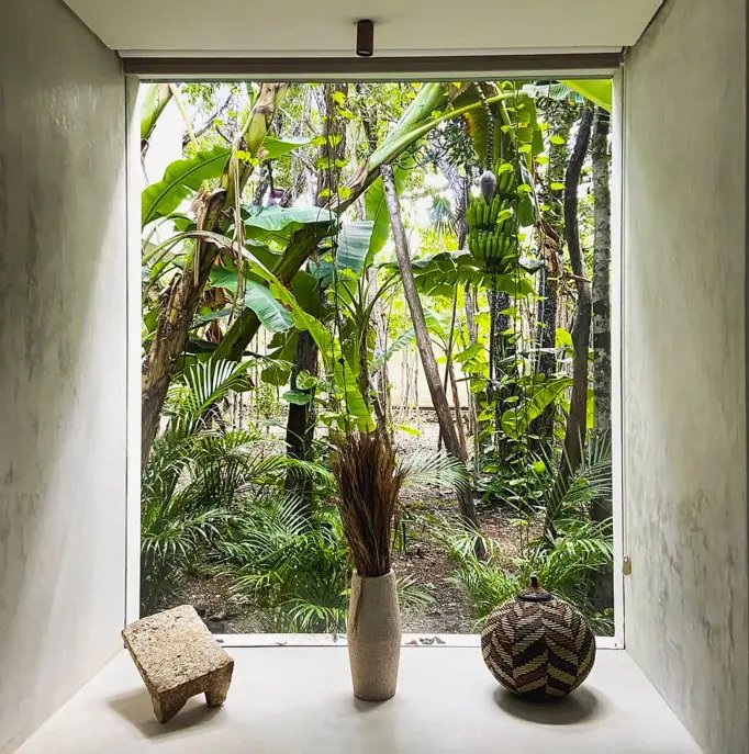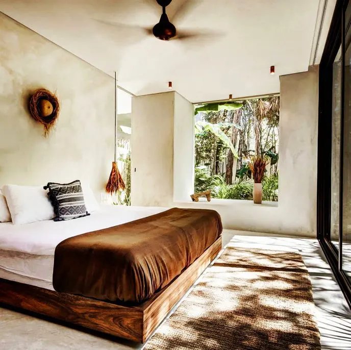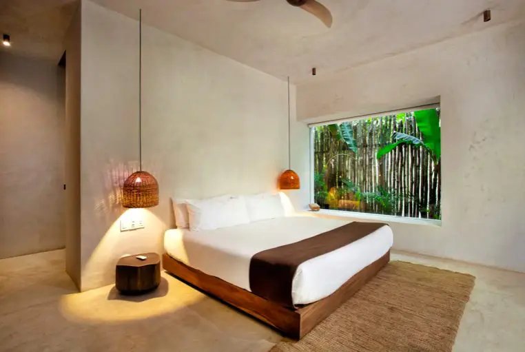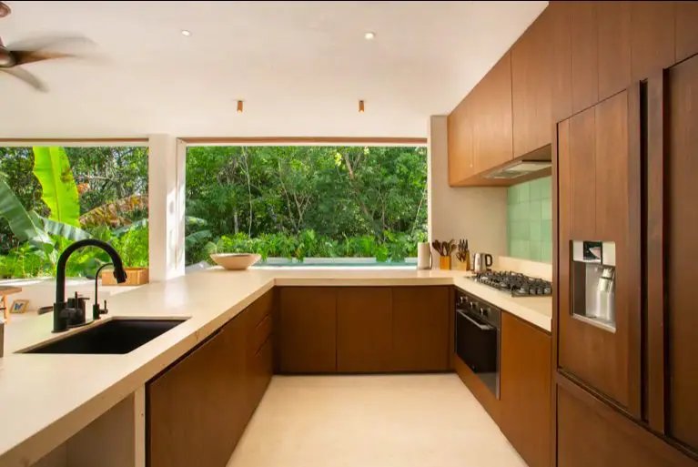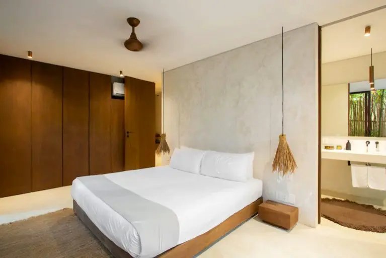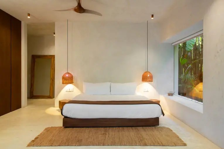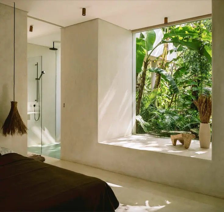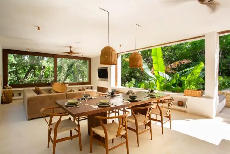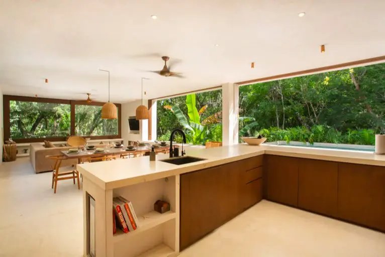 The main level showcases brilliant architectural thinking – sliding wooden windows on three sides pocket completely into the walls, transforming the space into an open-air sanctuary. Here, the kitchen, dining, and living areas flow as one continuous space, opening to an elevated swimming pool and terrace. Wraparound planters brim with aromatic herbs for your culinary adventures, while banana and papaya trees offer their fruit right at window level.