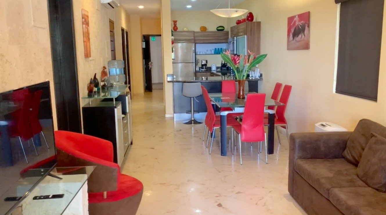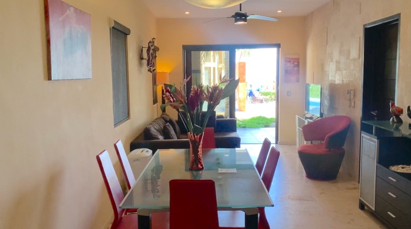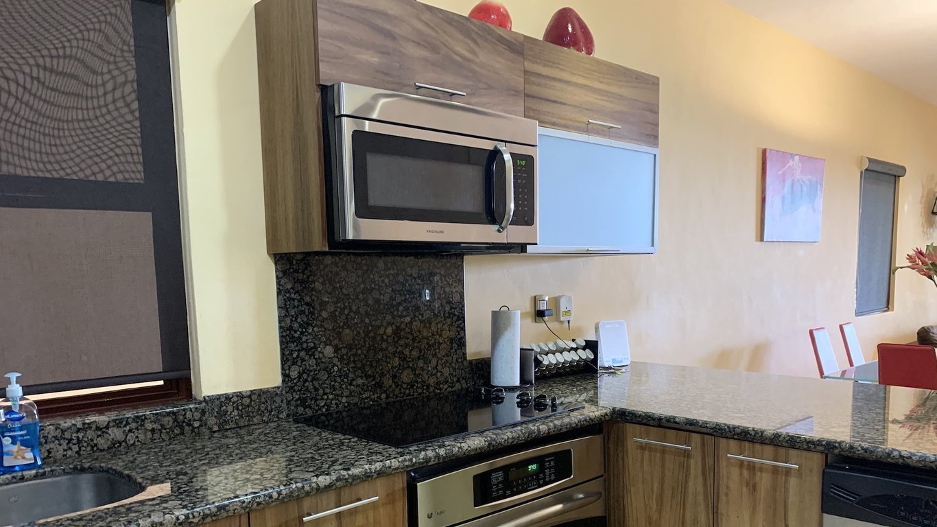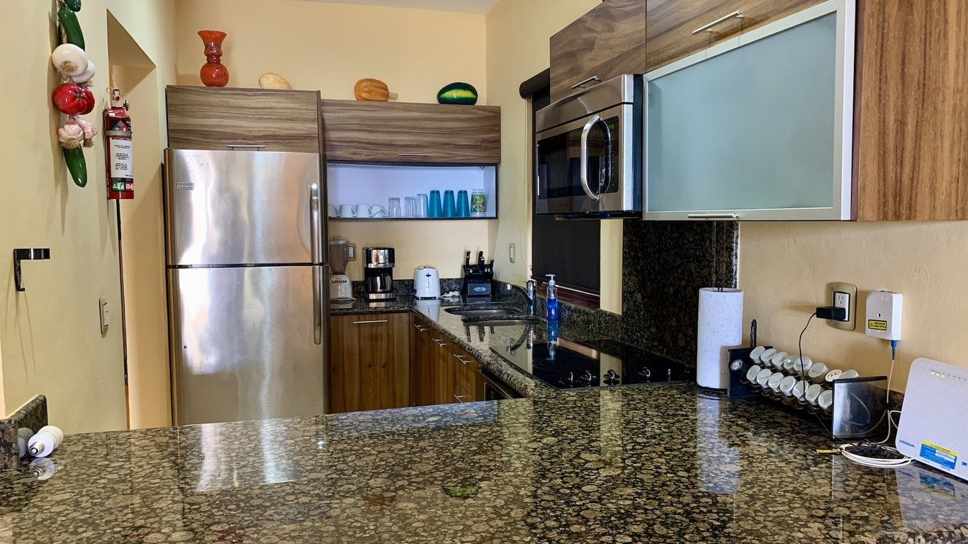 The fully equipped kitchen delivers everything needed for preparing casual breakfasts or elaborate dinners, showcasing gleaming granite countertops, quality appliances including full-size oven, cooktop with ventilation hood, double sink, and that increasingly rare amenity in beachfront properties—a built-in dishwasher. The substantial dining table seats six comfortably, while the adjacent living room provides relaxing space with comfortable seating and entertainment options for quieter evenings when you're not exploring Playa del Carmen's legendary restaurant scene just minutes away.