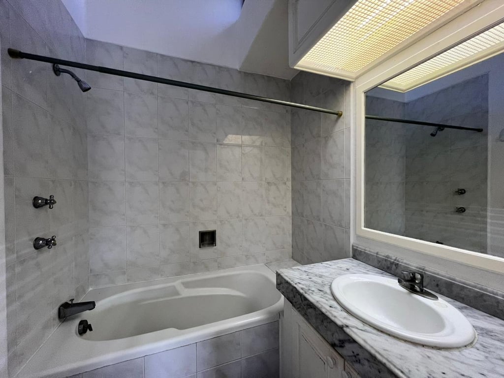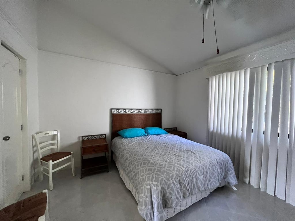Upstairs, two generous bedrooms provide peaceful retreats from the world below. The master suite features a spacious walk-in closet that will delight even the most discerning wardrobe enthusiast, while both bedrooms benefit from the home's central air conditioning system that maintains perfect comfort regardless of the tropical heat outside. The 2.5 bathrooms showcase marble-style tile work and granite vanities, with the main bath offering a relaxing soaking tub perfect for unwinding after beach days. A dedicated service quarters and laundry room add practical convenience for full-time living or vacation rental management.