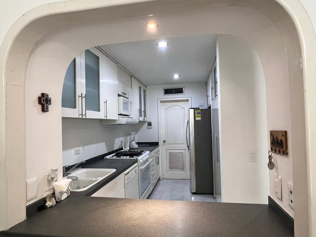 The thoughtfully designed layout spans two levels totaling 127.5 square meters, maximizing both living space and privacy. The main floor welcomes you with an open-concept living and dining area that flows naturally into the fully equipped kitchen, where elegant granite countertops and modern appliances stand ready for everything from quick breakfasts to elaborate dinner preparations. The charming arched passthrough between kitchen and living spaces adds architectural interest while maintaining the home's open, airy feel. Quality porcelain tile flooring throughout ensures both beauty and easy maintenance in the tropical climate.