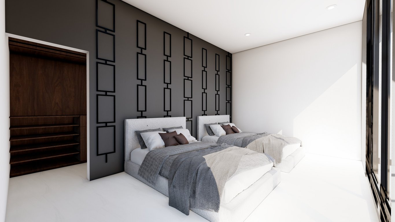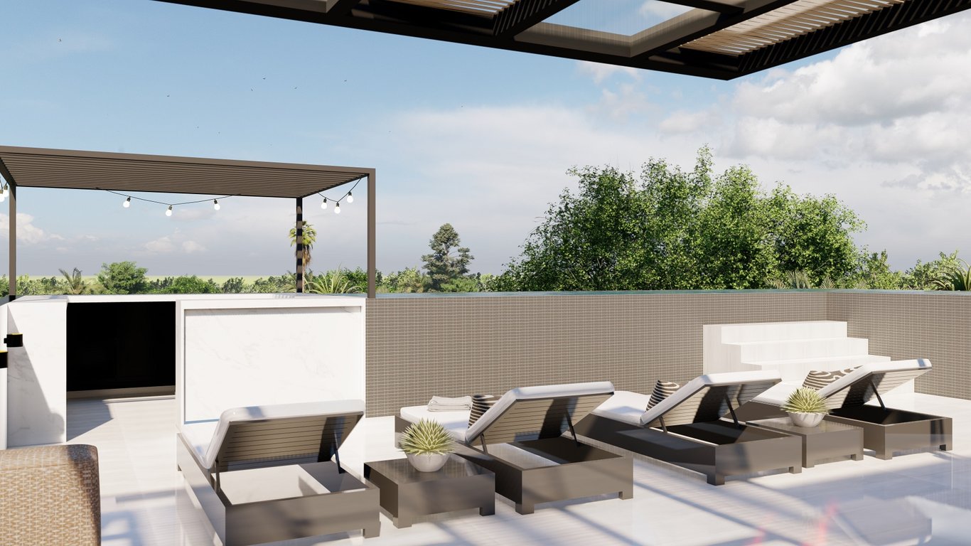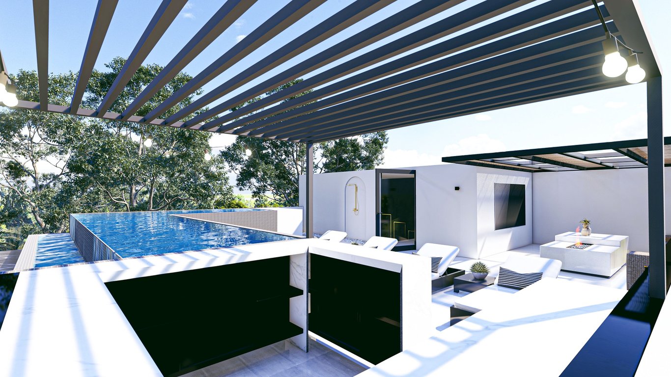 The property offers five luxurious bedroom suites with en-suite bathrooms, accommodating up to 16 guests comfortably. The outdoor living spaces are equally impressive, featuring a 40-foot swim-up pool, outdoor cinema, professional kitchen with BBQ station, and an alfresco dining area. The rooftop oasis adds another dimension of luxury with its L-shaped infinity pool, swim-up bar, and panoramic views of the surrounding landscape.