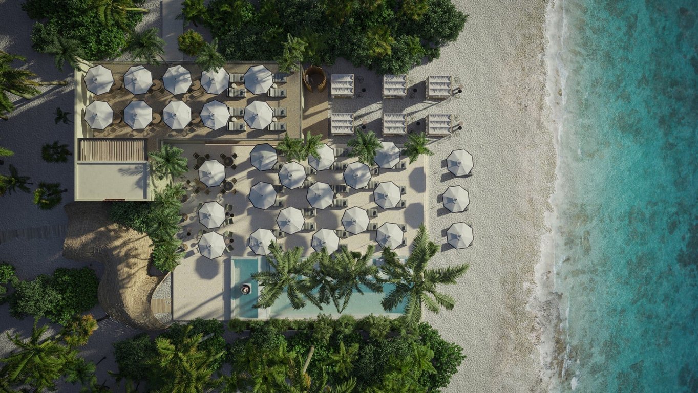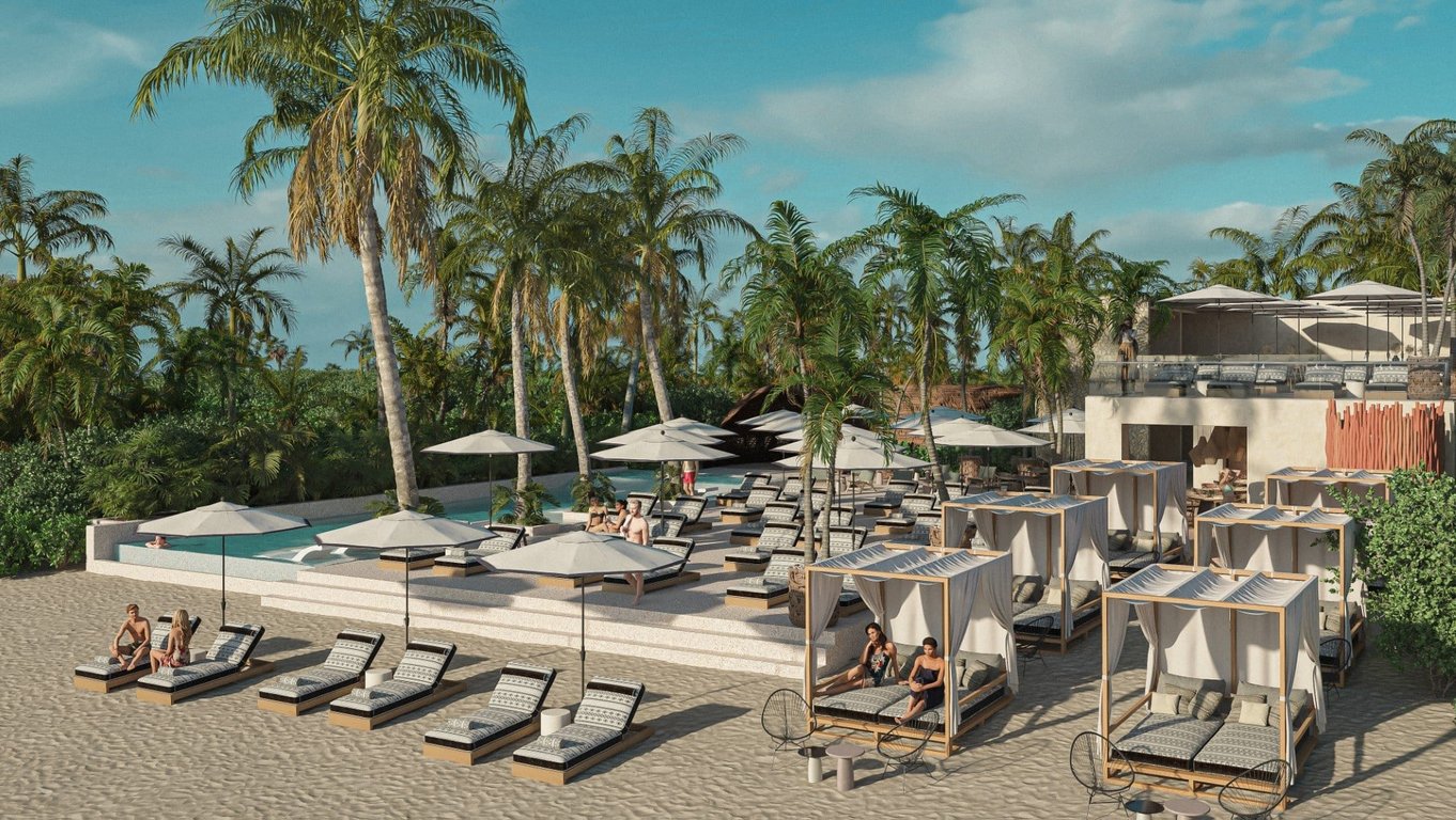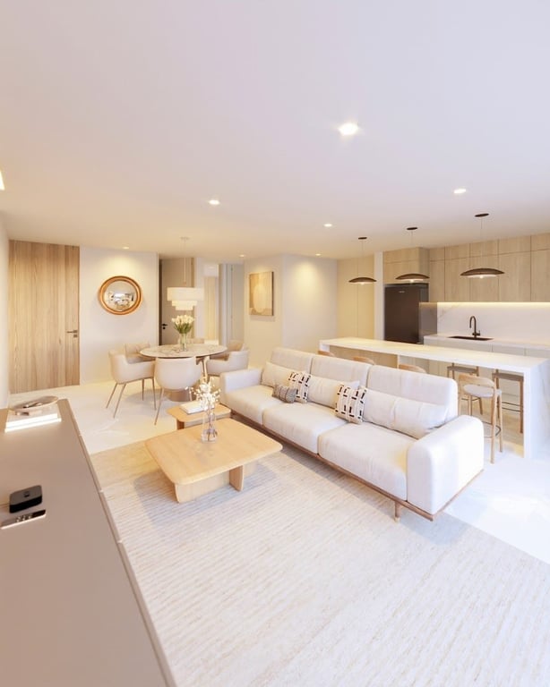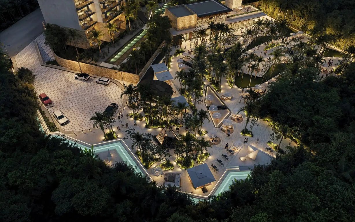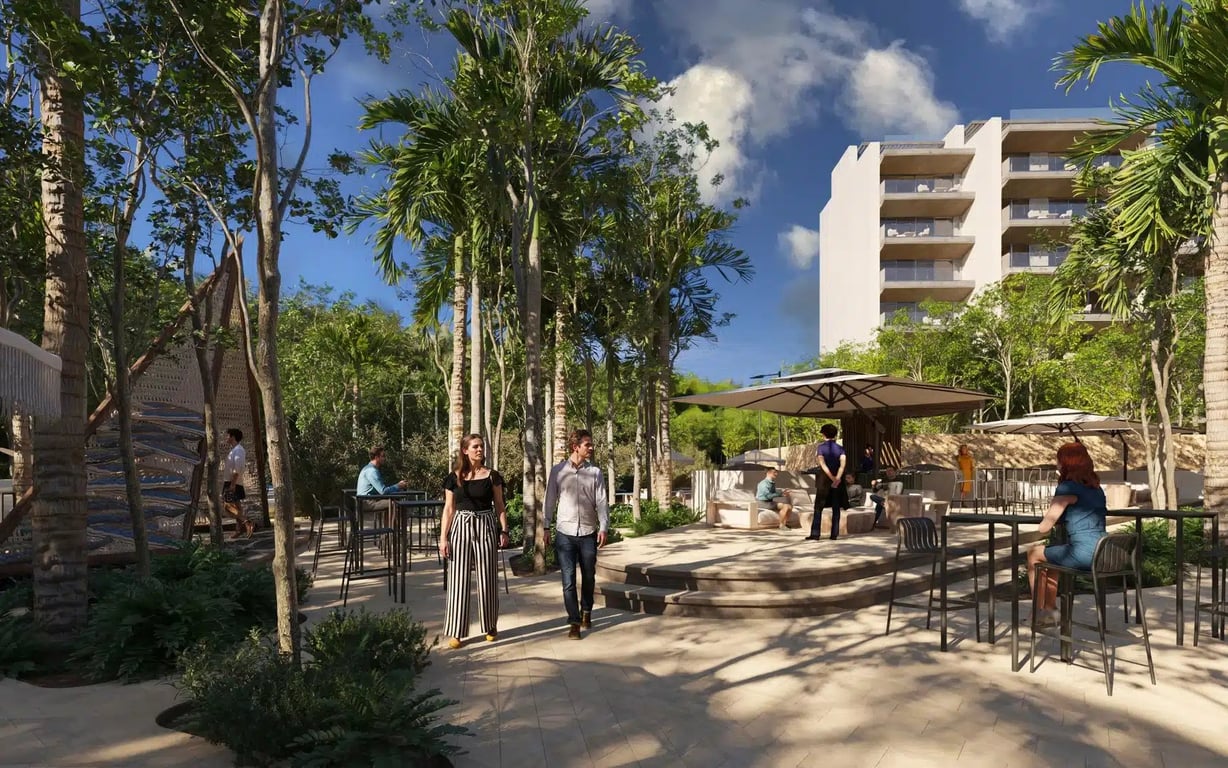 Distrito Xcalacoco Beach centers around a landscaped resort-style courtyard featuring a large swimming pool, 25-meter lap pool, outdoor jacuzzi, wellness center, fully equipped gym, and dedicated coworking spaces. An integrated commercial plaza will include restaurants, cafés, boutique shops, a convenience store, and social areas serving the community while maintaining the residential atmosphere.