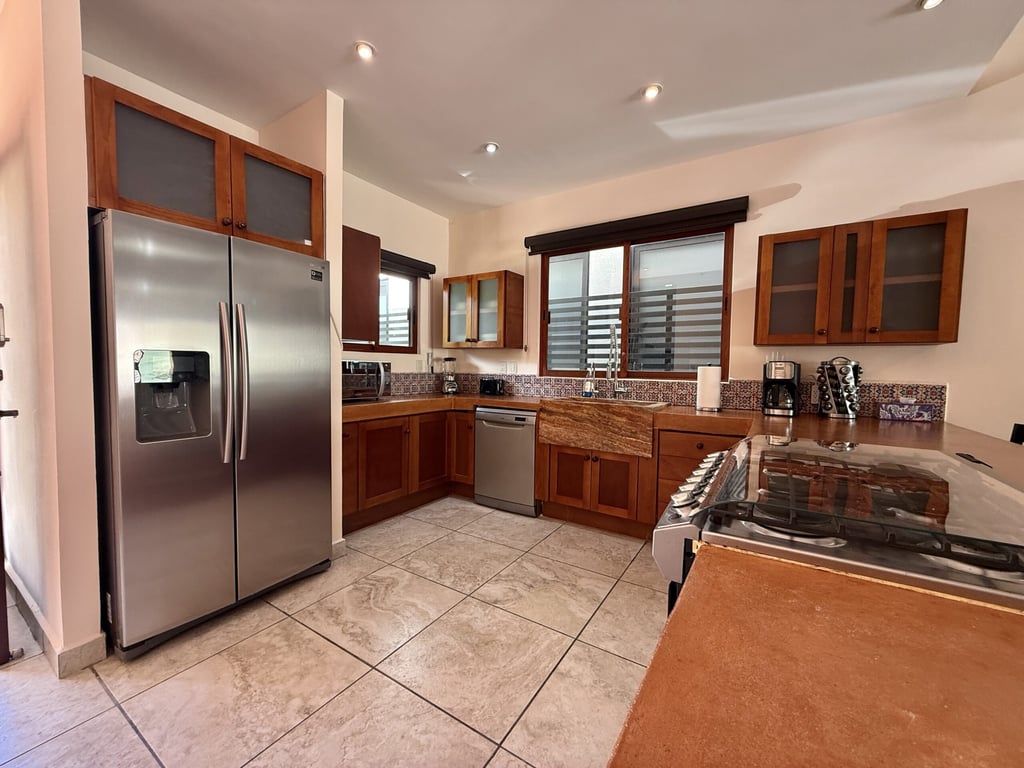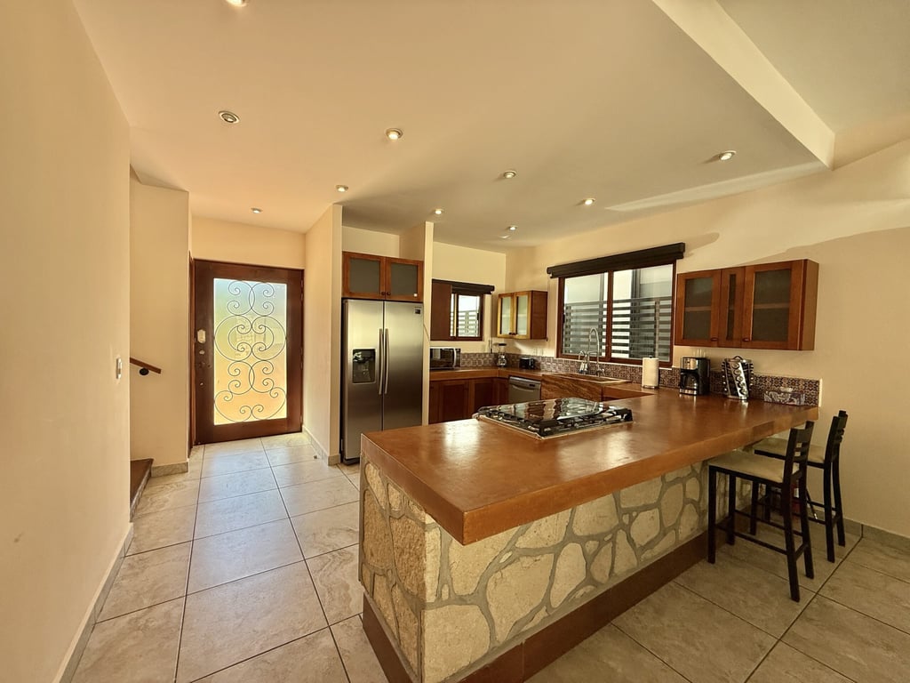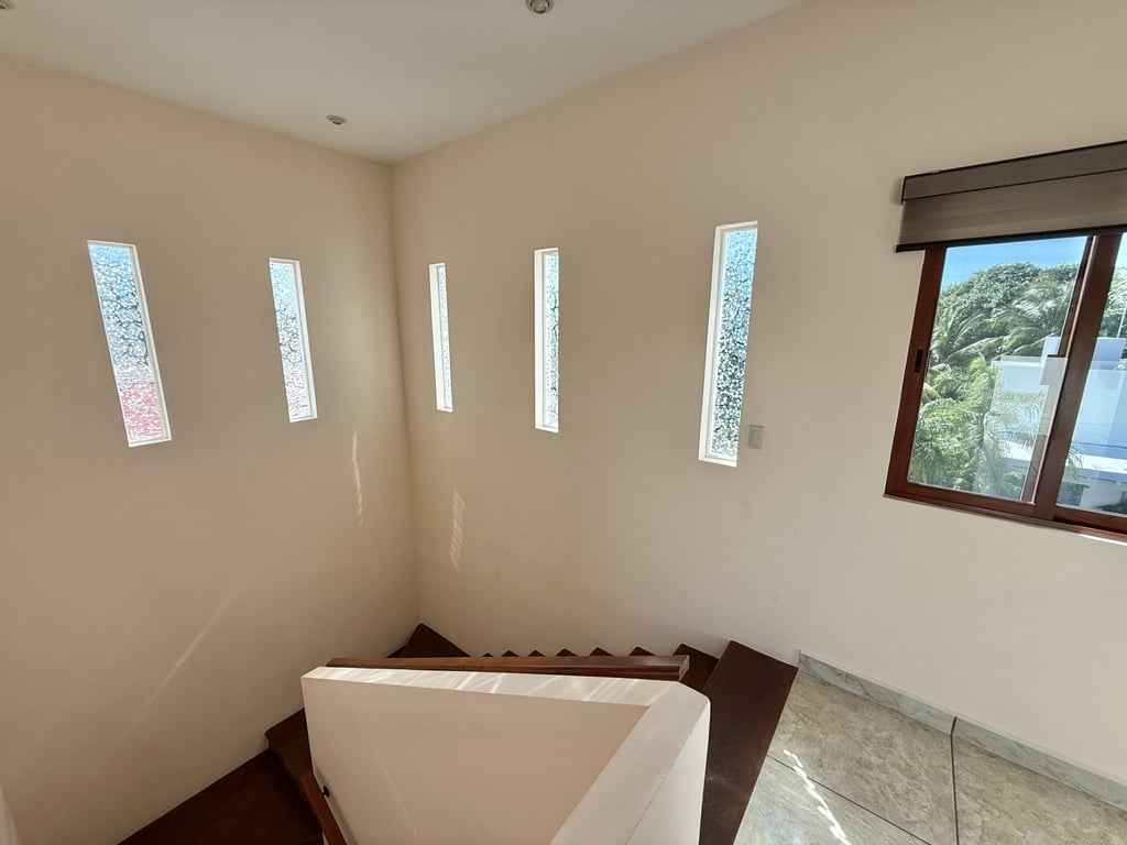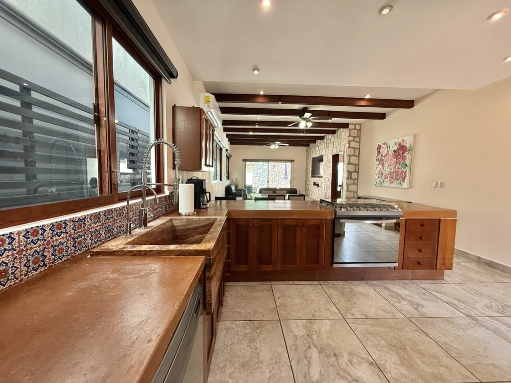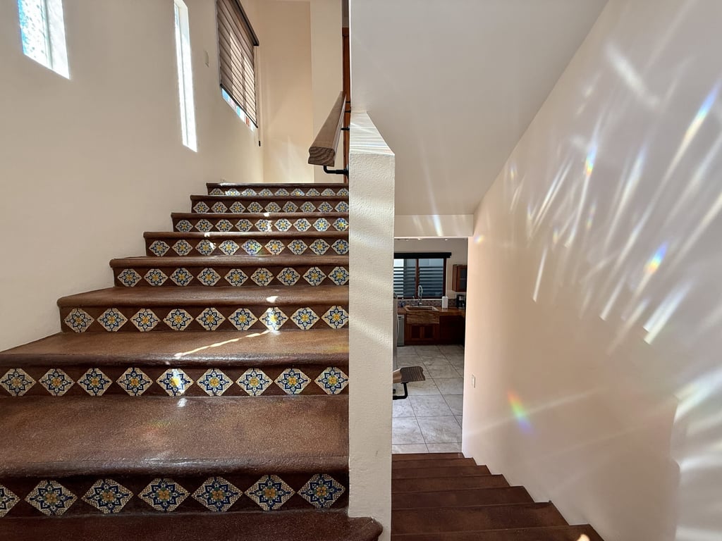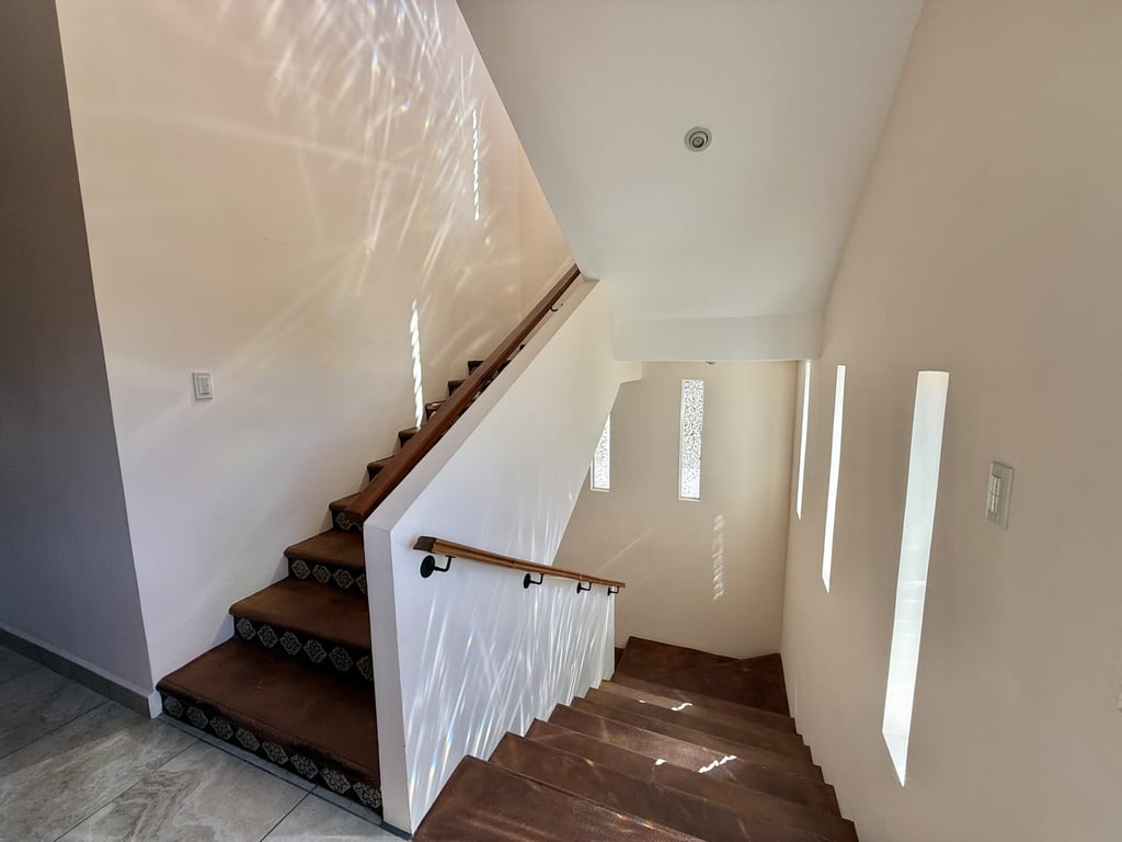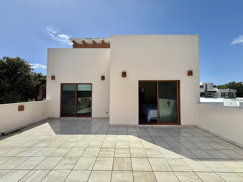This three-level home in El Cielo combines thoughtful design with authentic Mexican character across 254 square meters of living space. The layout emphasizes natural light and cross ventilation, with generous terraces on each level and handcrafted details throughout including mosaic accents, fine wood carpentry, and artisanal stone finishes. Solar panels provide energy efficiency, while the fully furnished interiors are move-in ready.