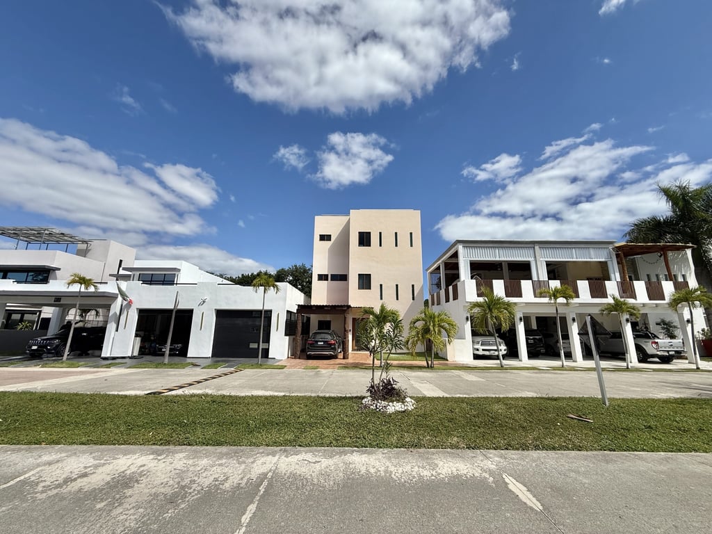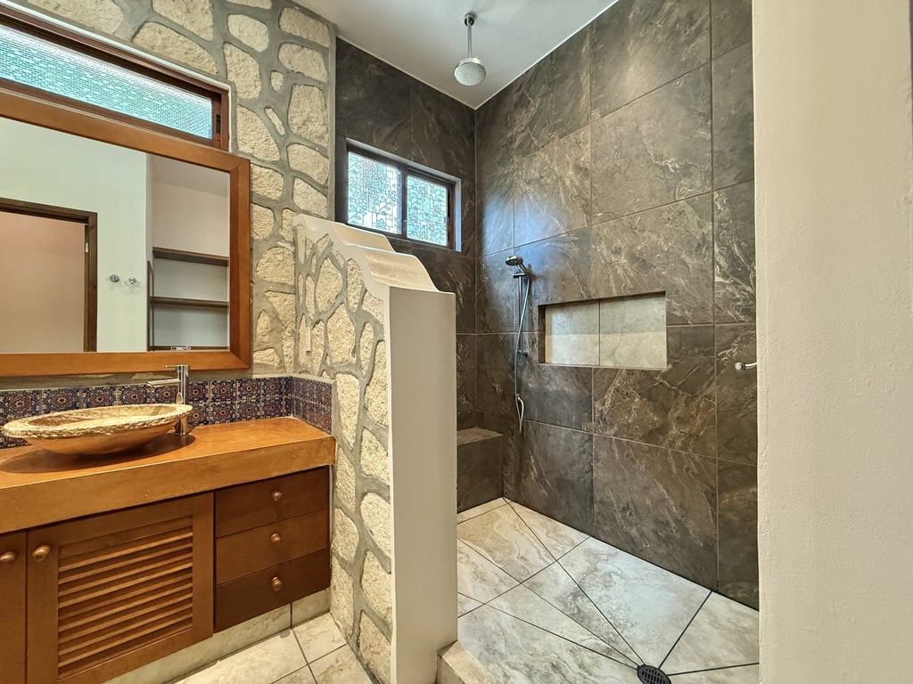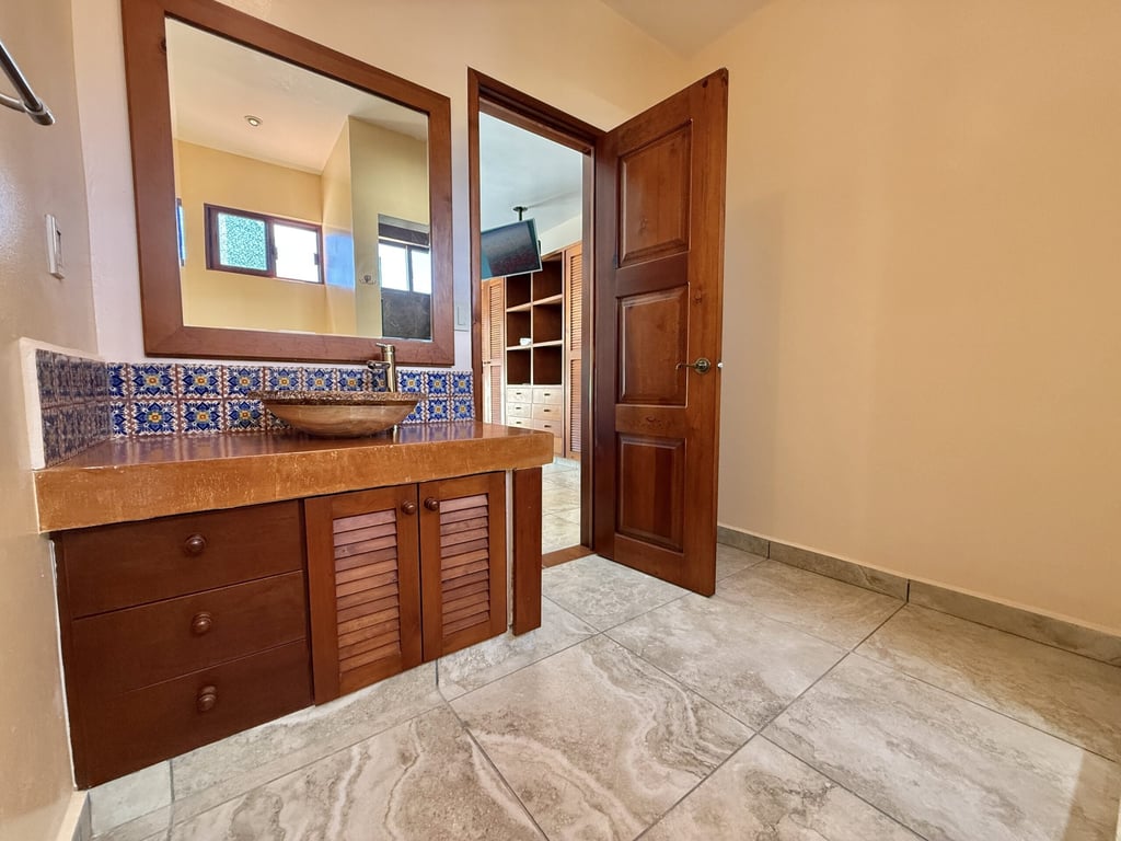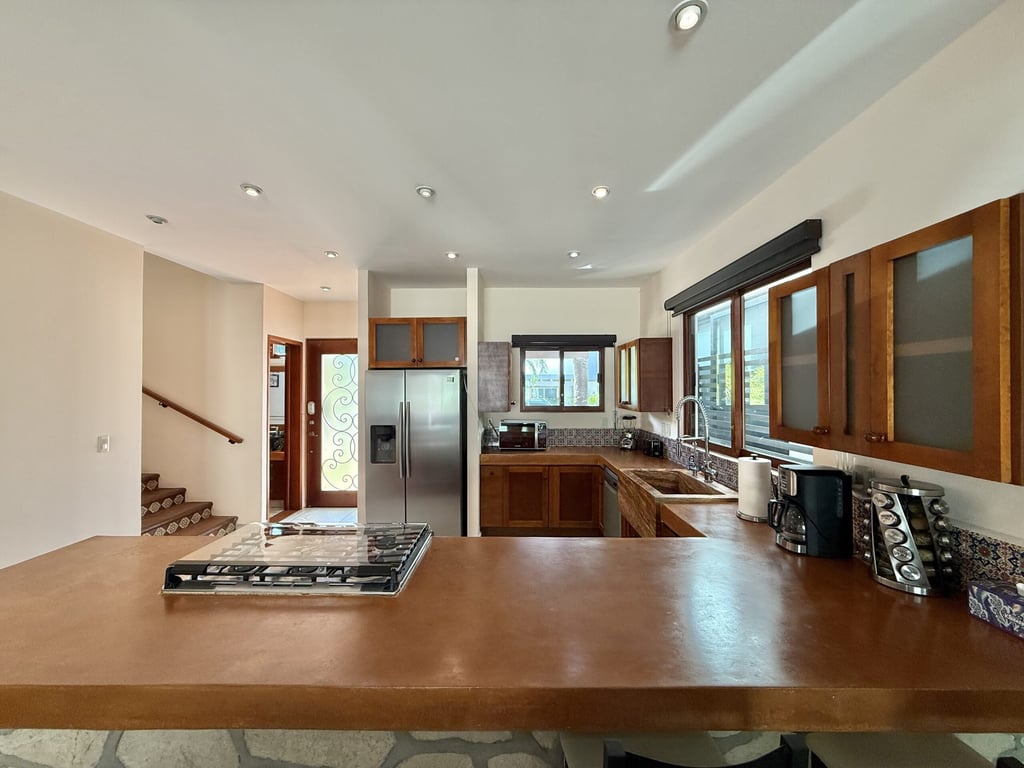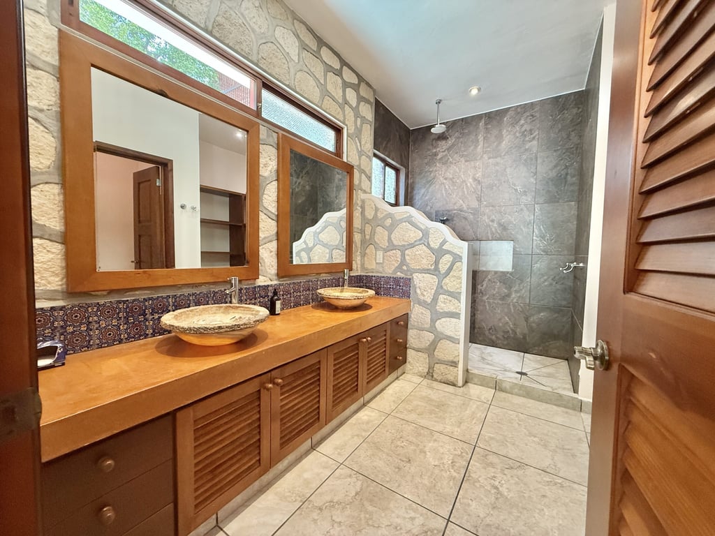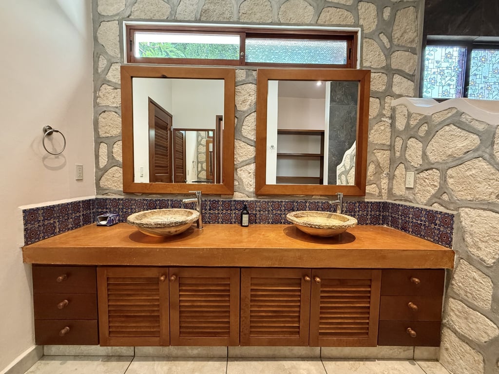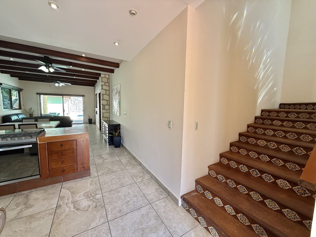 This three-level home in El Cielo combines thoughtful design with authentic Mexican character across 254 square meters of living space. The layout emphasizes natural light and cross ventilation, with generous terraces on each level and handcrafted details throughout including mosaic accents, fine wood carpentry, and artisanal stone finishes. Solar panels provide energy efficiency, while the fully furnished interiors are move-in ready.