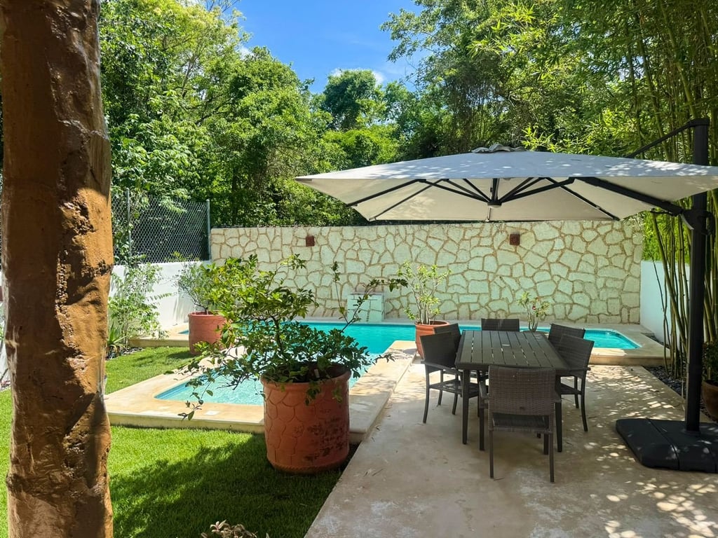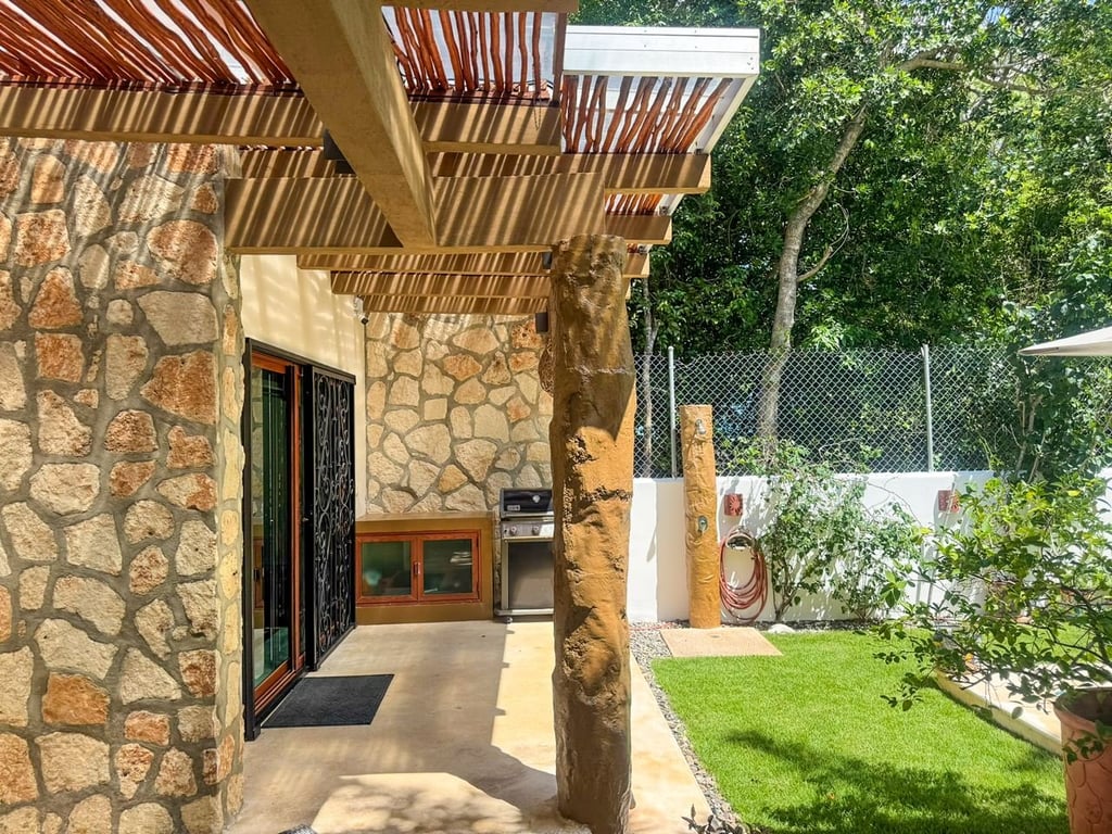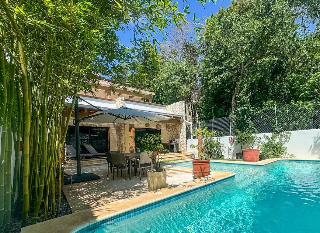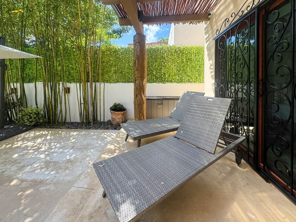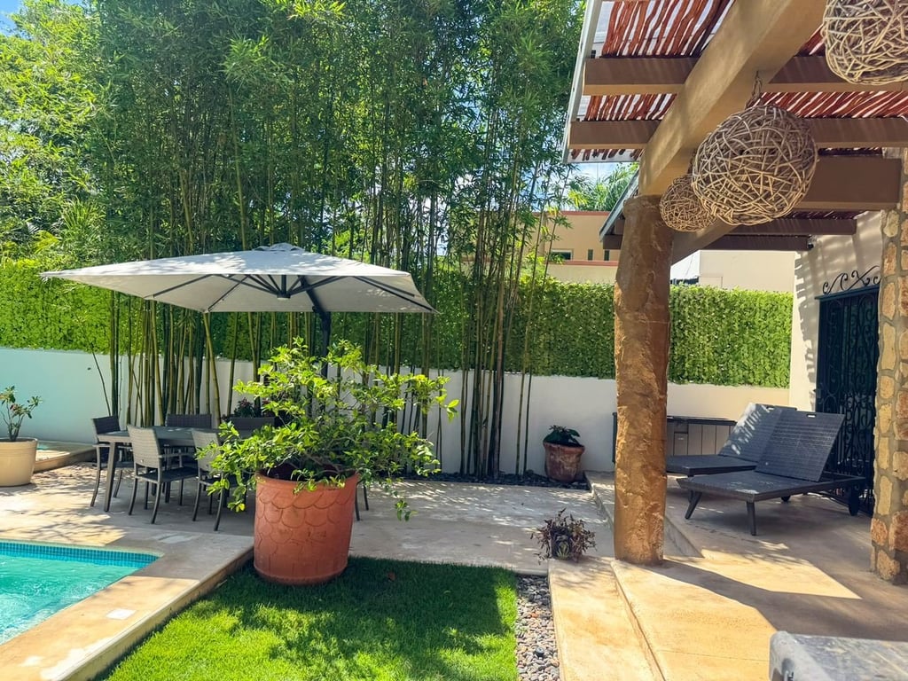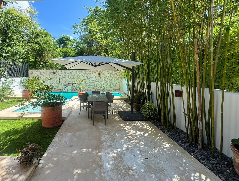 Perhaps most coveted is the private outdoor sanctuary awaiting just beyond the living areas. A crystalline pool serves as the centerpiece of the lush backyard, its inviting waters framed by mature bamboo groves that provide natural privacy screening while adding a tropical ambiance. The covered terrace features a rustic pergola with organic wooden elements, creating the perfect setting for al fresco dining as Caribbean breezes drift through the space. Additional lounging areas scattered throughout the garden offer multiple zones for relaxation and entertainment.