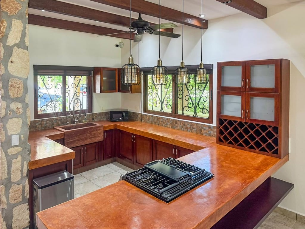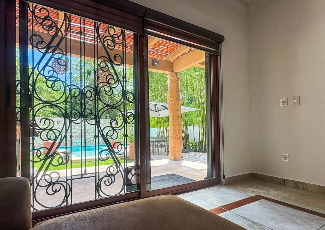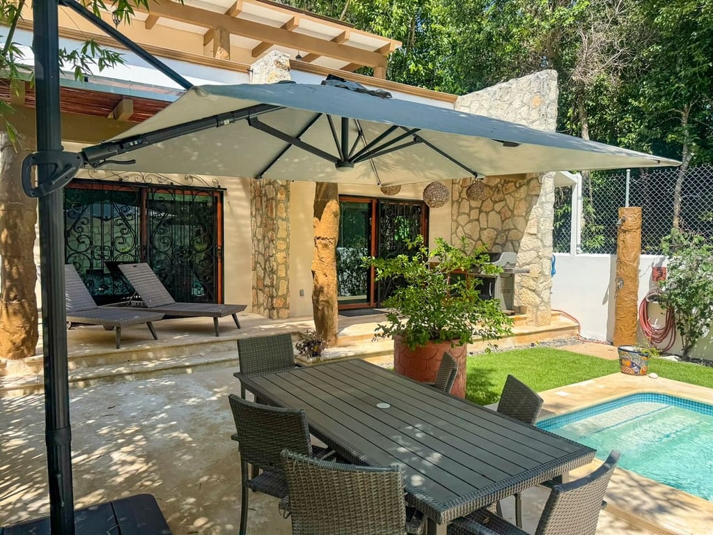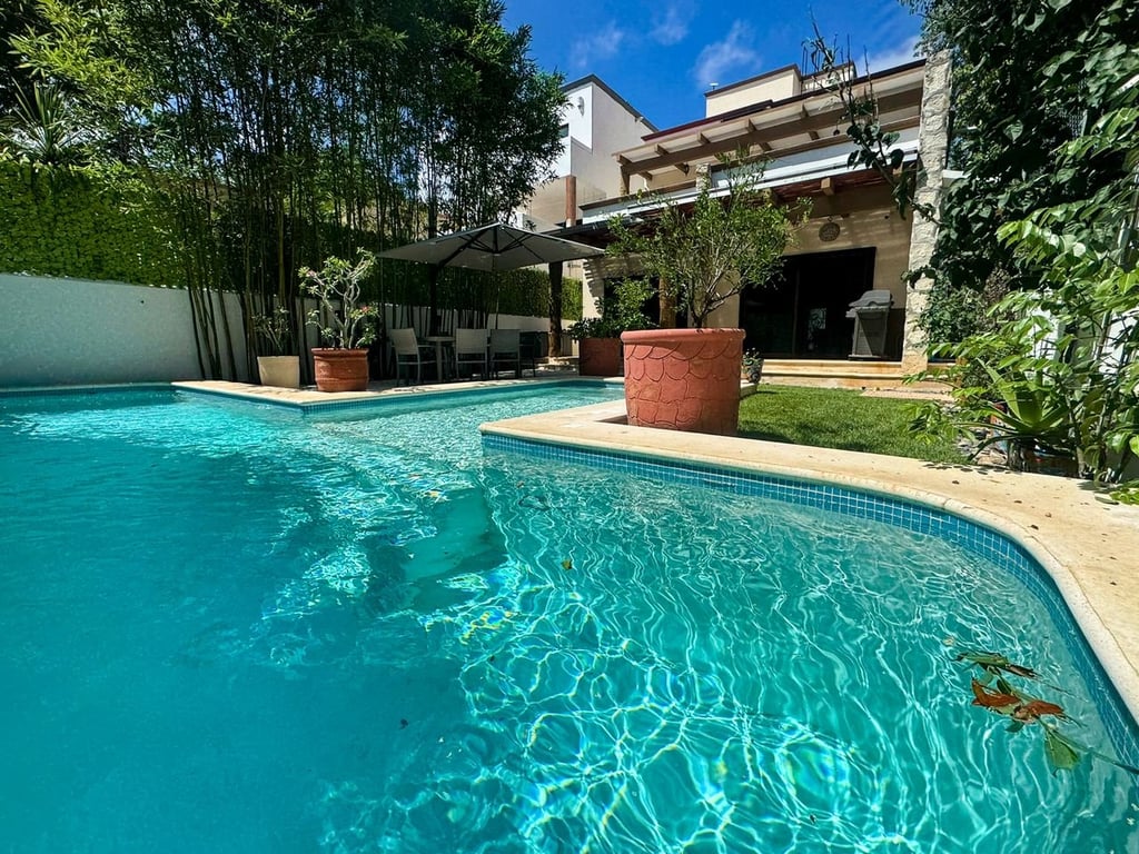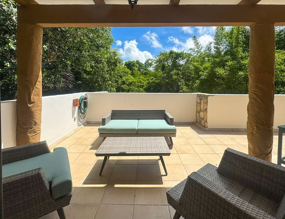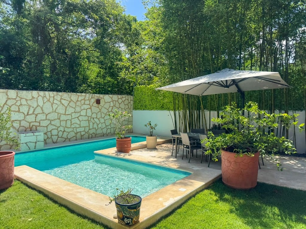 Perhaps most coveted is the private outdoor sanctuary awaiting just beyond the living areas. A crystalline pool serves as the centerpiece of the lush backyard, its inviting waters framed by mature bamboo groves that provide natural privacy screening while adding a tropical ambiance. The covered terrace features a rustic pergola with organic wooden elements, creating the perfect setting for al fresco dining as Caribbean breezes drift through the space. Additional lounging areas scattered throughout the garden offer multiple zones for relaxation and entertainment.