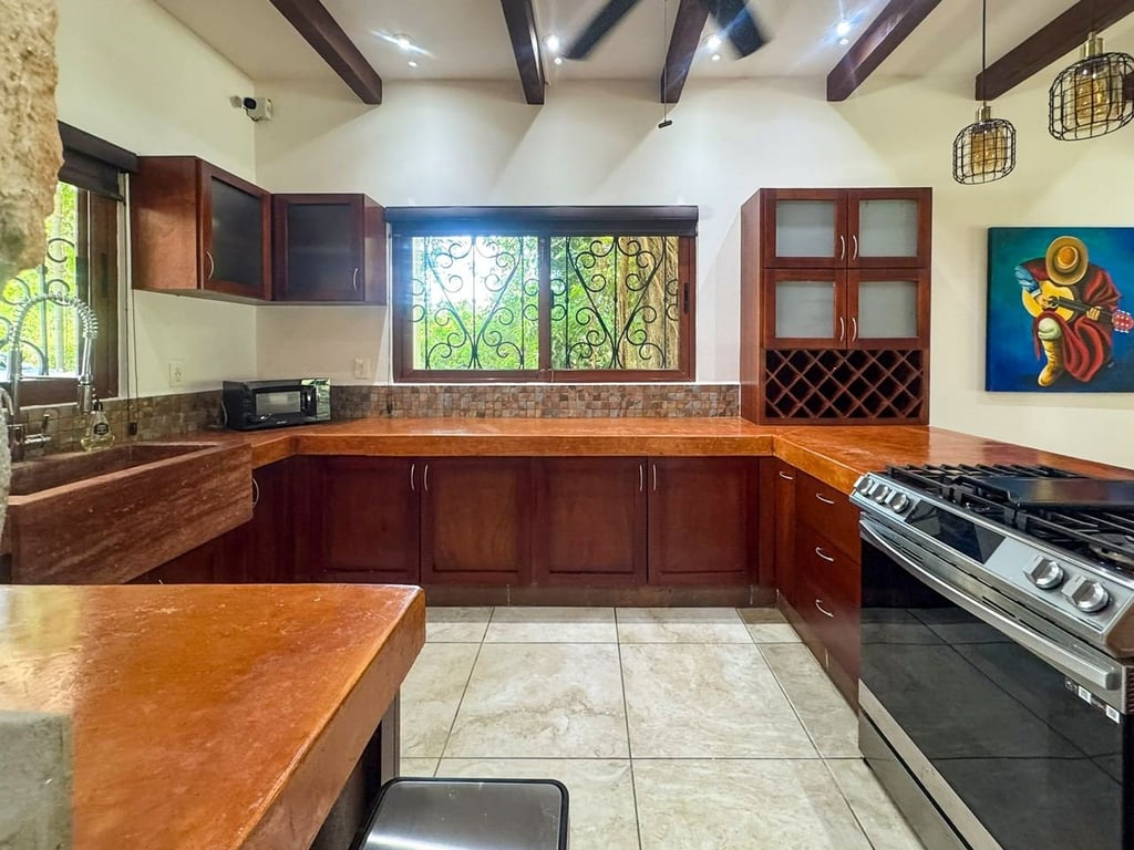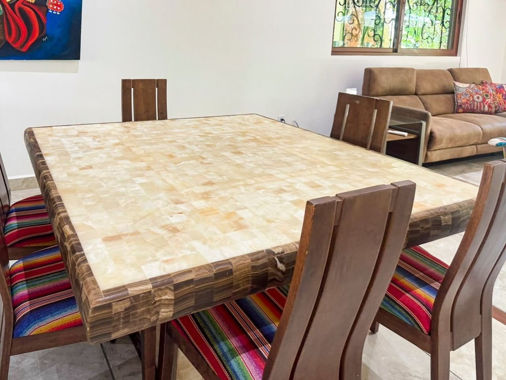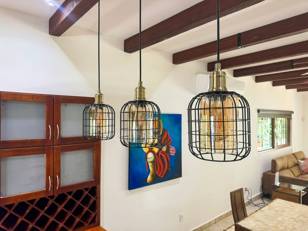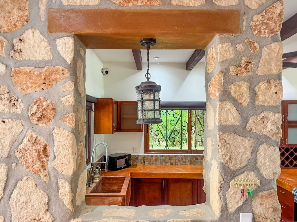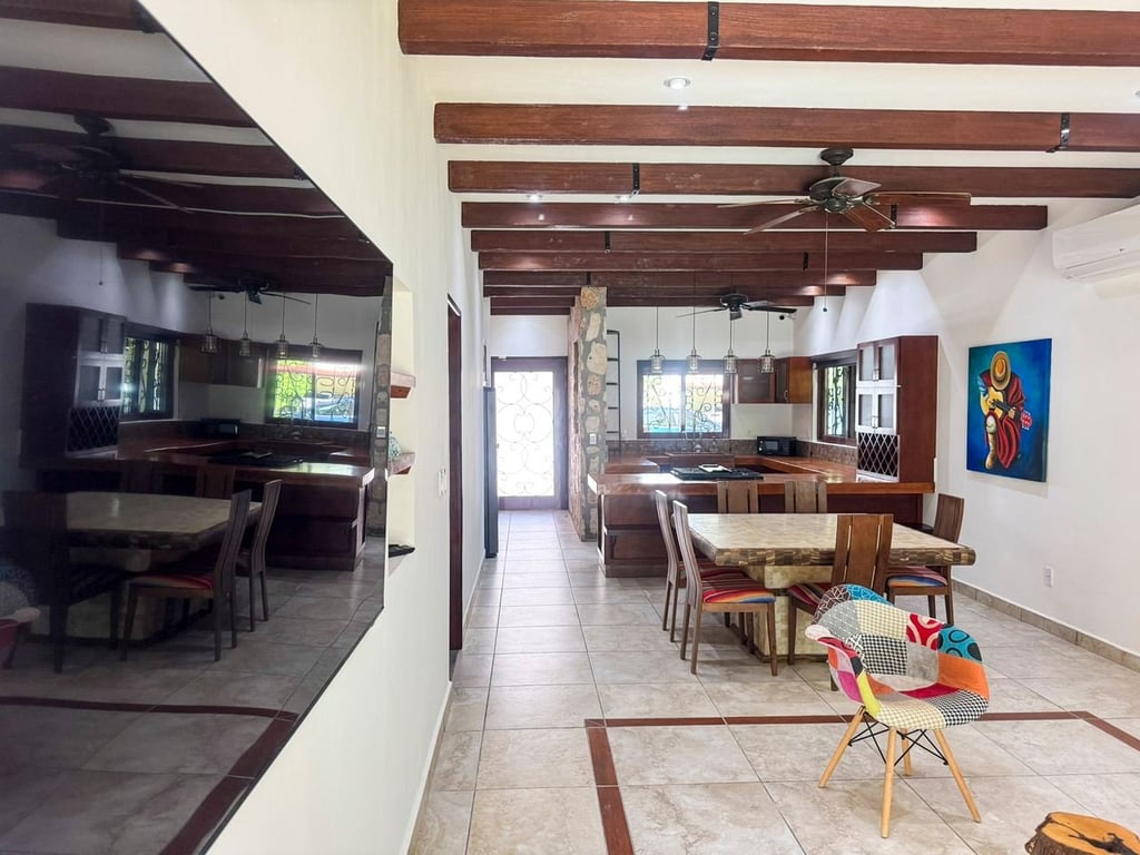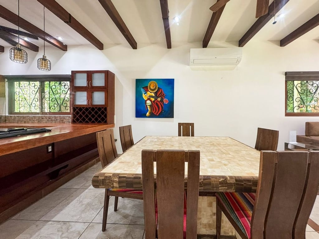 Inside, soaring ceilings adorned with rich wooden beams immediately capture attention, their warm tones complemented by thoughtfully curated Mexican artwork that adds vibrant splashes of color throughout the living spaces. The open-concept design allows natural light to flood through ornate iron-framed windows, creating an ever-changing interplay of light and shadow that brings each room to life. The main living area flows effortlessly into a formal dining space, perfect for intimate gatherings or memorable celebrations with loved ones.