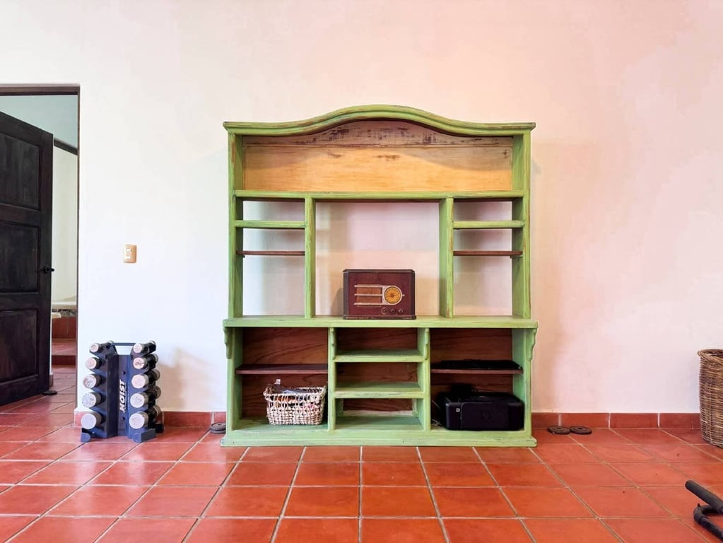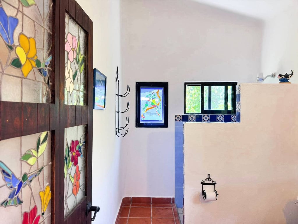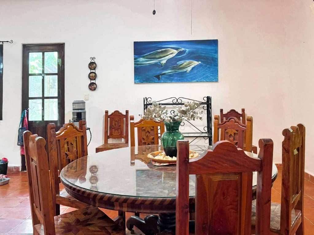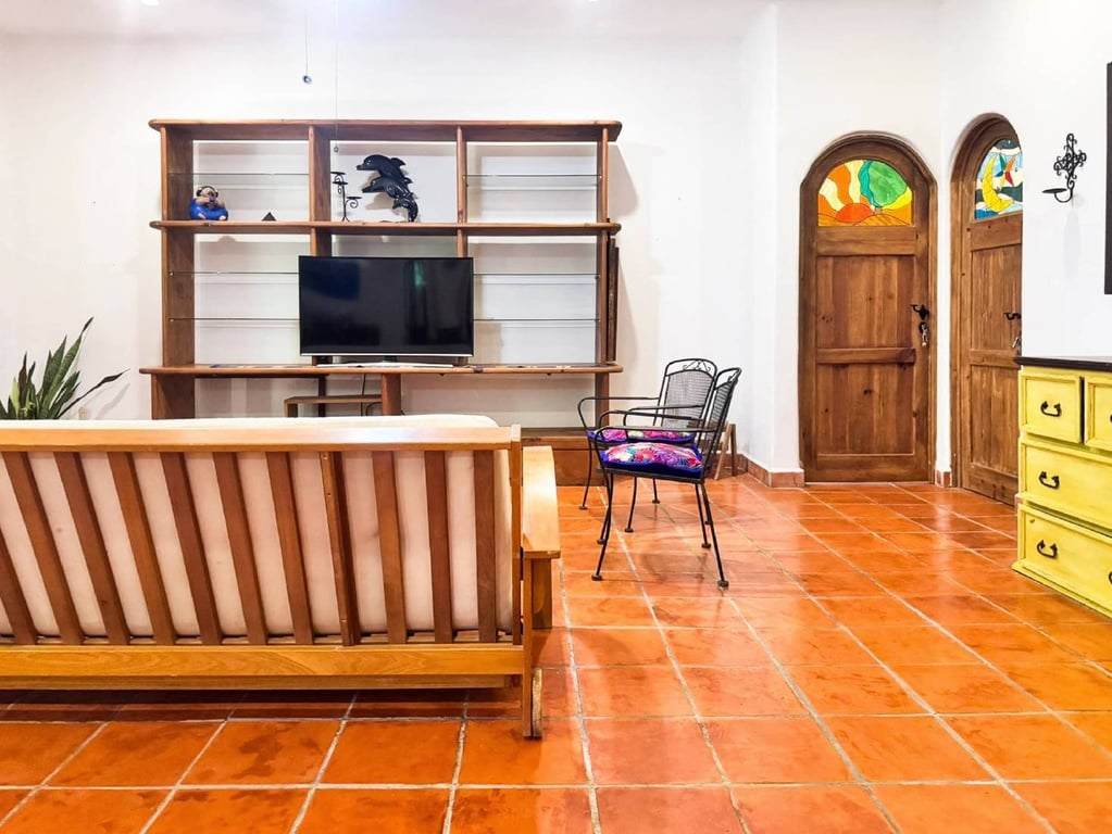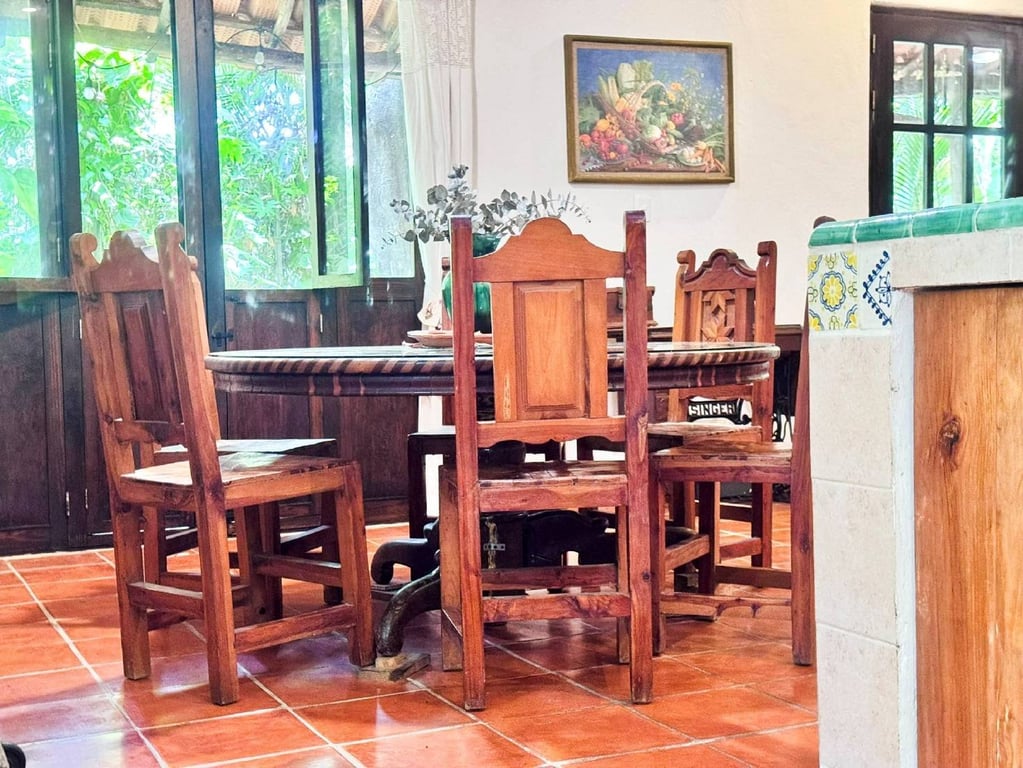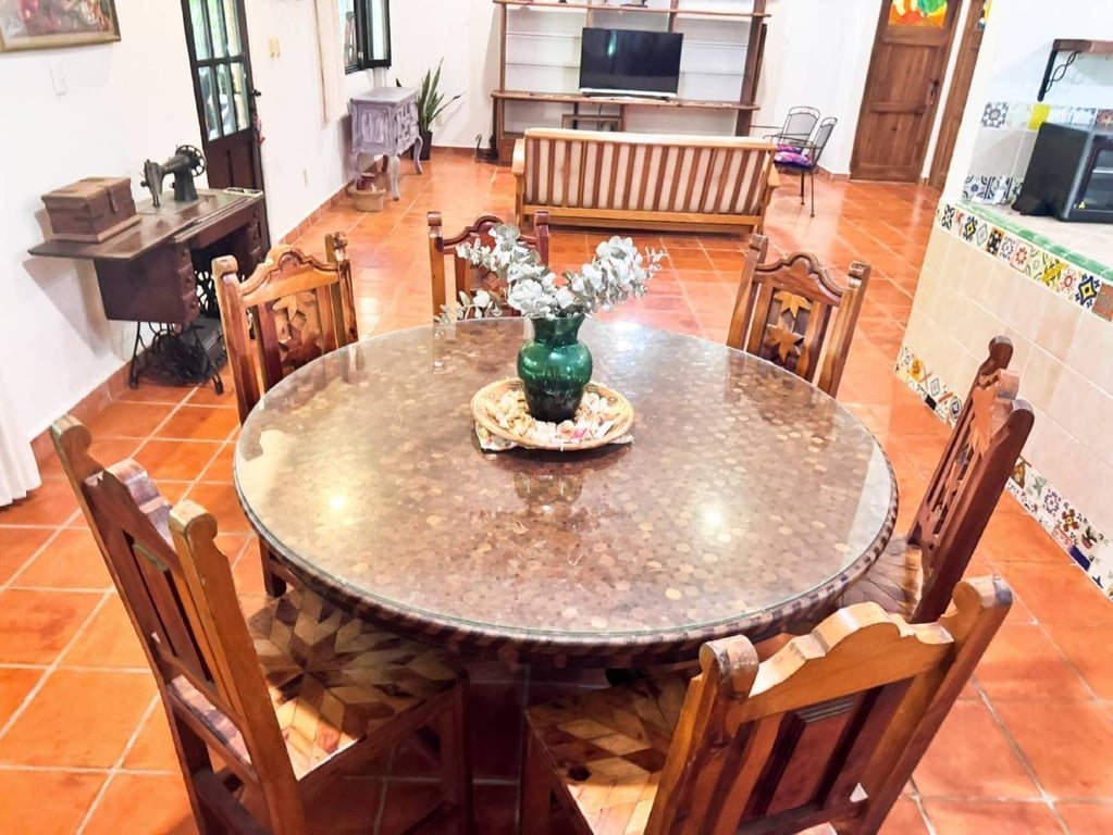 The property immediately charms with its warm terracotta walls and classic tile roofing that speaks to Mexico's architectural heritage. Inside, the home celebrates traditional craftsmanship with hand-carved wooden furnishings, vibrant Talavera pottery, and colorful tile work that creates visual interest throughout. The round glass dining table anchors the main living area, while custom built-in shelving and authentic Mexican decorative elements add character to every corner.