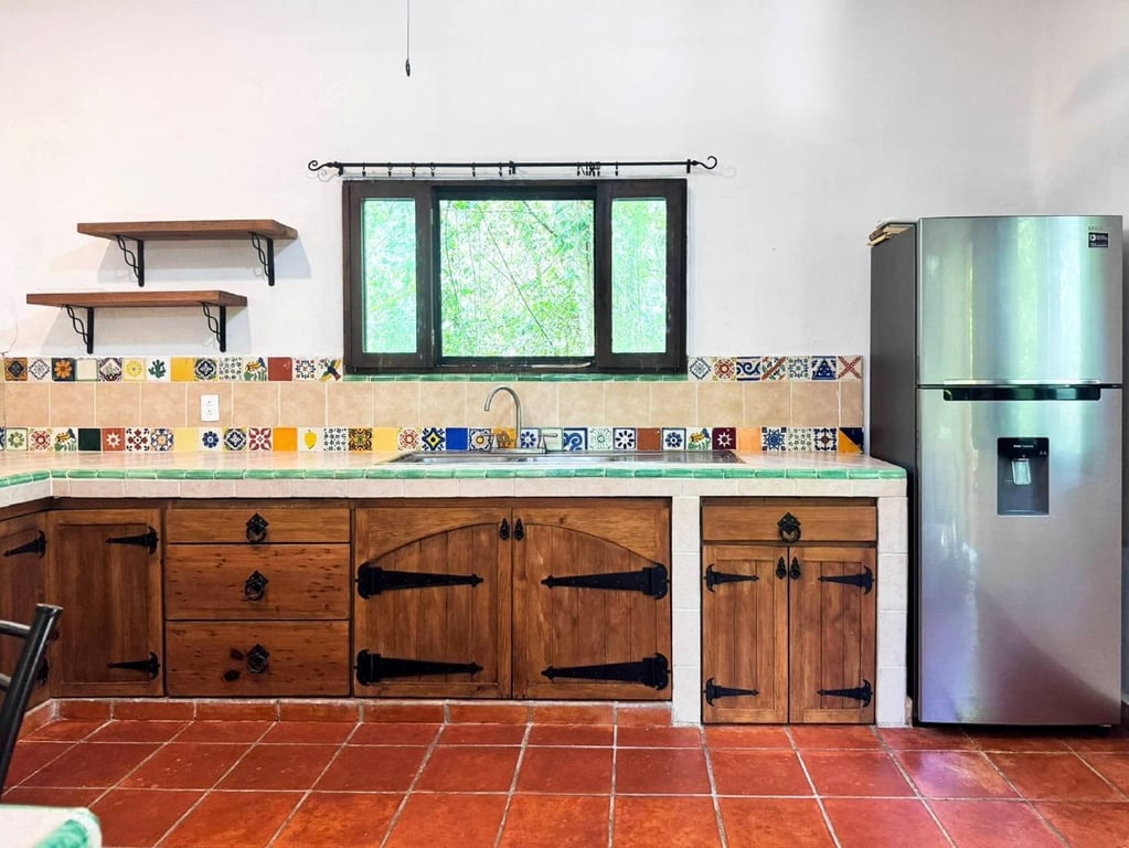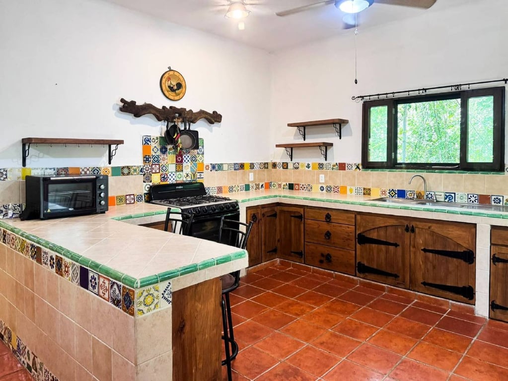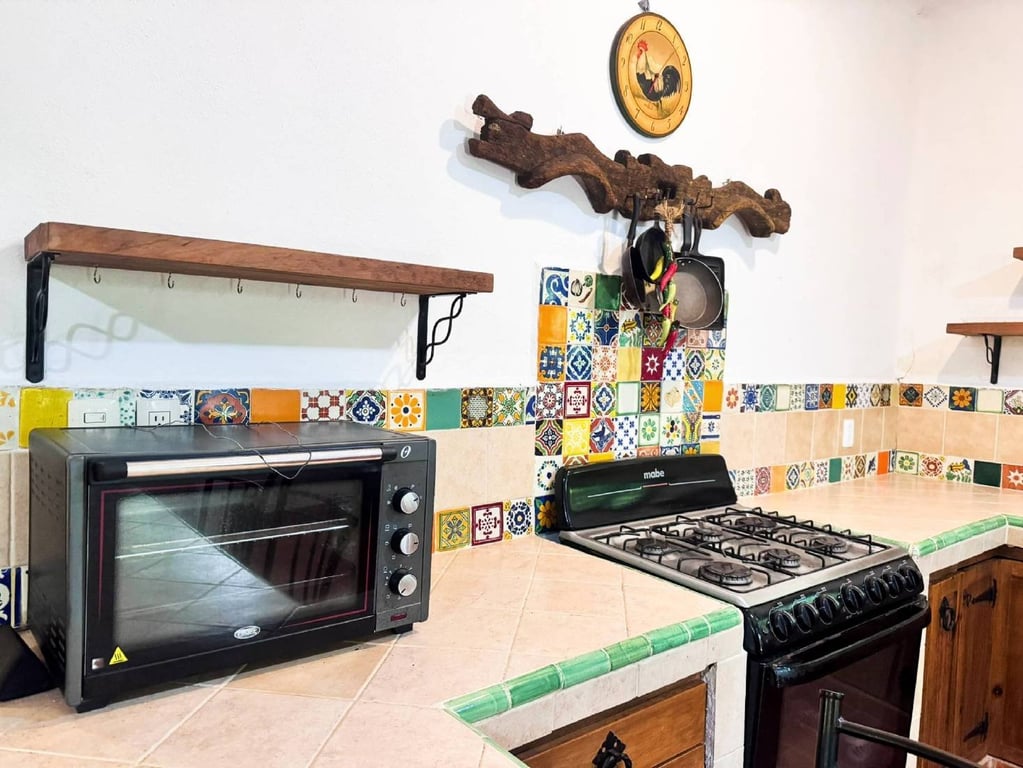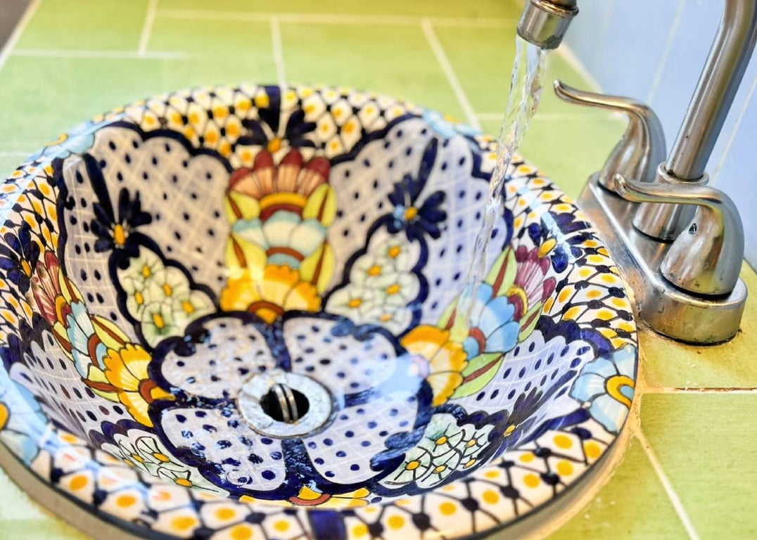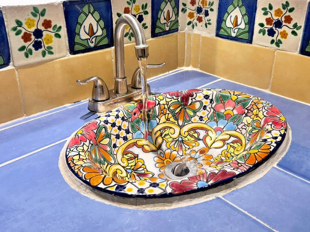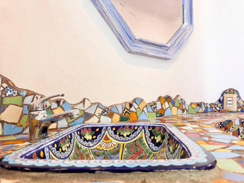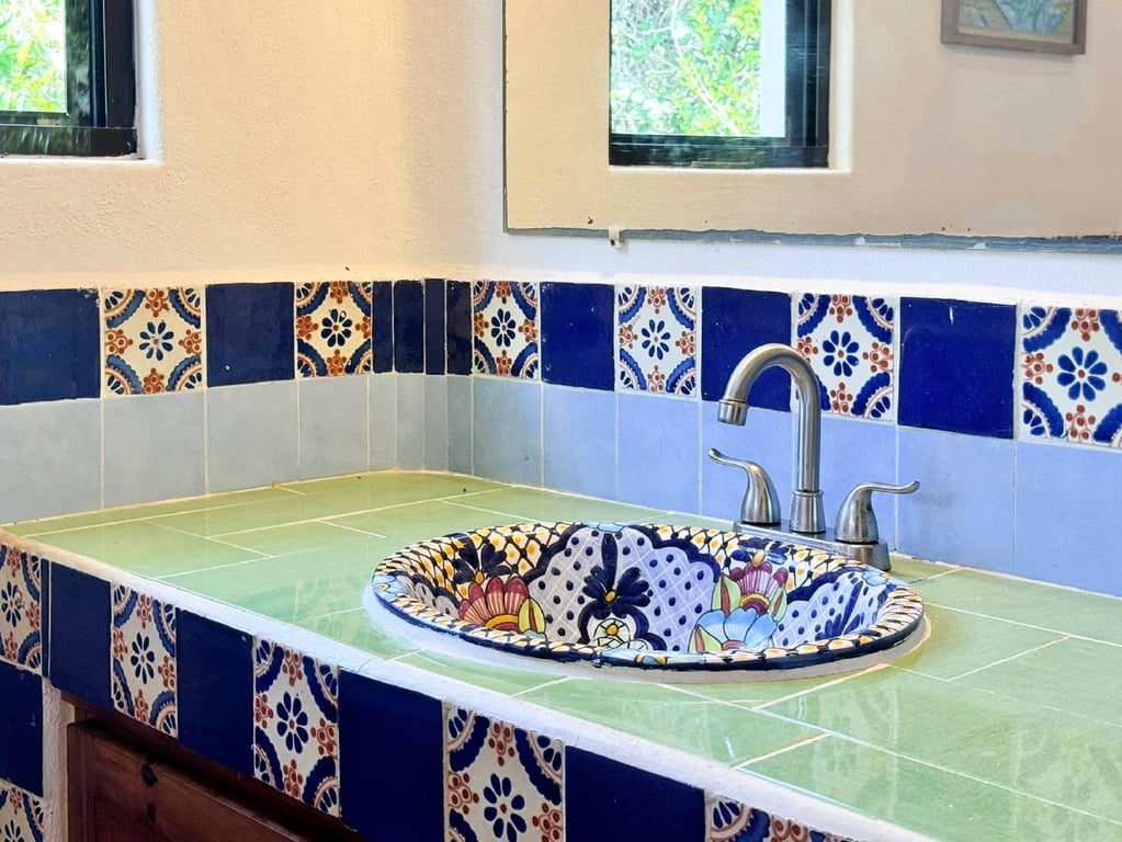 The kitchen showcases beautiful handcrafted details, from the colorful mosaic tile backsplash to the unique Puebla-style sink basin adorned with traditional Mexican patterns. Tile countertops with green trim add a playful touch while maintaining the home's authentic aesthetic.