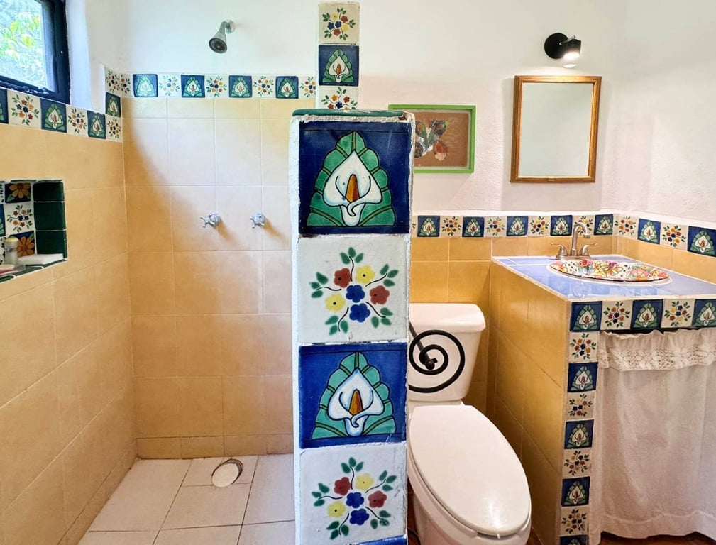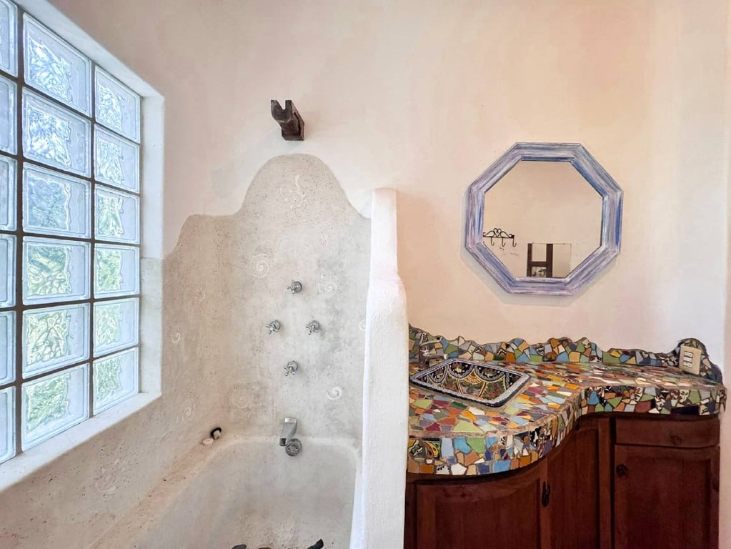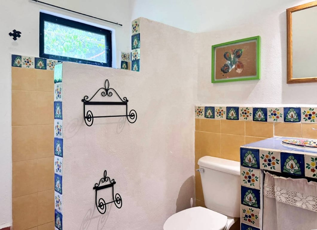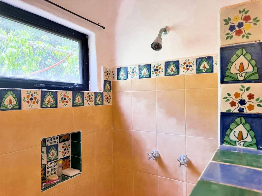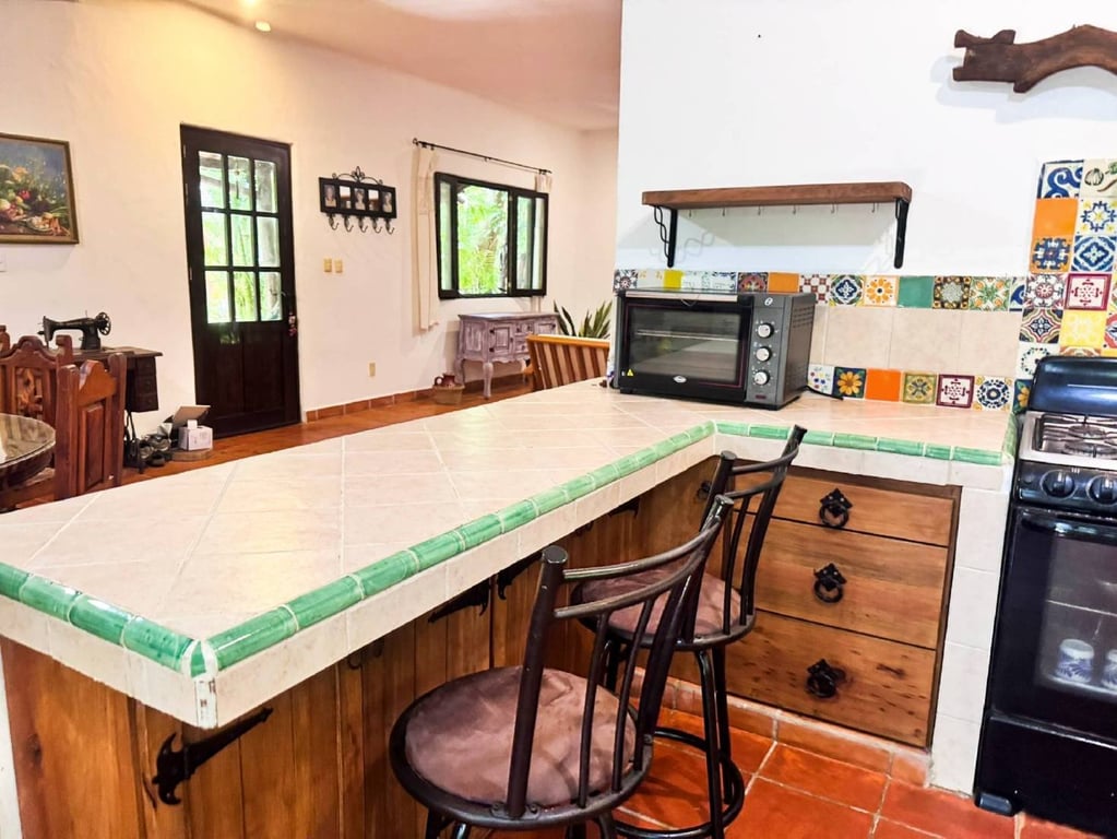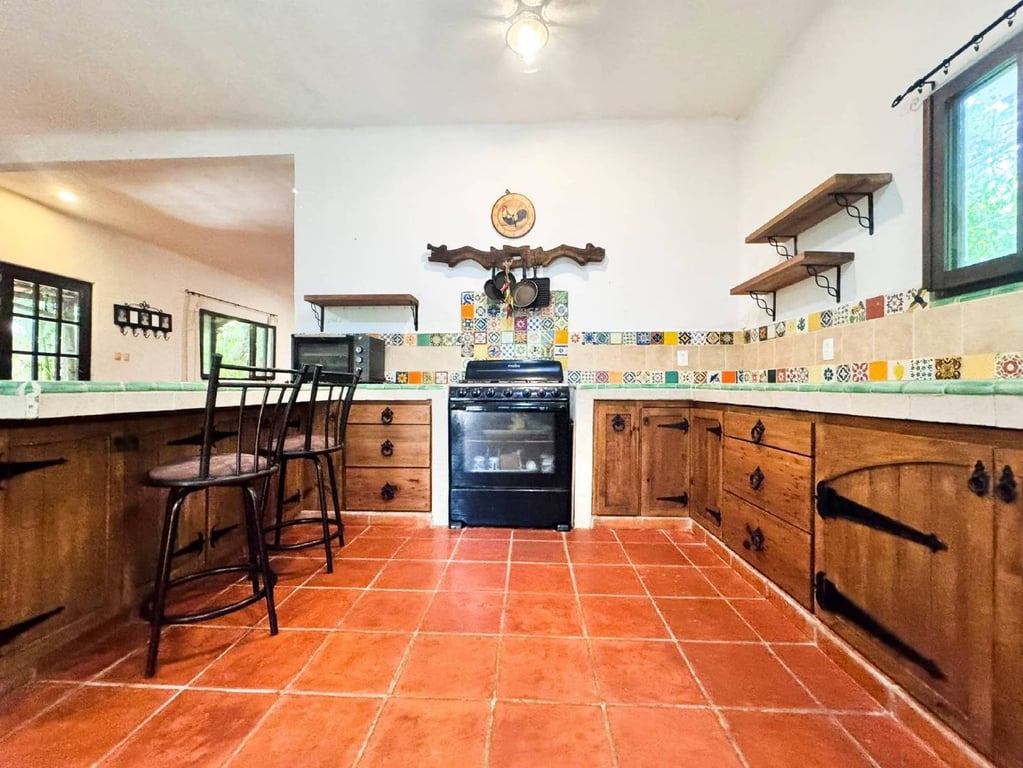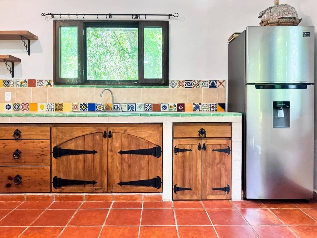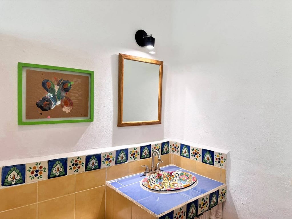 The kitchen showcases beautiful handcrafted details, from the colorful mosaic tile backsplash to the unique Puebla-style sink basin adorned with traditional Mexican patterns. Tile countertops with green trim add a playful touch while maintaining the home's authentic aesthetic.
