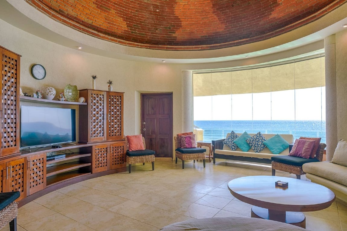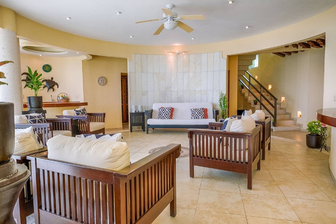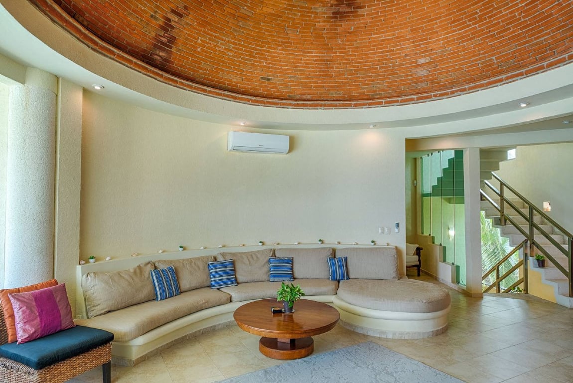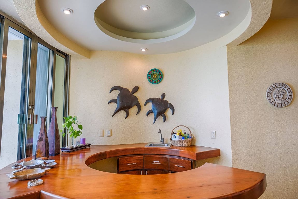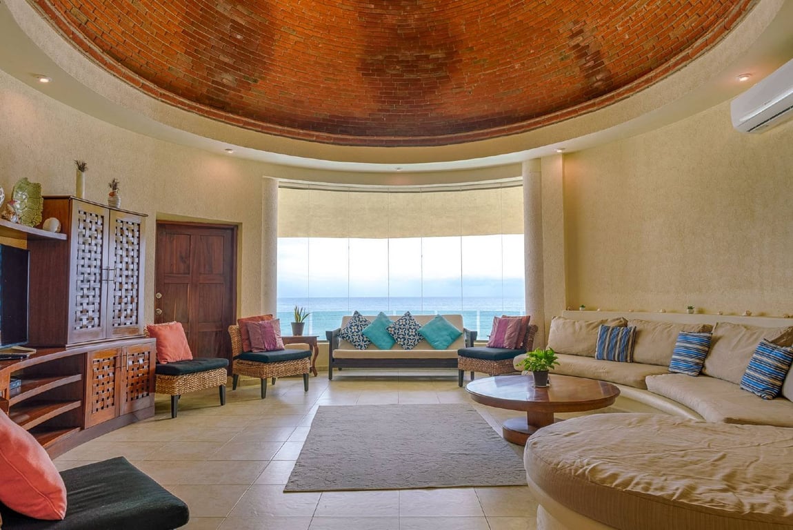 The villa's design honors traditional Mexican architecture while embracing contemporary coastal living. A handcrafted brick cupula crowns the second-story entertainment room, creating visual interest and natural ventilation that speaks to generations of tropical building wisdom. Throughout the 4,300 square feet of interior space, warm textures and thoughtful details create spaces that feel both refined and welcoming.